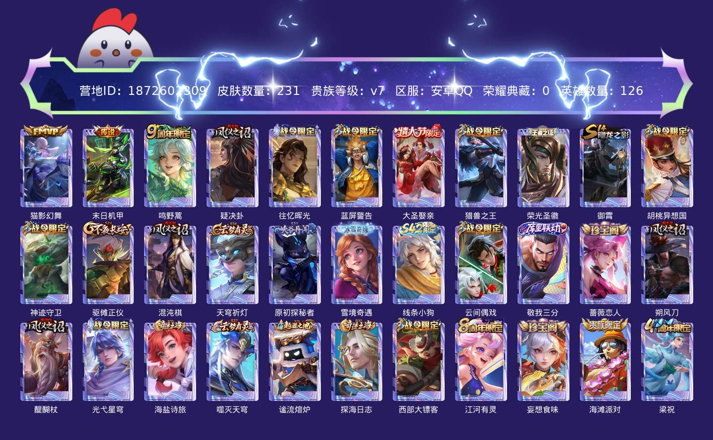贵族等级:v7皮肤数:231情人节限定1 传说品质3 生肖限定1 英雄数:126