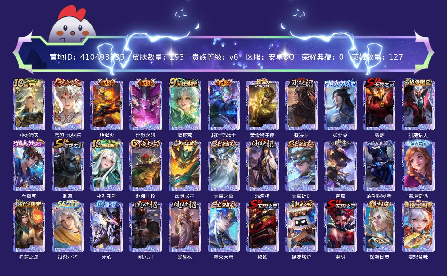 贵族等级:v6皮肤数:193情人节限定2 传说品质7 生肖限定3 英雄数:127