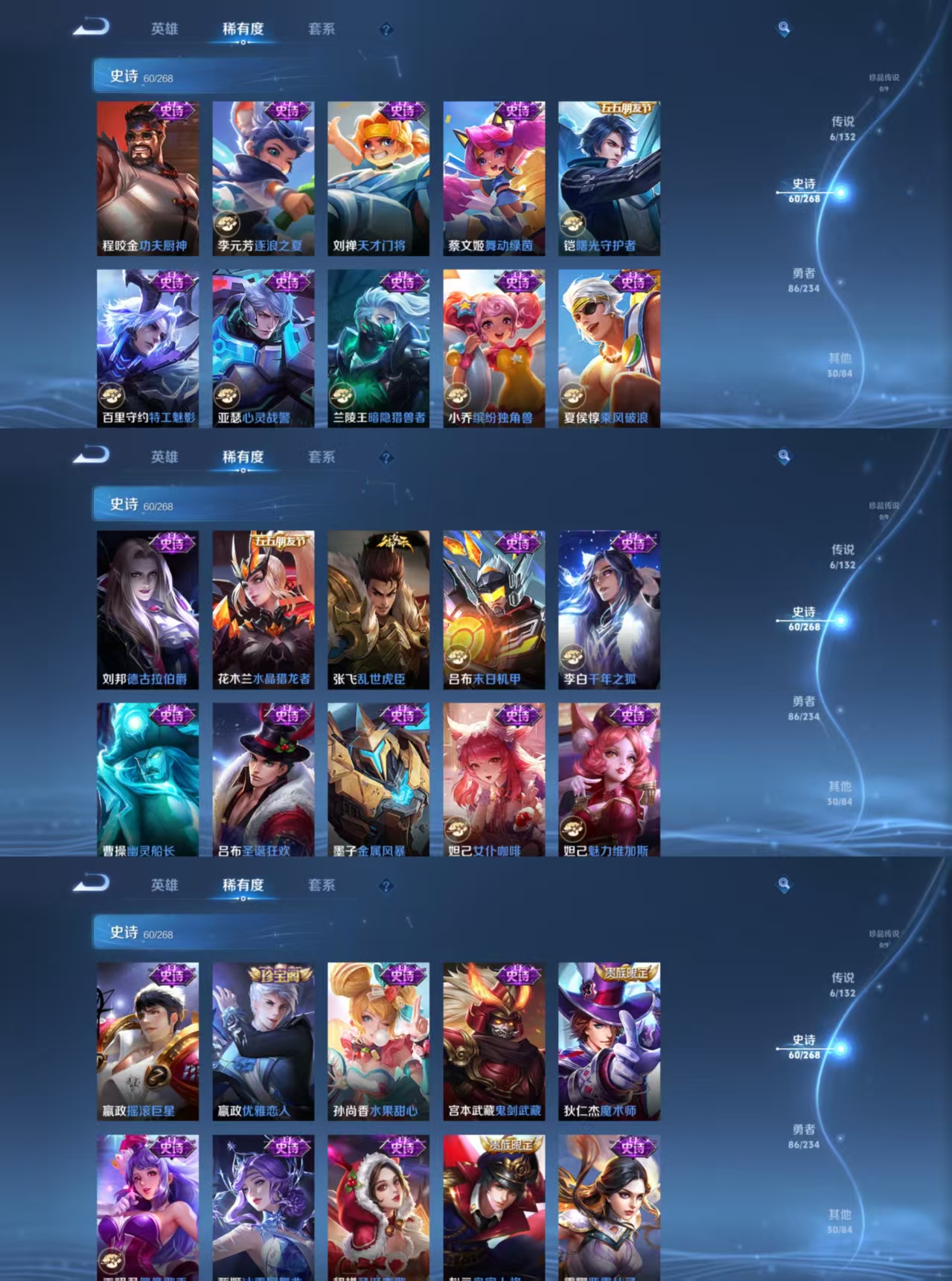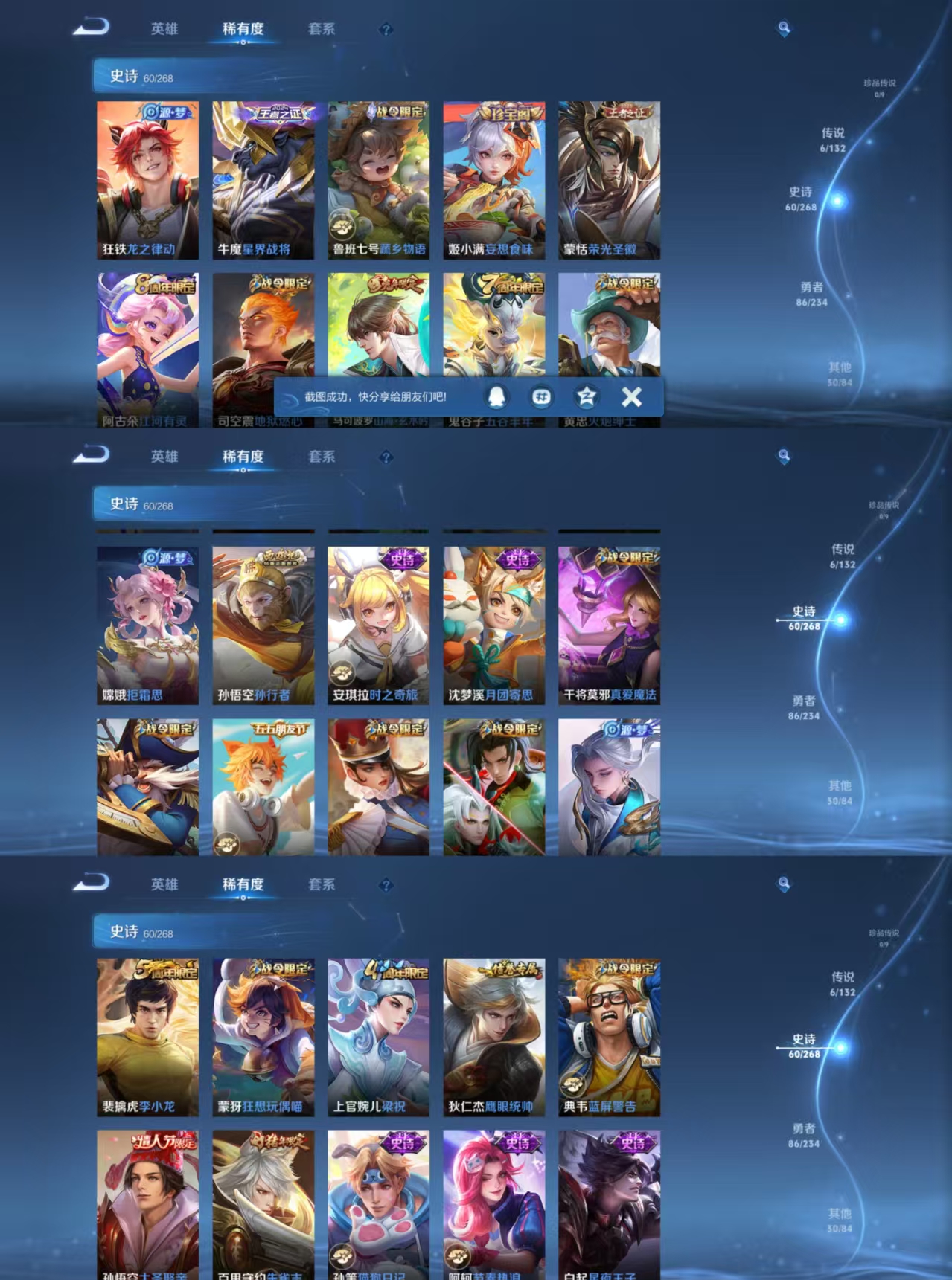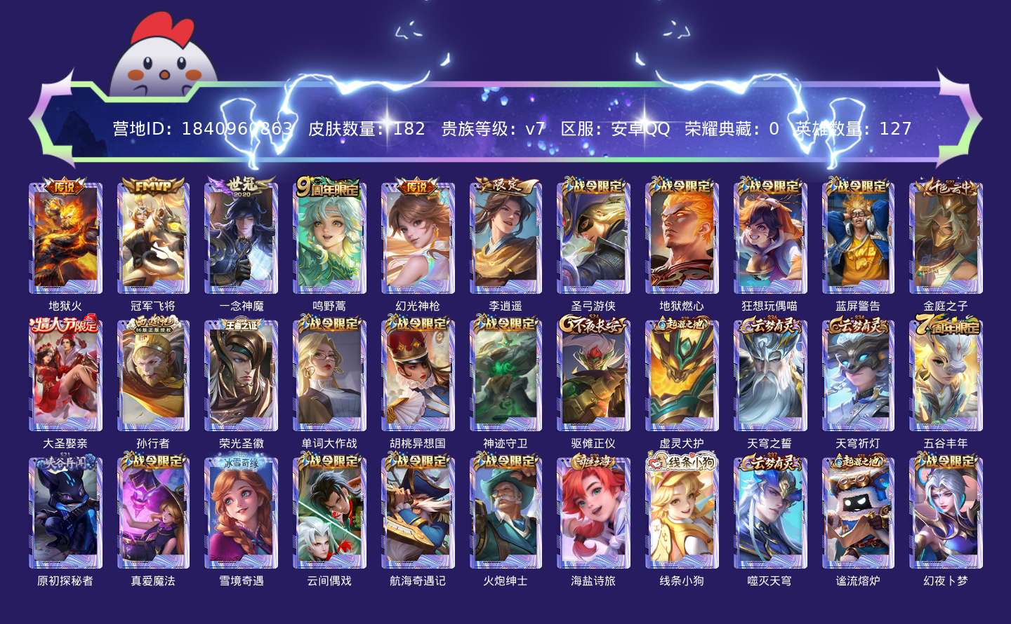 贵族等级:v7皮肤数:182情人节限定1 传说品质6 生肖限定2 英雄数:127