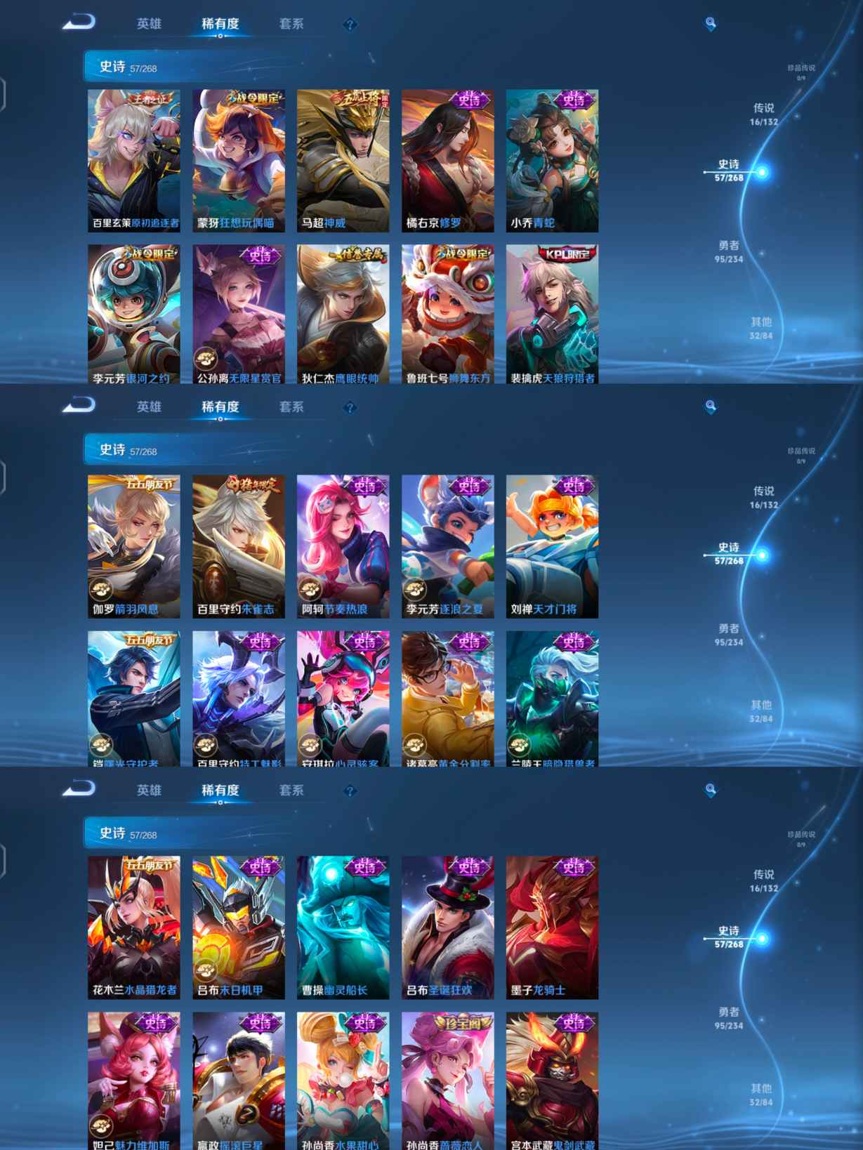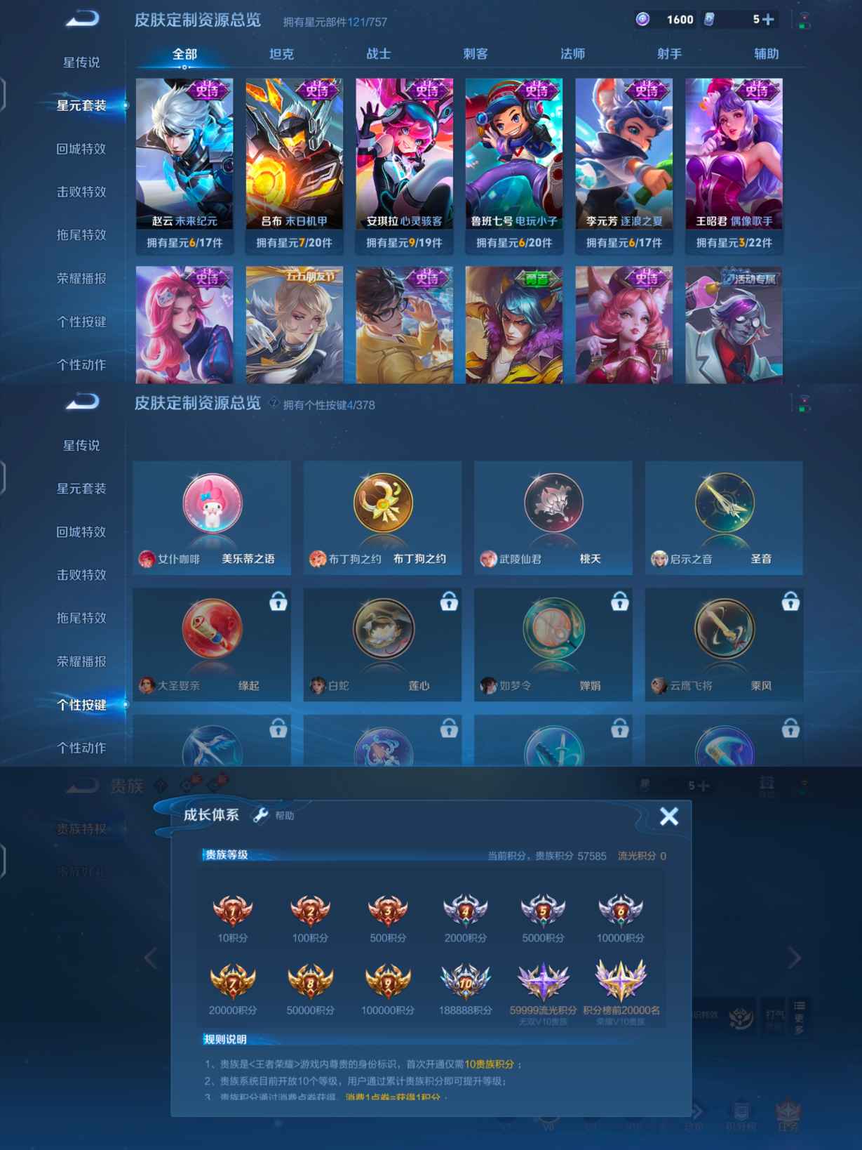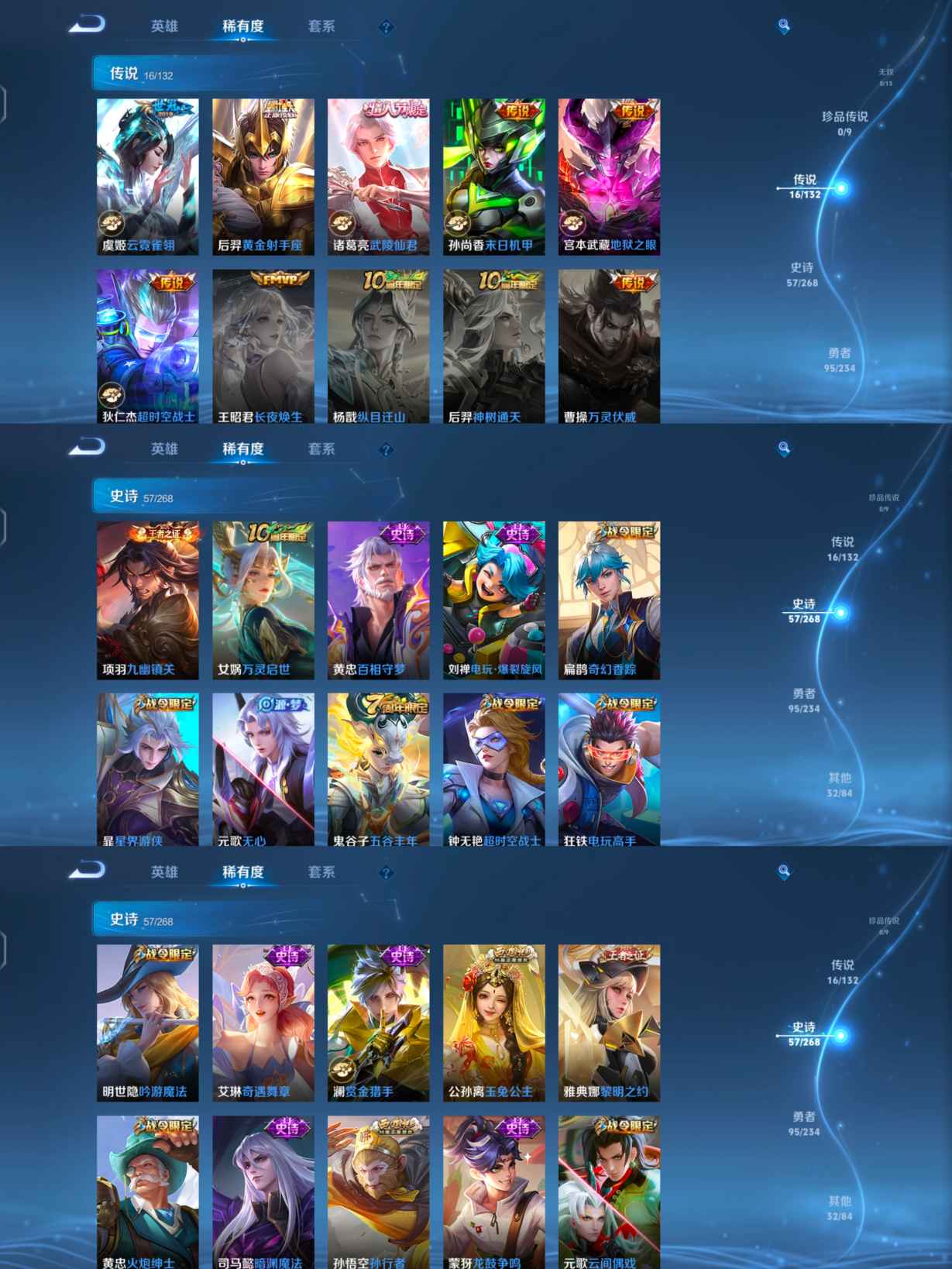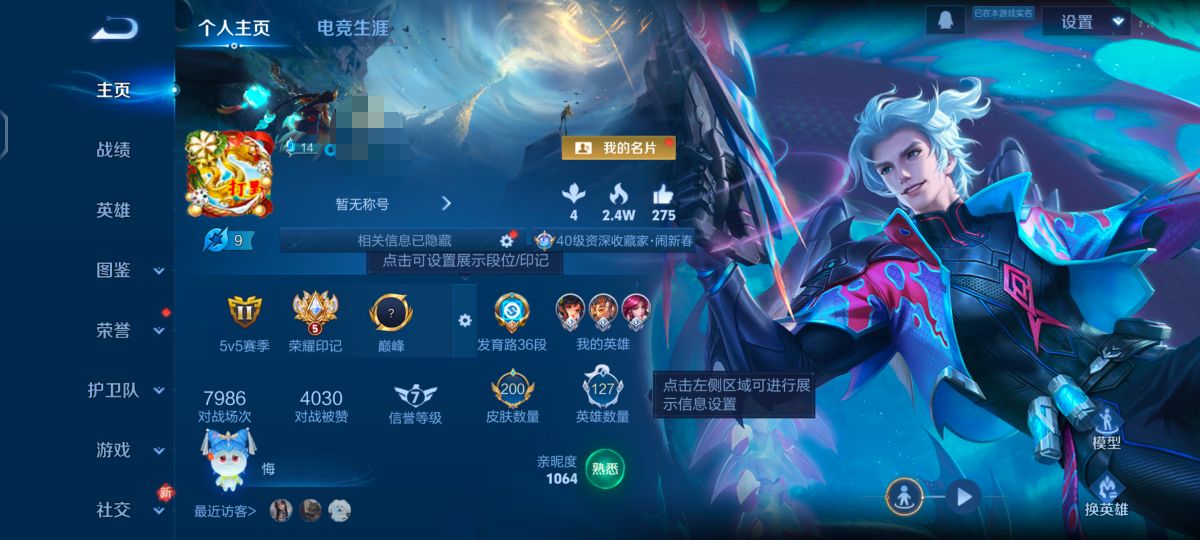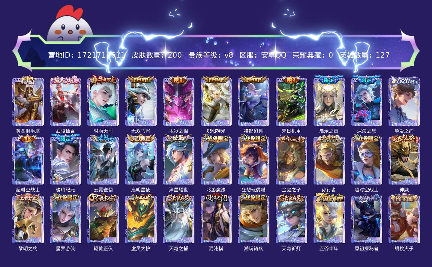 贵族等级:v8皮肤数:200传说品质16 情人节限定1 生肖限定2 英雄数:127