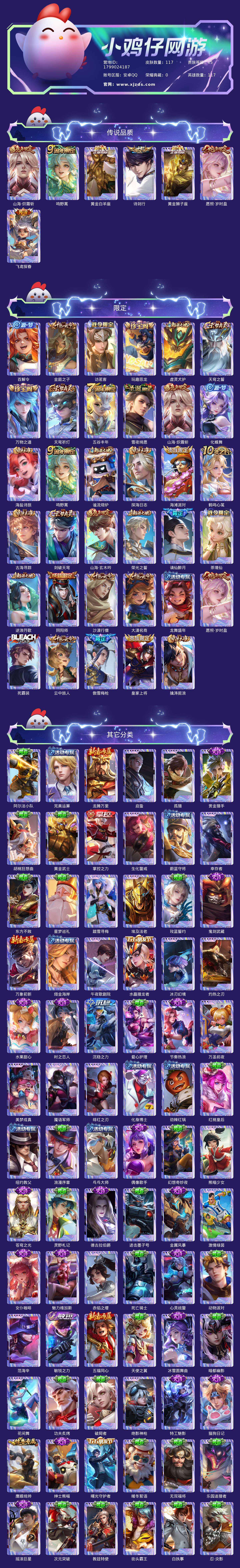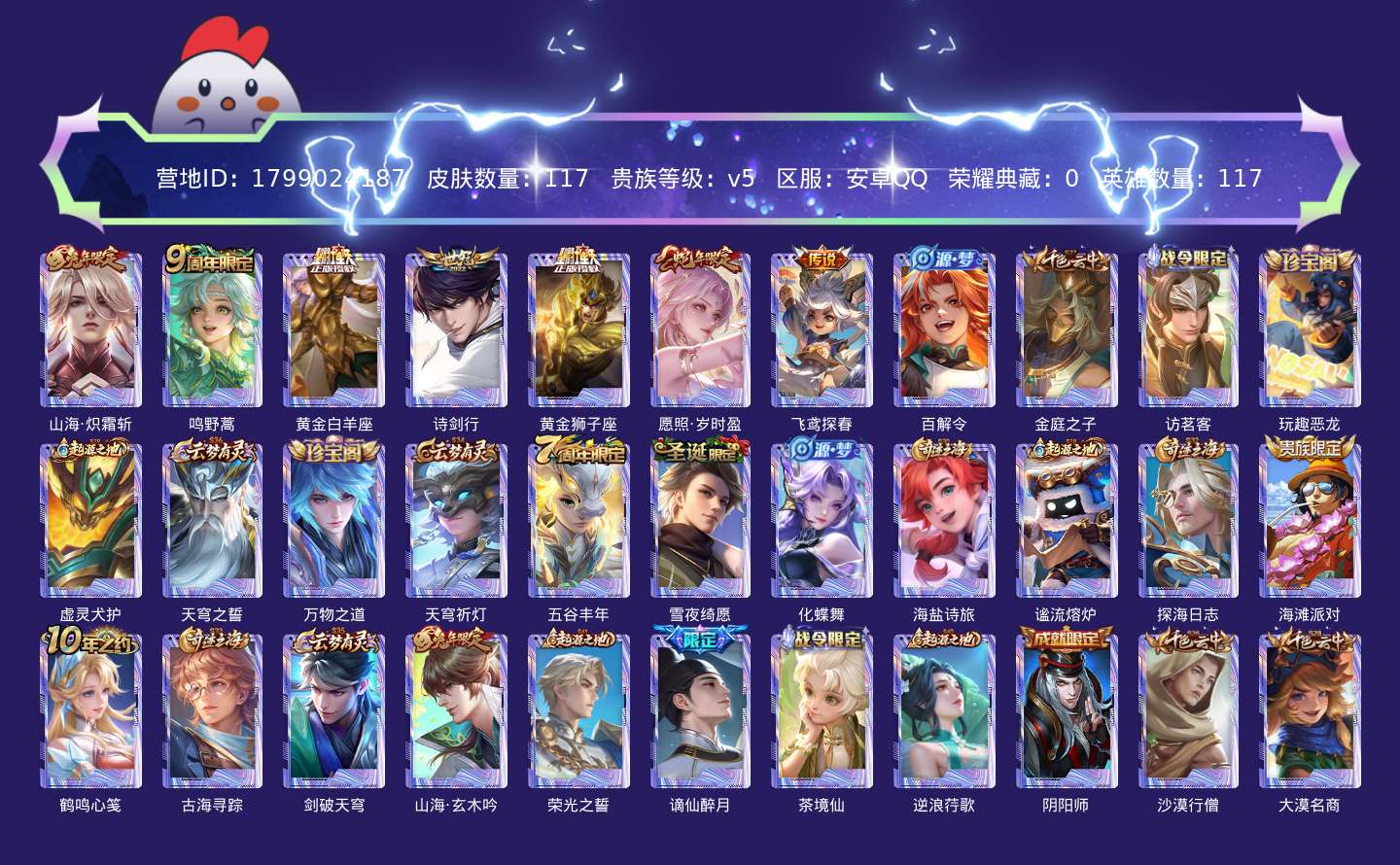 贵族等级:v5皮肤数:117传说品质7 生肖限定3 英雄数:117