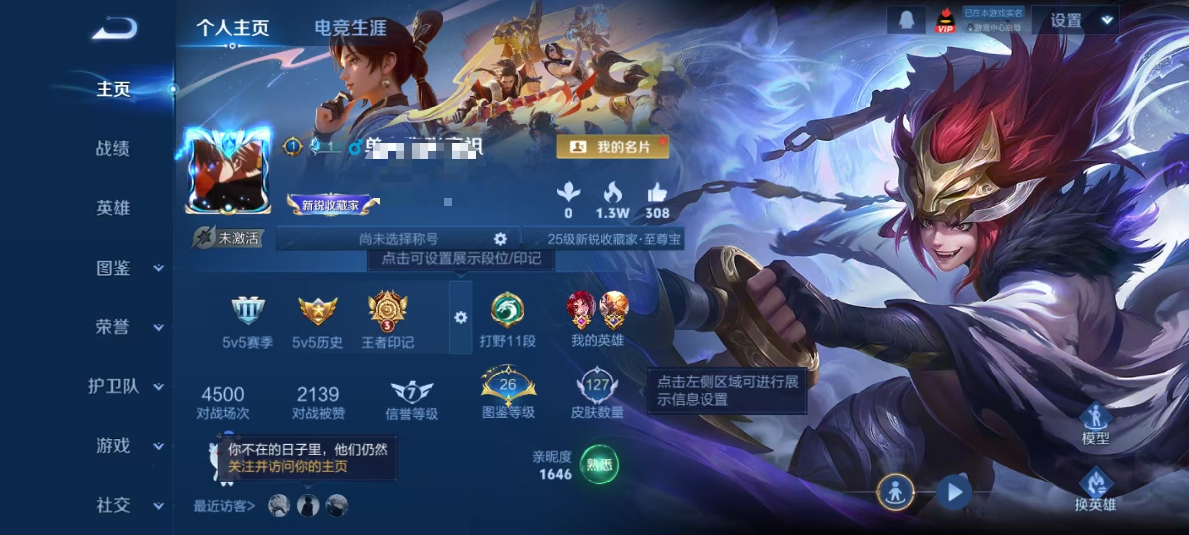 贵族等级:v5皮肤数:127情人节限定1 传说品质3 生肖限定1 英雄数:124
