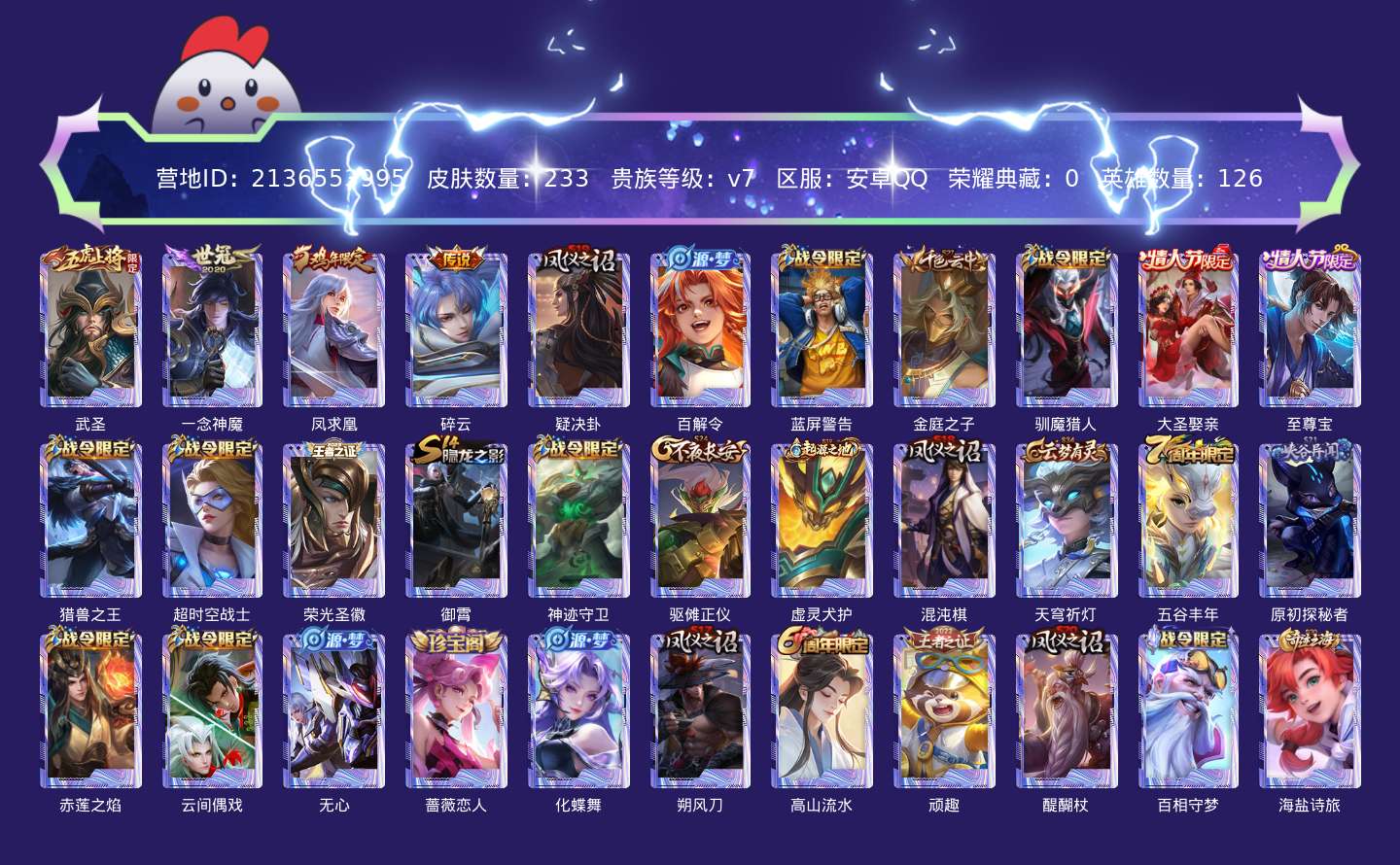 贵族等级:v7皮肤数:237传说品质4 情人节限定2 生肖限定2 英雄数:127