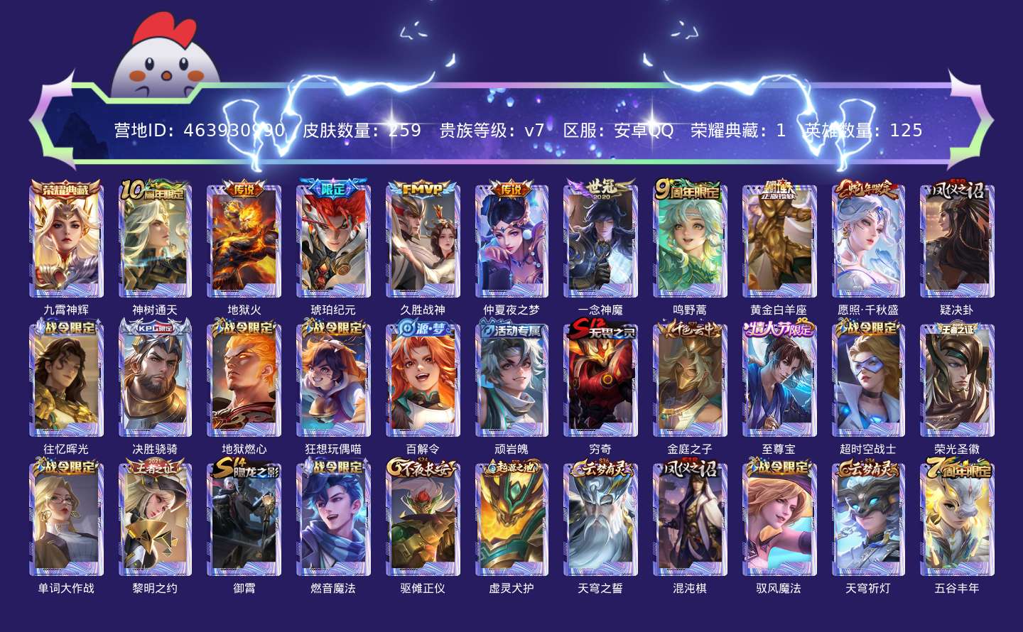 贵族等级:v7皮肤数:260传说品质9 情人节限定1 荣耀典藏1 生肖限定1 英雄数:125