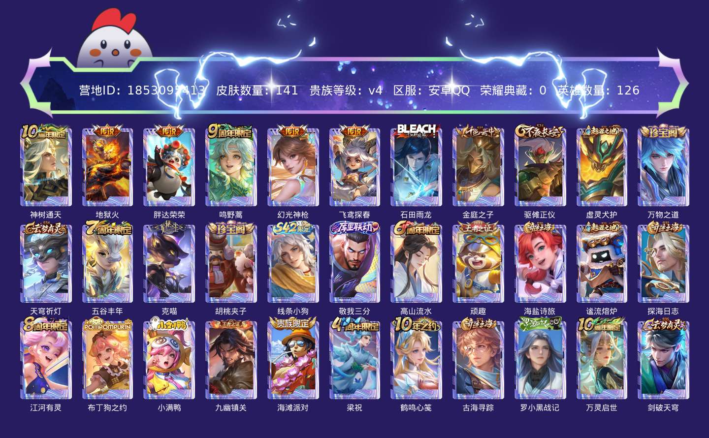 贵族等级:v4皮肤数:141传说品质6 英雄数:126