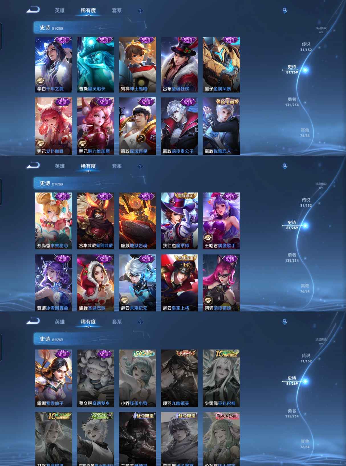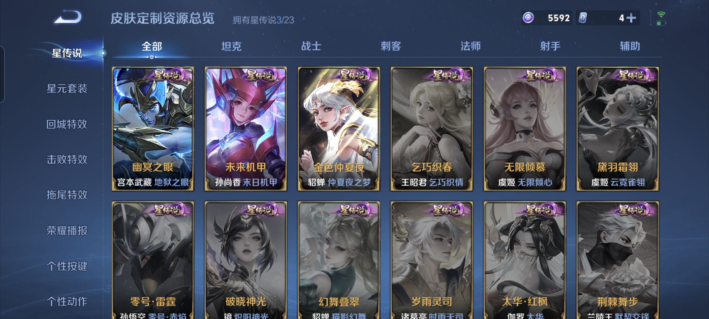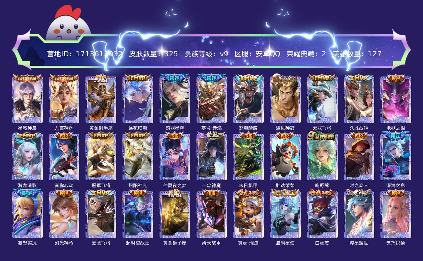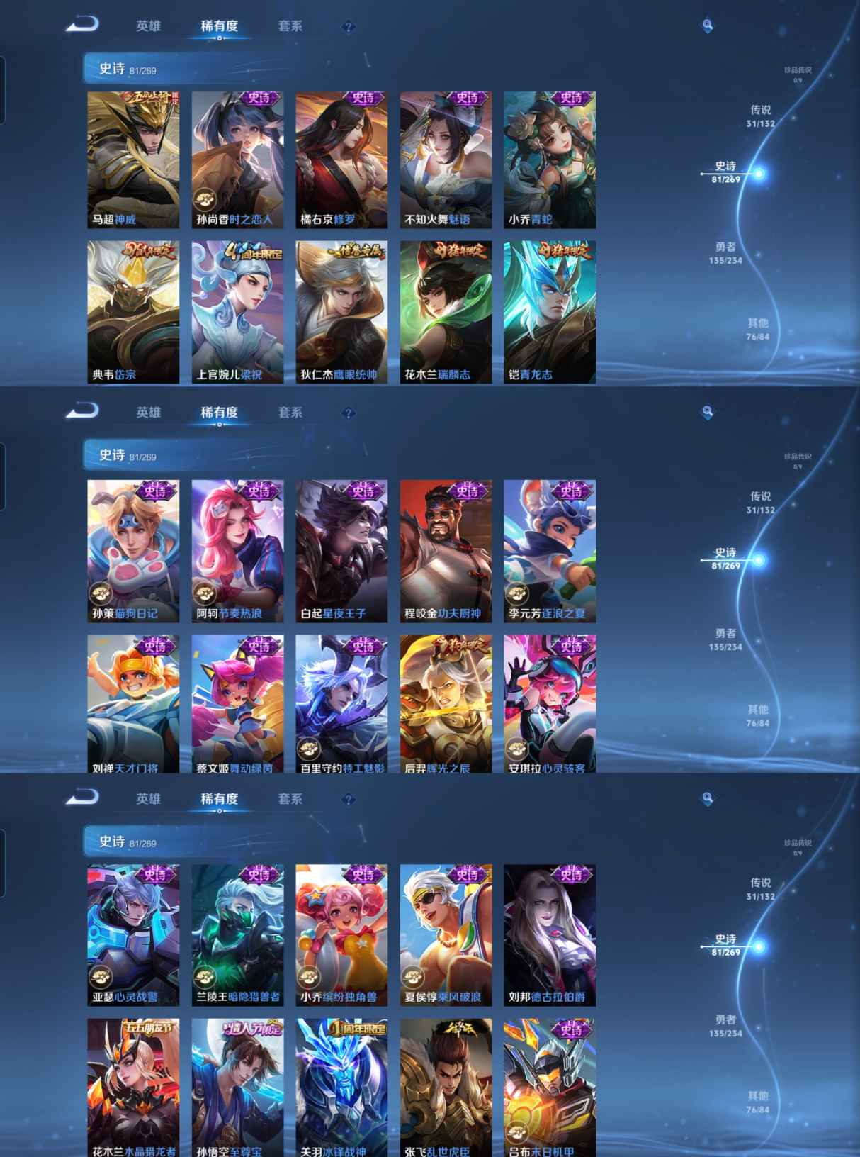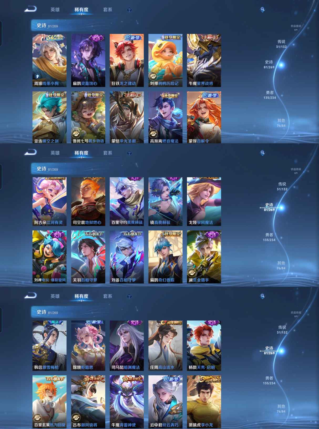 传说品质_后羿_黄金射手座传说品质_澜_逐花归海传说品质_诸葛亮_鹤羽星尊传说品质_孙悟空_零号·赤焰传说品质_吕布_怒海麟威传说品质_吕布_遇见神鼓传说品质_马超_无双飞将传说品质_干将莫邪_久胜战神传说品质_宫本武藏_地狱之眼传说品质_西施_游龙清影传说品质_周瑜_音你心动传说品质_花木兰_冠军飞将传说品质_镜_炽阳神光传说品质_貂蝉_仲夏夜之梦传说品质_李信_一念神魔传说品质_孙尚香_末日机甲传说品质_梦奇_胖达荣荣传说品质_桑启_鸣野蒿传说品质_刘备_时之恋人传说品质_马可波罗_深海之息传说品质_马可波罗_妄想实况传说品质_云缨_幻光神枪传说品质_曜_云鹰飞将传说品质_狄仁杰_超时空战士传说品质_达摩_黄金狮子座传说品质_铠_绛天战甲传说品质_鲁班七号_寅虎·瑞焰传说品质_虞姬_启明星使传说品质_百里玄策_白虎志传说品质_赵云_淬星耀世传说品质_王昭君_乞巧织情