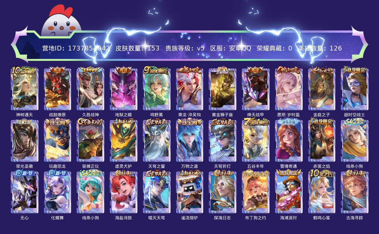 贵族等级:v5皮肤数:153传说品质9 生肖限定3 英雄数:126