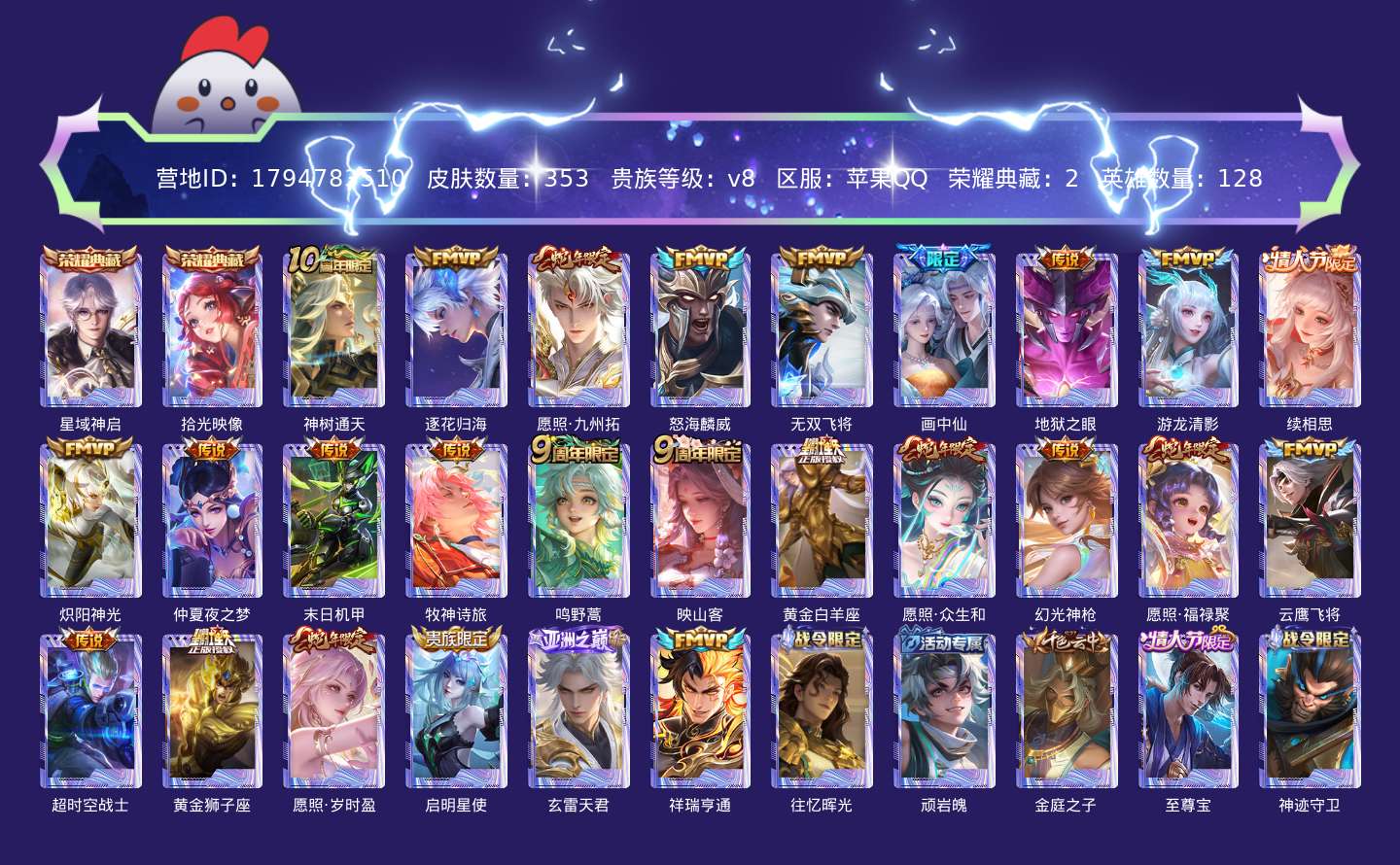 贵族等级:v8皮肤数:353传说品质26 生肖限定6 荣耀典藏2 情人节限定2 英雄数:128
