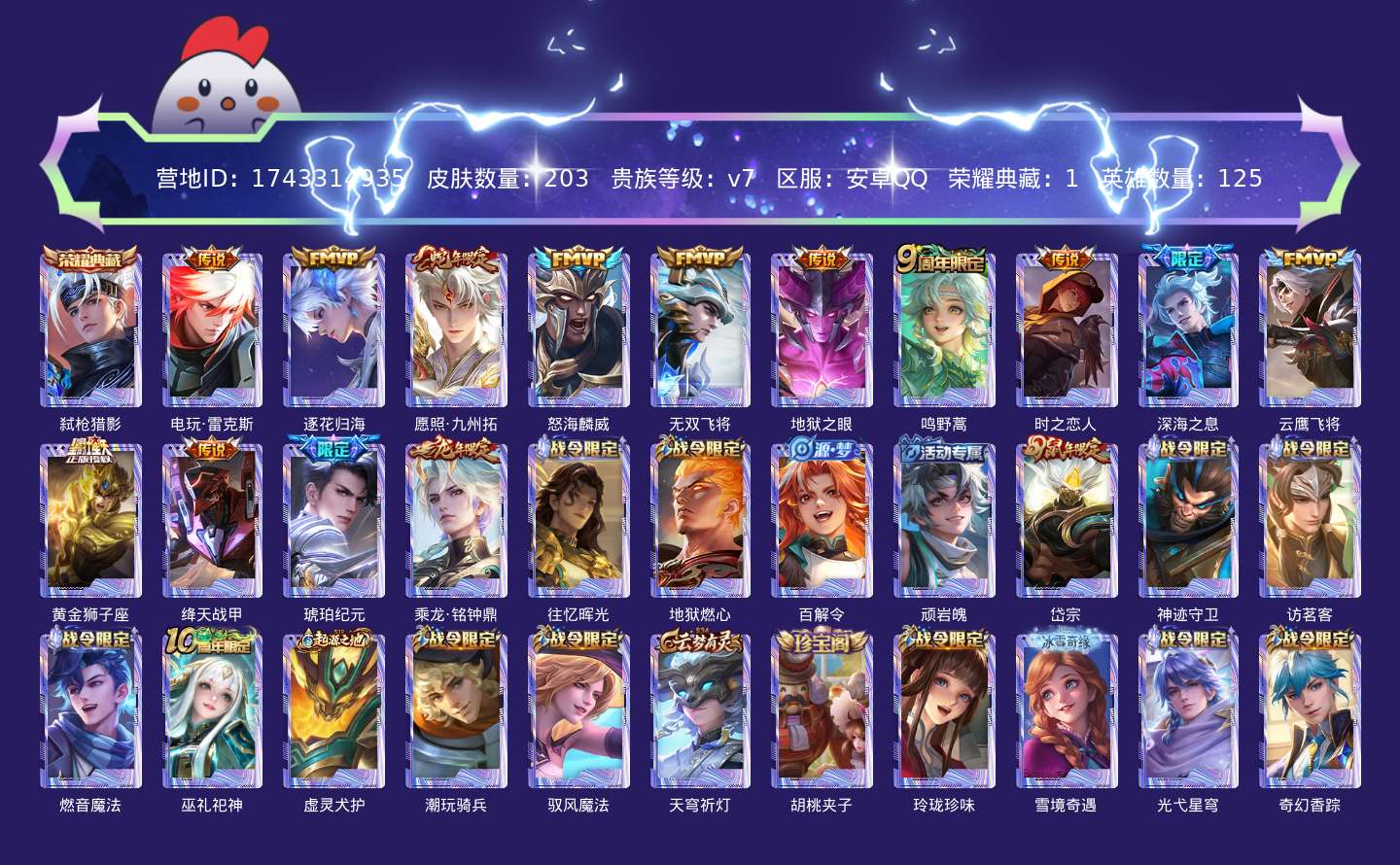贵族等级:v7皮肤数:203传说品质14 生肖限定4 荣耀典藏1 英雄数:125