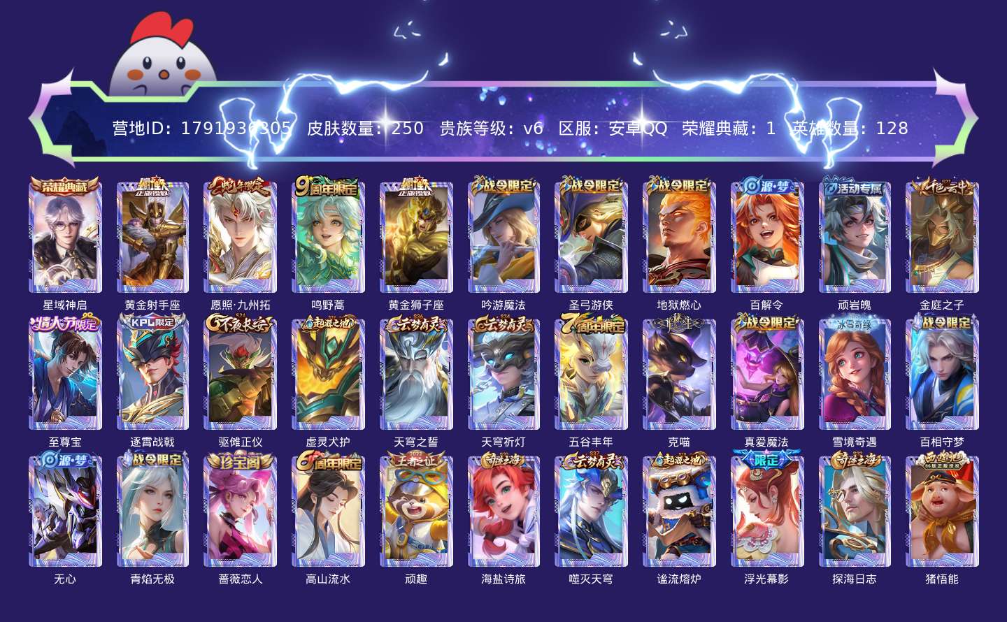 贵族等级:v6皮肤数:250传说品质4 生肖限定1 荣耀典藏1 情人节限定1 英雄数:128