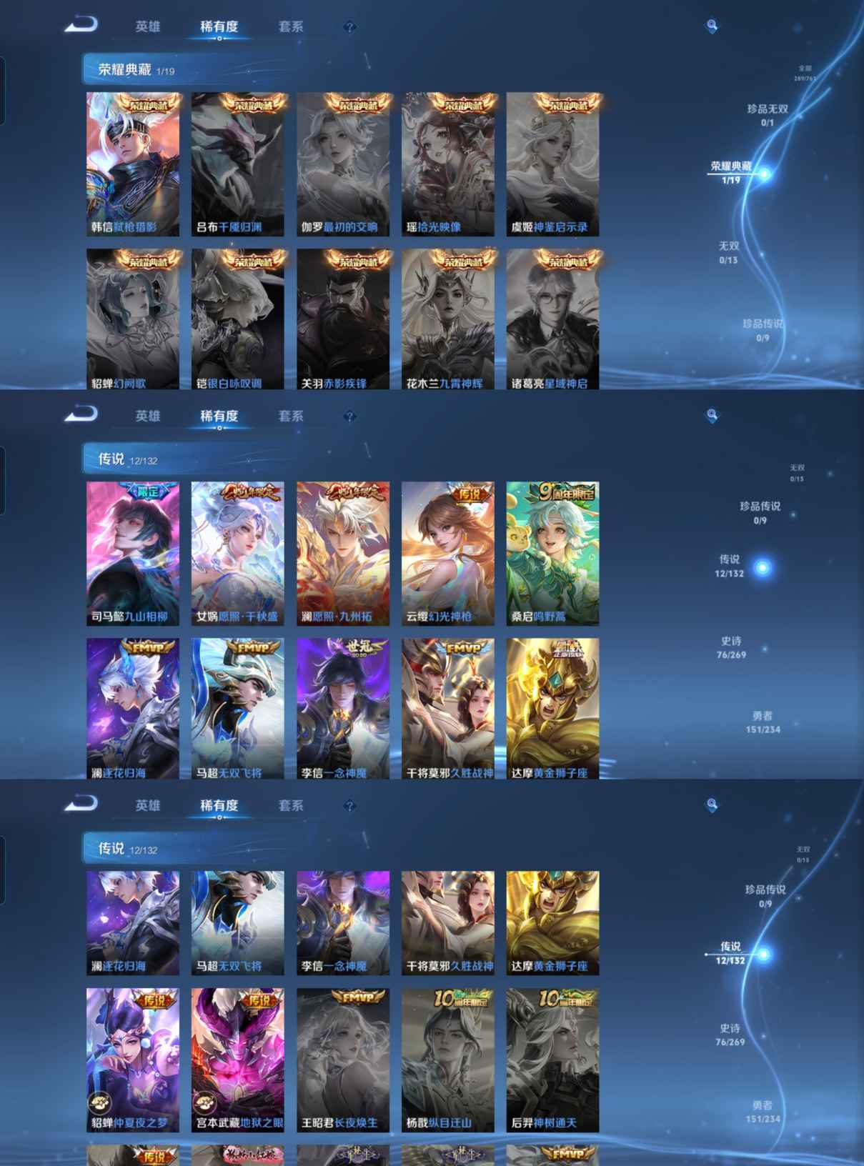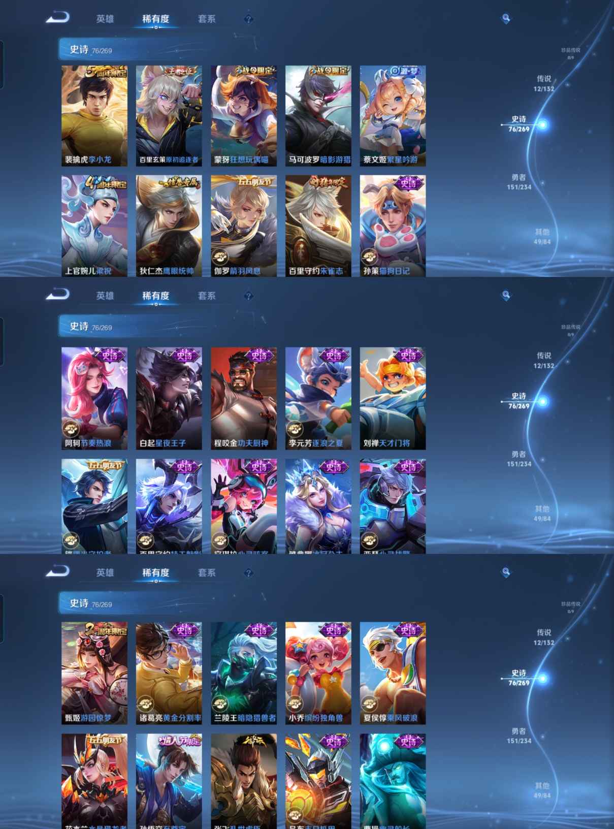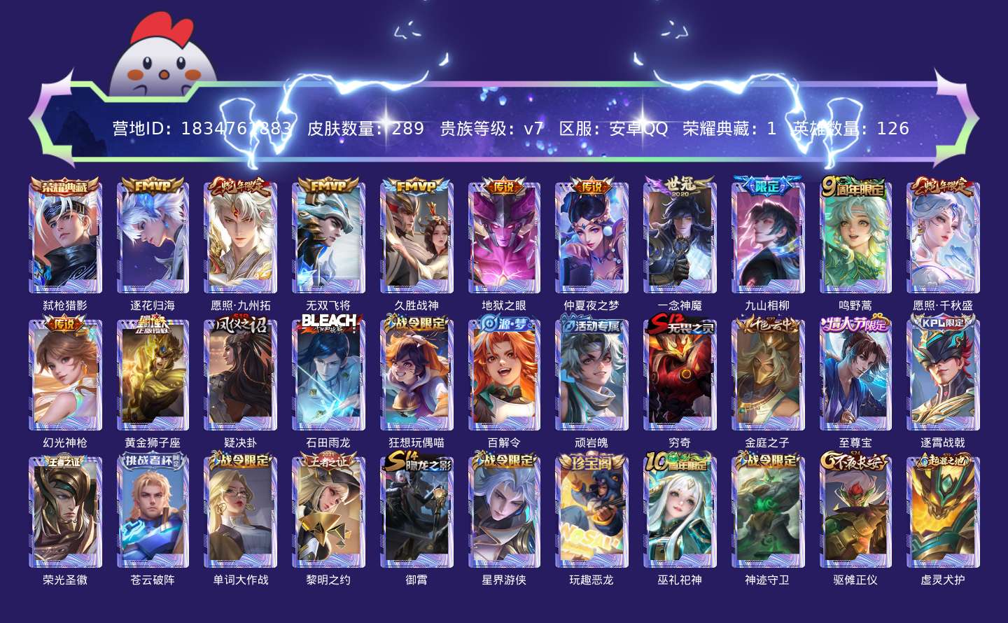 贵族等级:v7皮肤数:289传说品质12 生肖限定3 情人节限定1 荣耀典藏1 英雄数:126