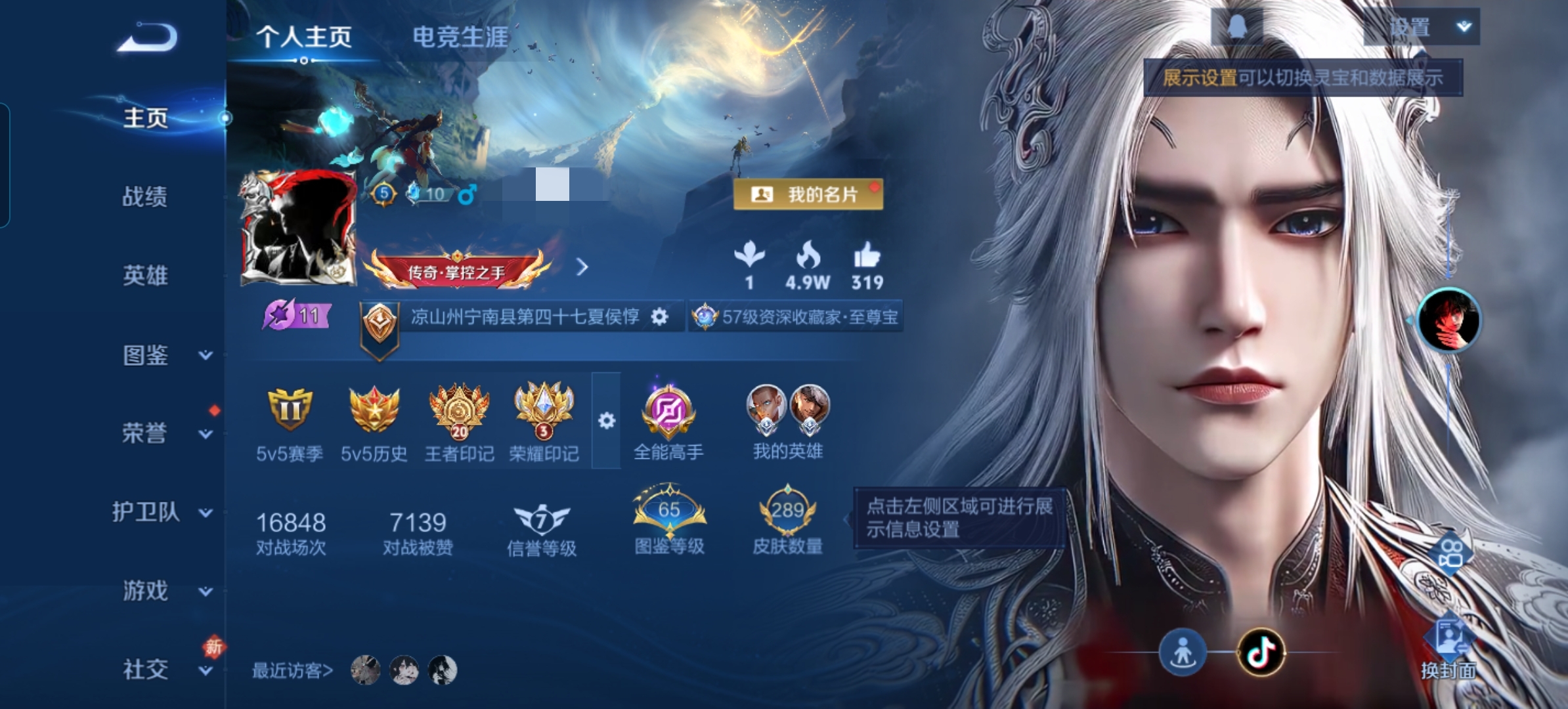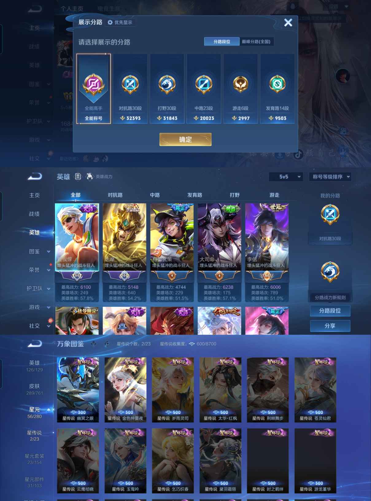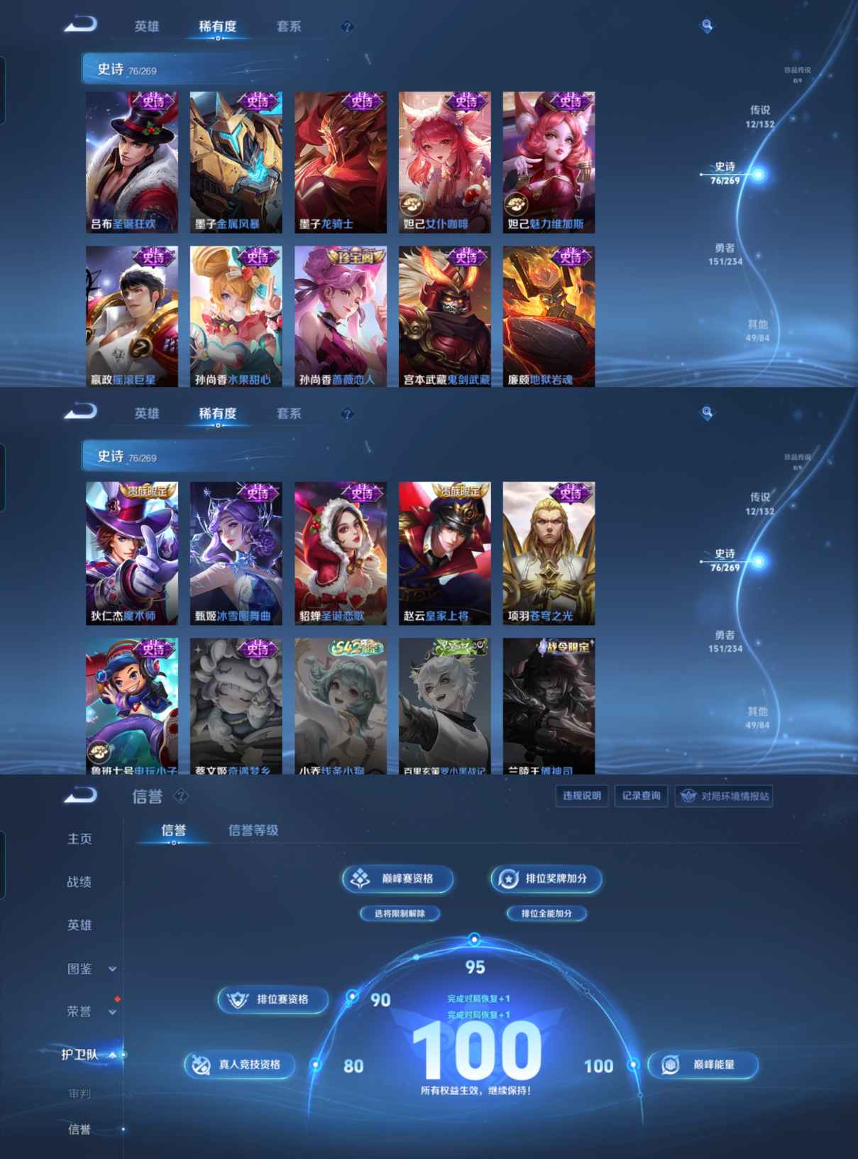 贵族等级:v7皮肤数:289传说品质12 生肖限定3 情人节限定1 荣耀典藏1 英雄数:126