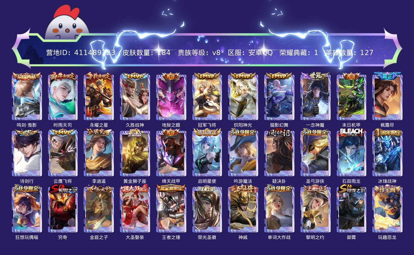 贵族等级:v8皮肤数:184传说品质16 生肖限定2 情人节限定1 荣耀典藏1 英雄数:127