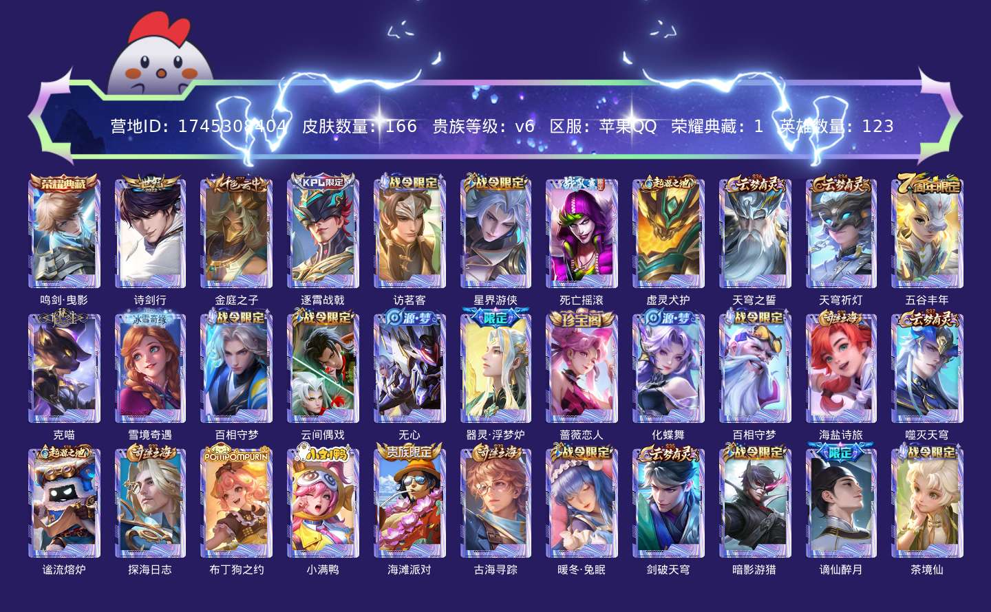 贵族等级:v6皮肤数:167荣耀典藏1 传说品质1 英雄数:123