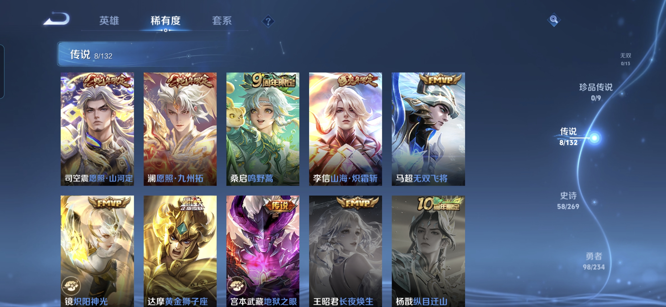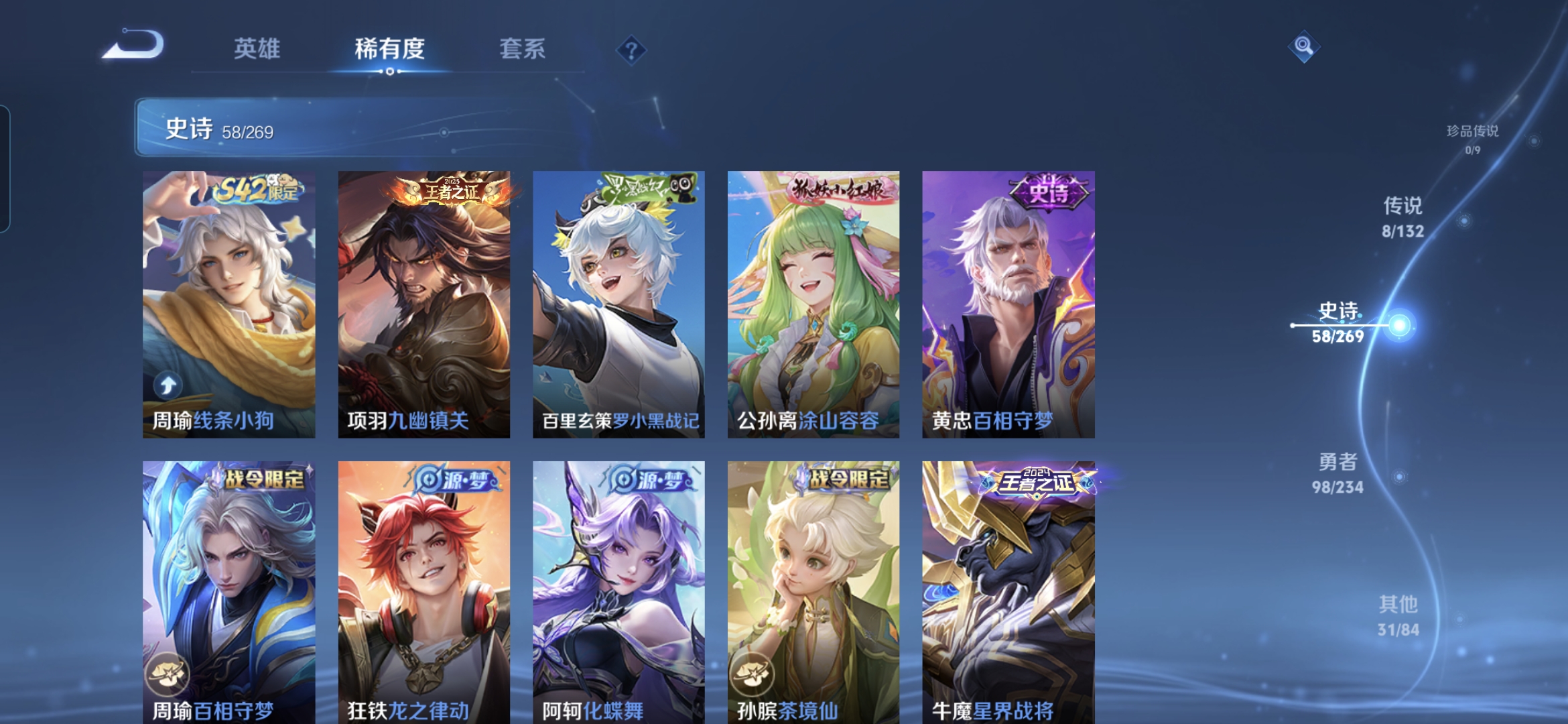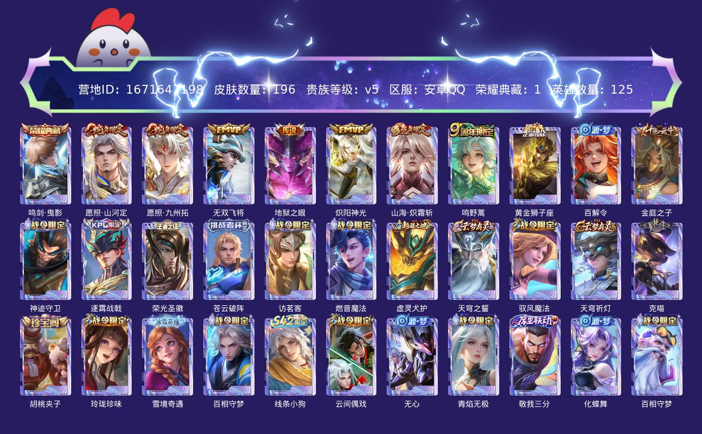 贵族等级:v5皮肤数:196传说品质8 生肖限定4 荣耀典藏1 英雄数:125