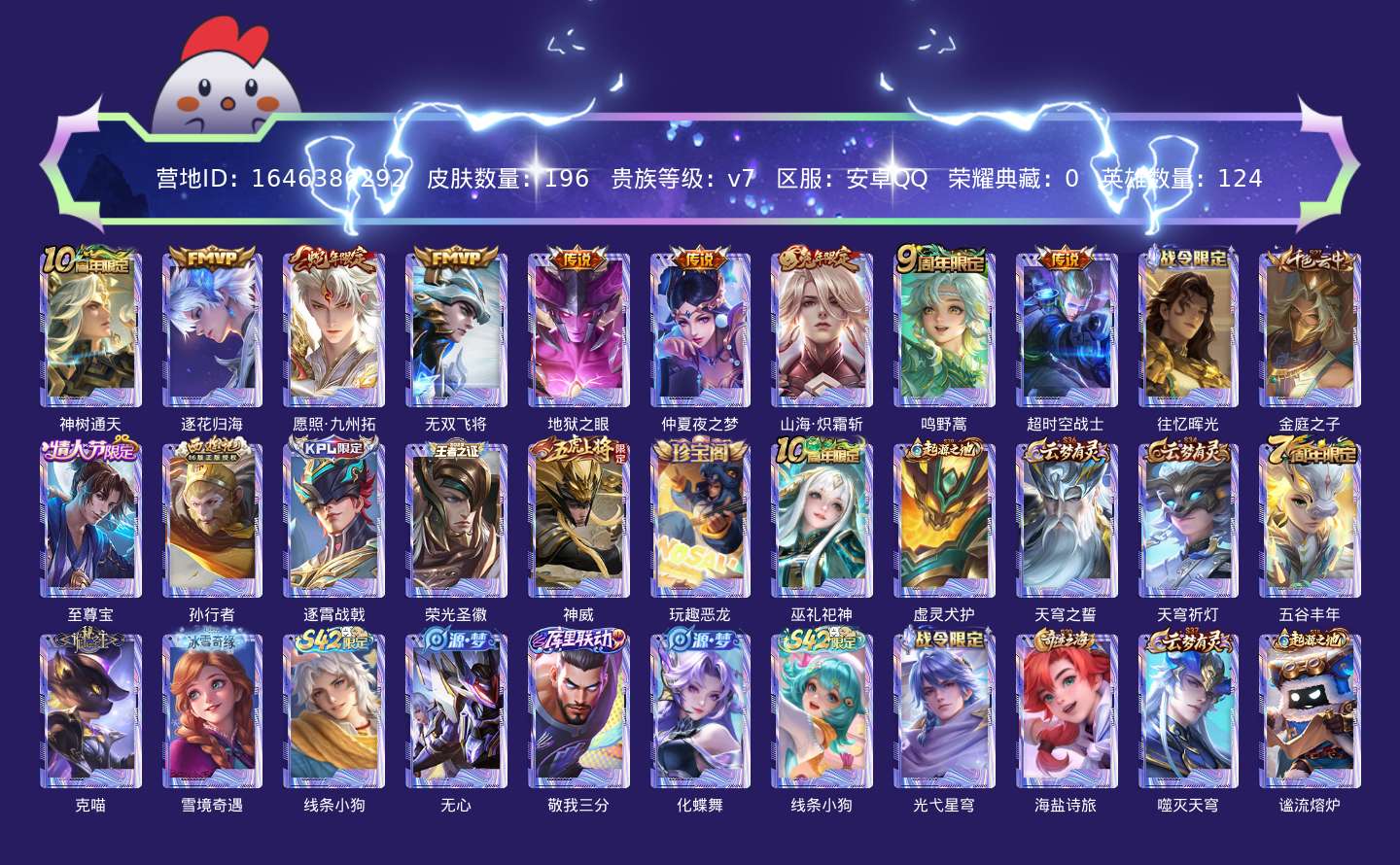 贵族等级:v7皮肤数:196传说品质9 生肖限定2 情人节限定1 英雄数:124