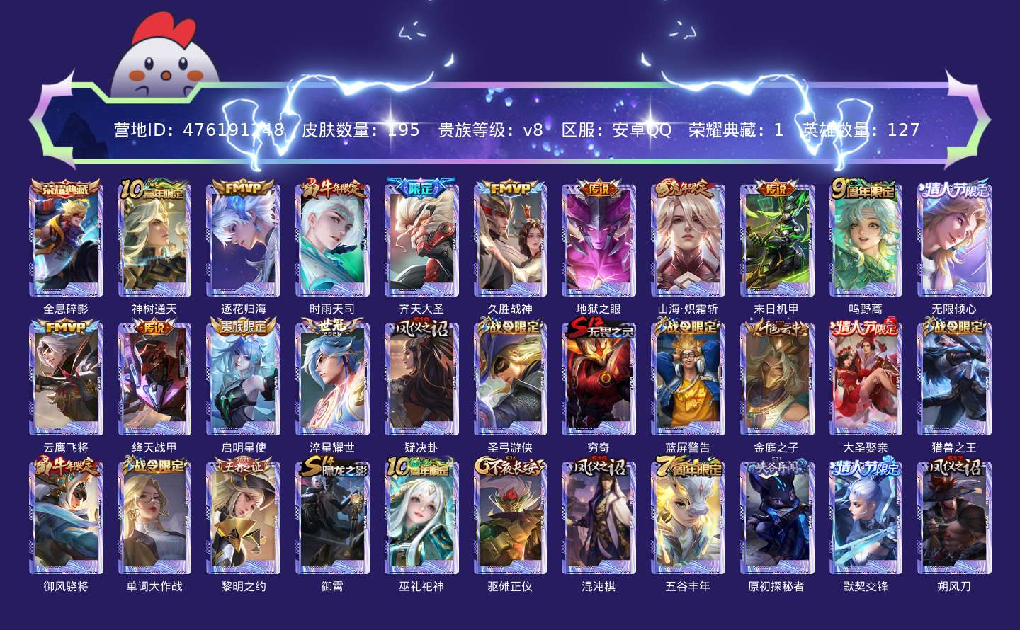 贵族等级:v8皮肤数:195传说品质14 生肖限定5 情人节限定3 荣耀典藏1 英雄数:127
