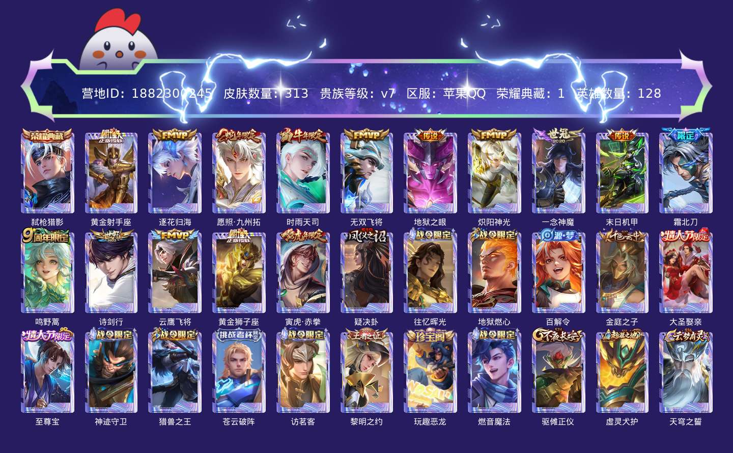 贵族等级:v7皮肤数:313传说品质15 生肖限定4 情人节限定3 荣耀典藏1 英雄数:128