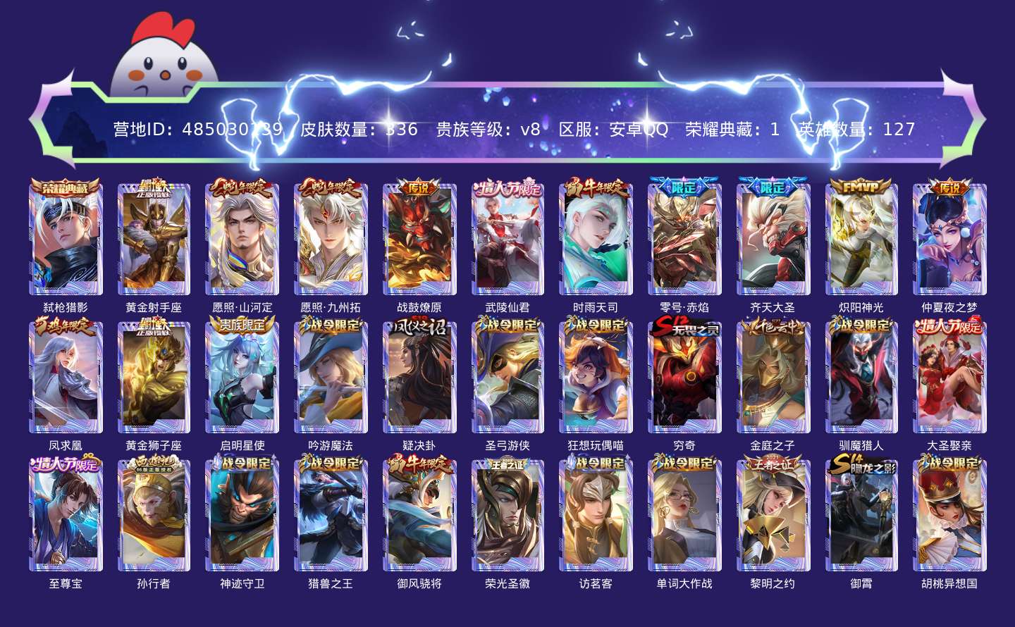 贵族等级:v8皮肤数:336传说品质13 生肖限定8 情人节限定3 荣耀典藏1 英雄数:127