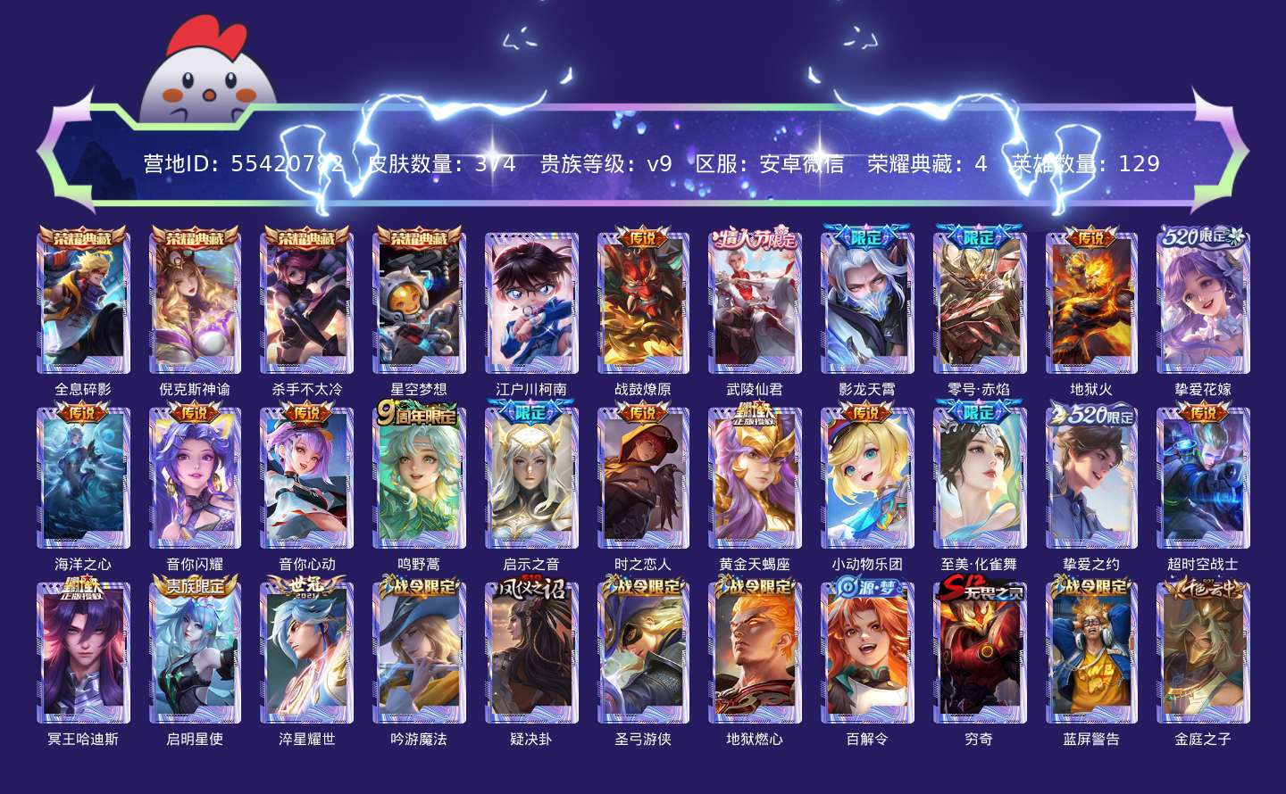 贵族等级:v9皮肤数:374传说品质20 情人节限定3 荣耀典藏4 生肖限定1 珍品传说1 英雄数:129