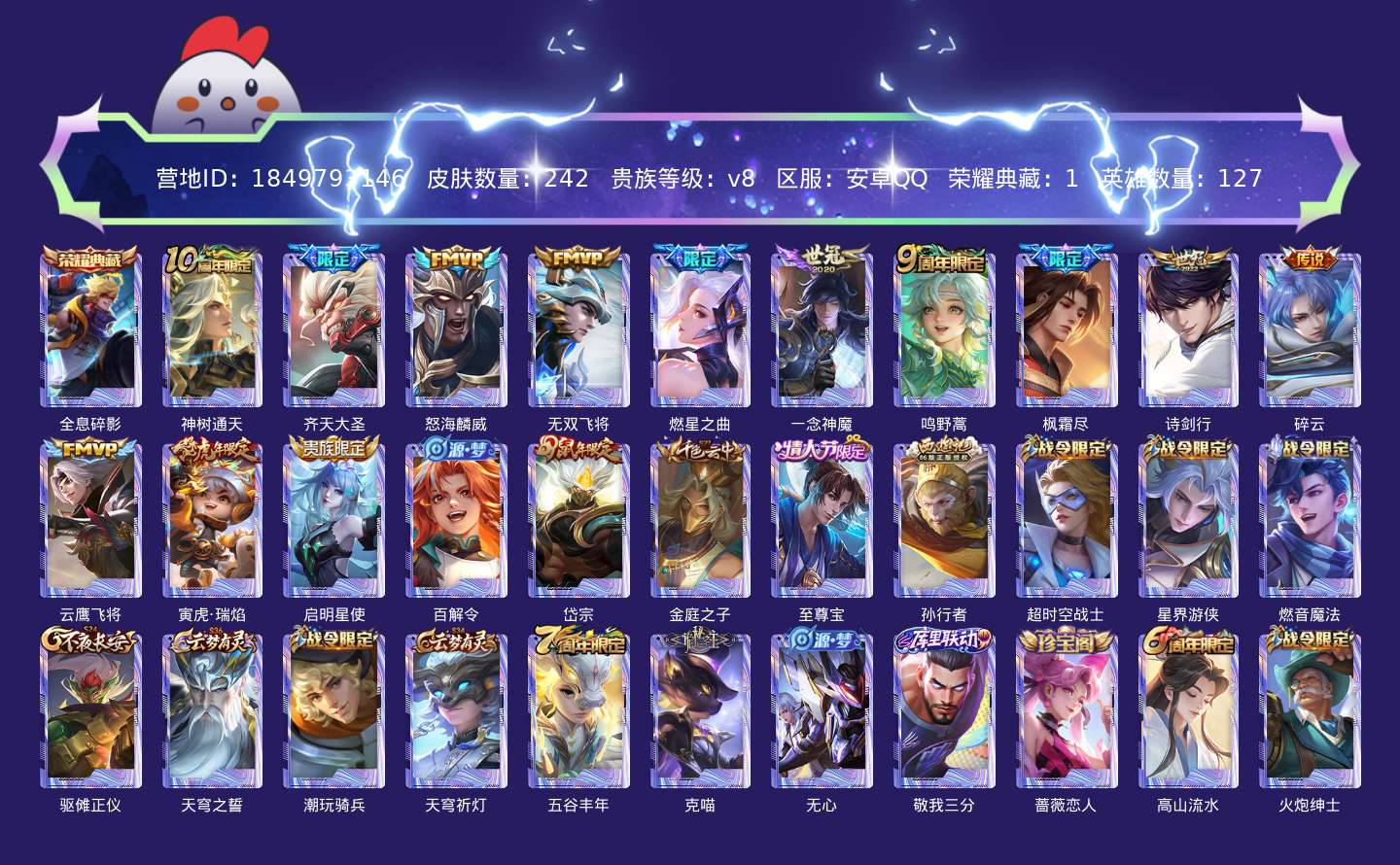 贵族等级:v8皮肤数:242传说品质13 生肖限定5 情人节限定1 荣耀典藏1 英雄数:127