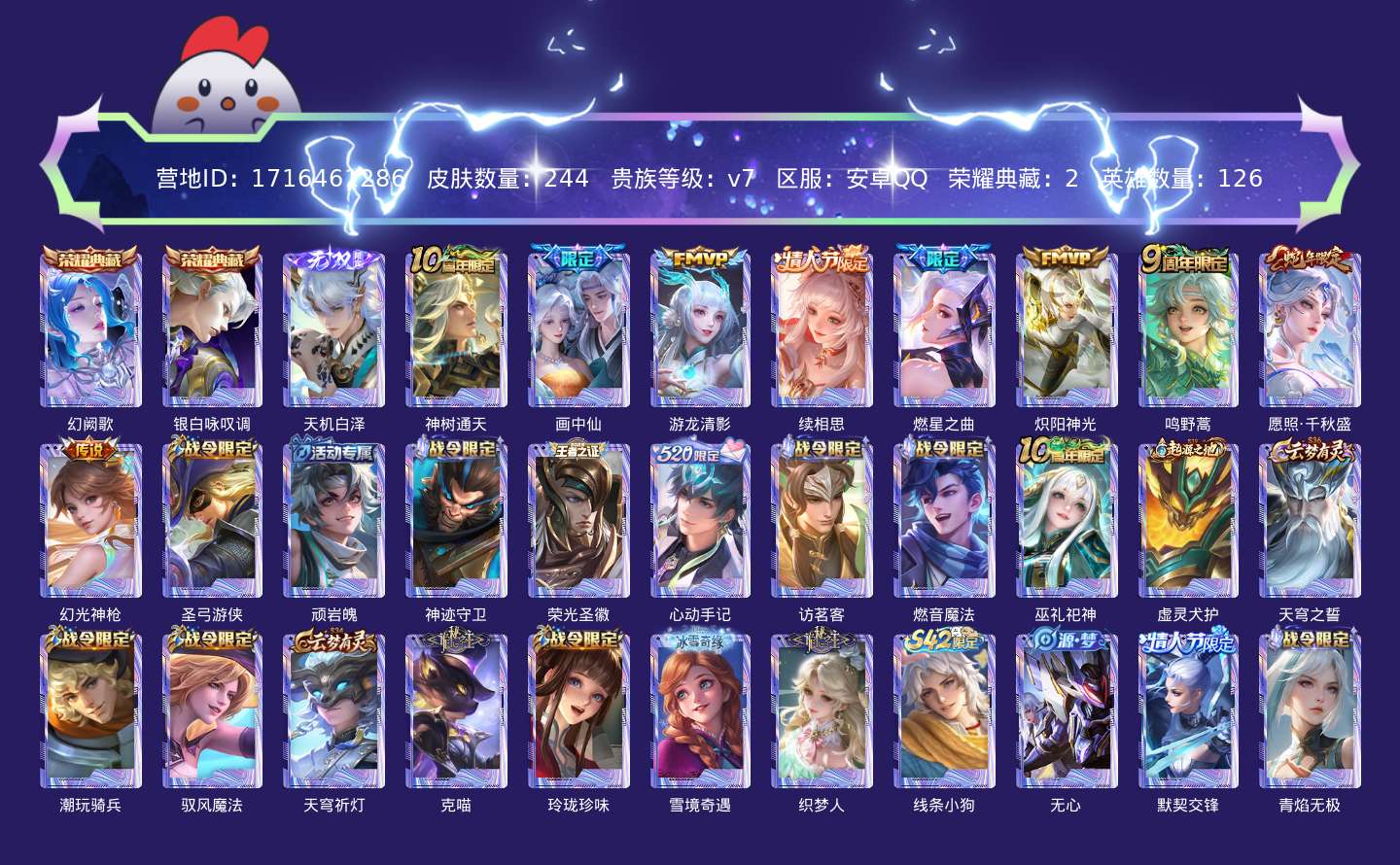 贵族等级:v7皮肤数:244传说品质9 无双1 情人节限定2 荣耀典藏2 生肖限定1 英雄数:126