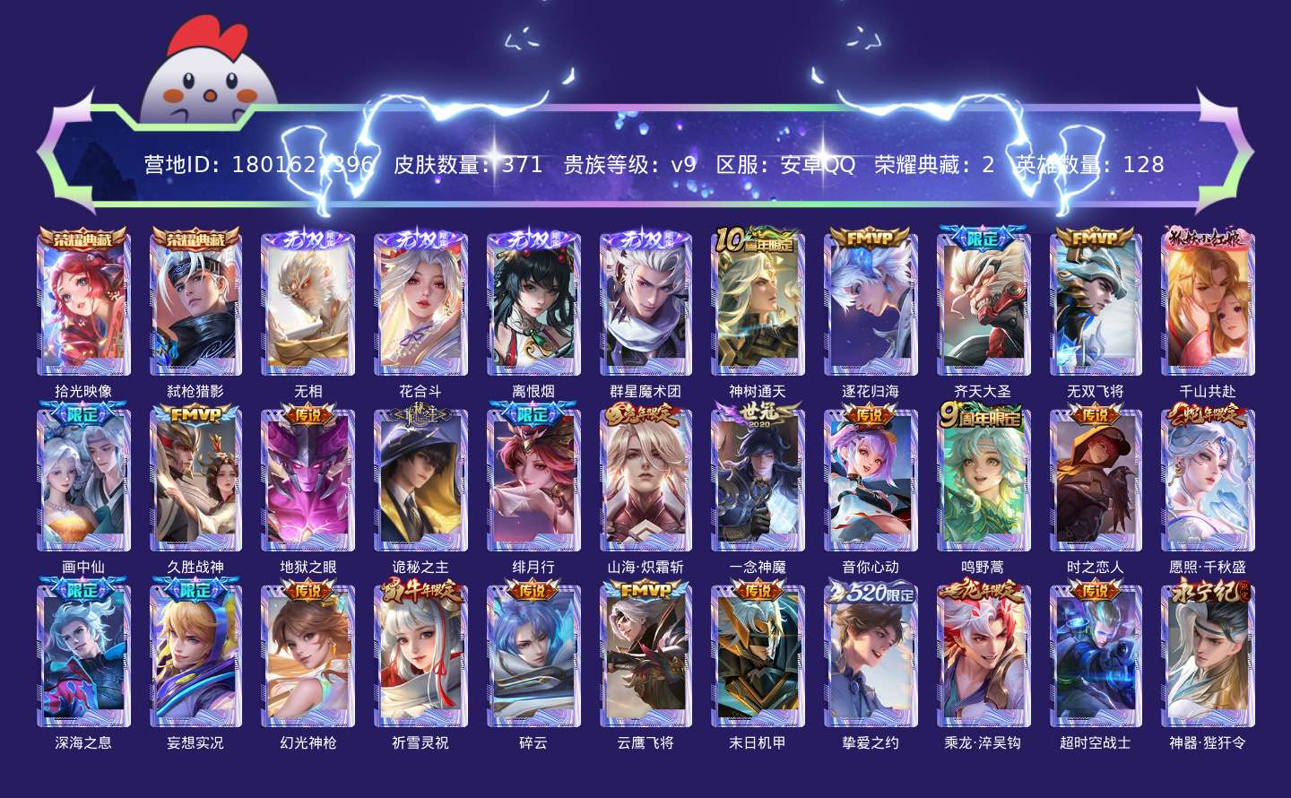 传说品质_后羿_神树通天传说品质_澜_逐花归海传说品质_孙悟空_齐天大圣传说品质_马超_无双飞将传说品质_干将莫邪_千山共赴传说品质_干将莫邪_画中仙传说品质_干将莫邪_久胜战神传说品质_宫本武藏_地狱之眼传说品质_元歌_诡秘之主传说品质_不知火舞_绯月行传说品质_李信_山海·炽霜斩传说品质_李信_一念神魔传说品质_小乔_音你心动传说品质_桑启_鸣野蒿传说品质_刘备_时之恋人传说品质_女娲_愿照·千秋盛传说品质_马可波罗_深海之息传说品质_马可波罗_妄想实况传说品质_云缨_幻光神枪传说品质_公孙离_祈雪灵祝传说品质_百里守约_碎云传说品质_曜_云鹰飞将传说品质_孙策_末日机甲传说品质_孙策_挚爱之约传说品质_孙策_乘龙·淬吴钩传说品质_狄仁杰_超时空战士传说品质_狄仁杰_神器·狴犴令传说品质_达摩_黄金狮子座传说品质_虞姬_启明星使传说品质_赵云_淬星耀世