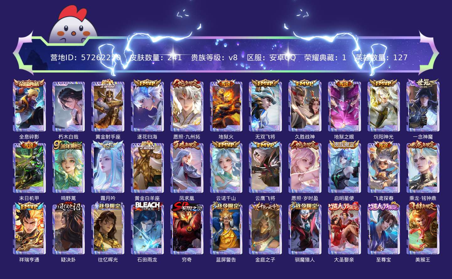 贵族等级:v8皮肤数:241传说品质21 生肖限定6 情人节限定2 荣耀典藏1 珍品传说1 英雄数:127