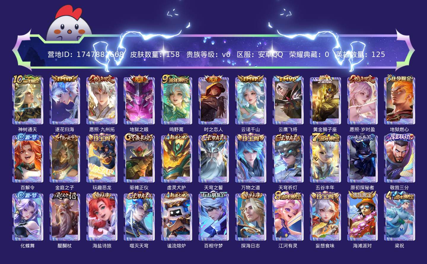 贵族等级:v6皮肤数:158传说品质10 生肖限定2 英雄数:125