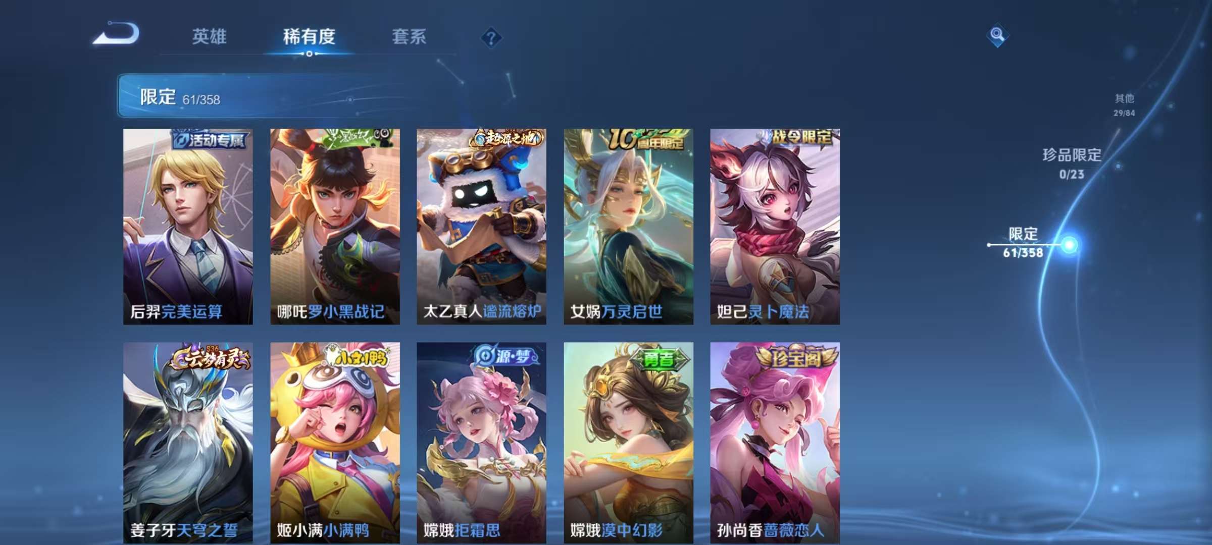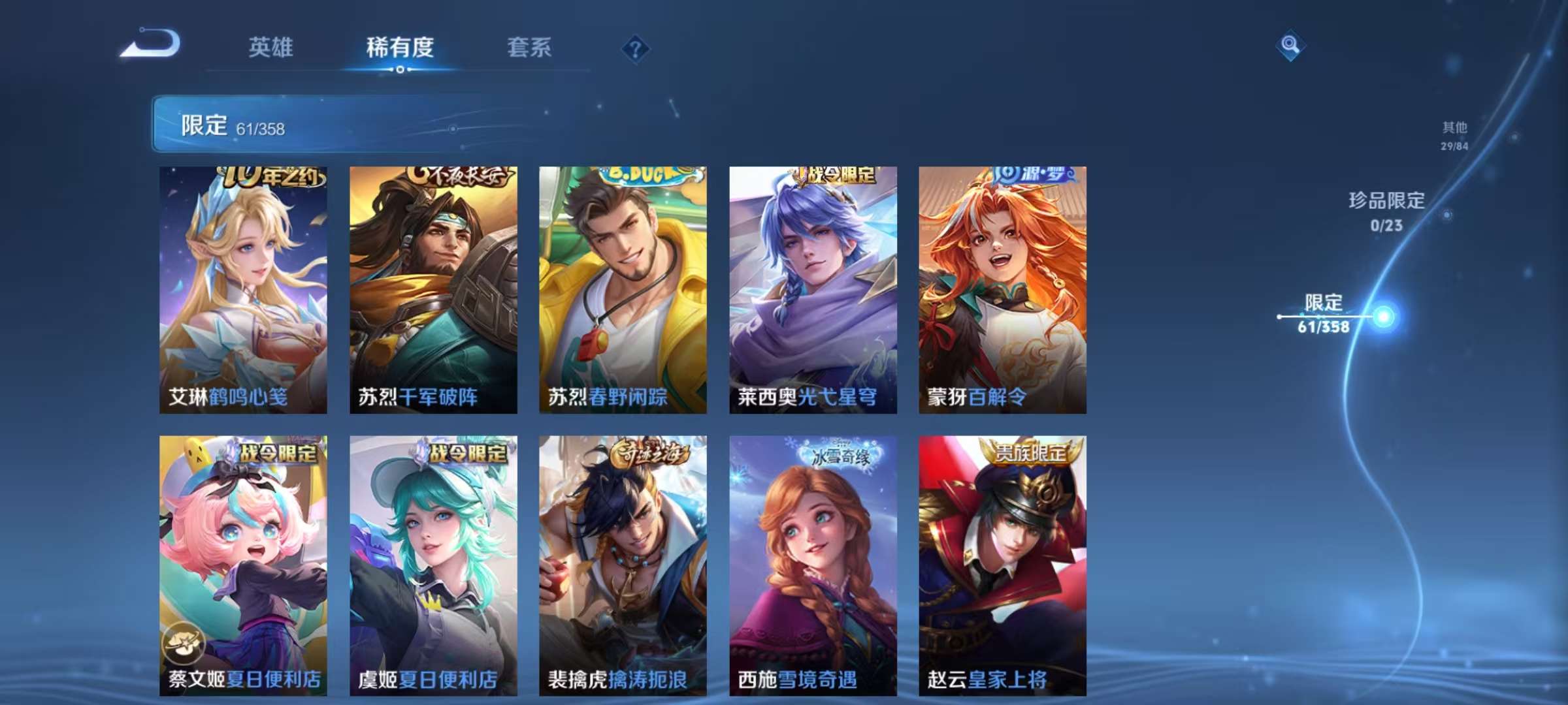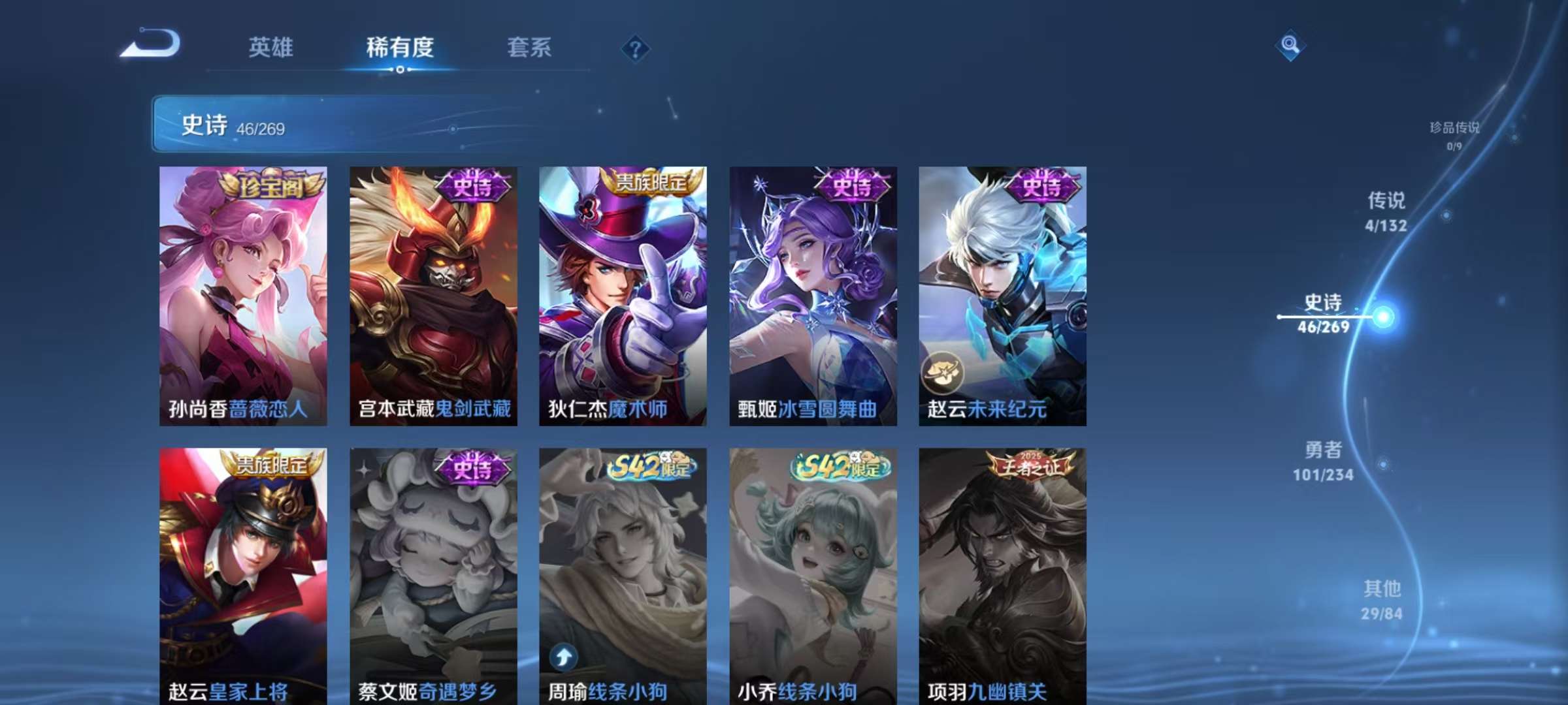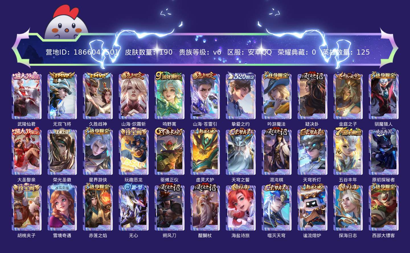 贵族等级:v6皮肤数:196传说品质7 情人节限定2 生肖限定2 英雄数:125