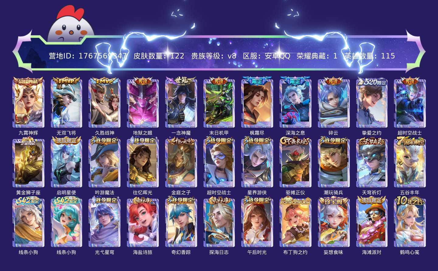 贵族等级:v8皮肤数:123传说品质12 荣耀典藏1 生肖限定2 英雄数:115