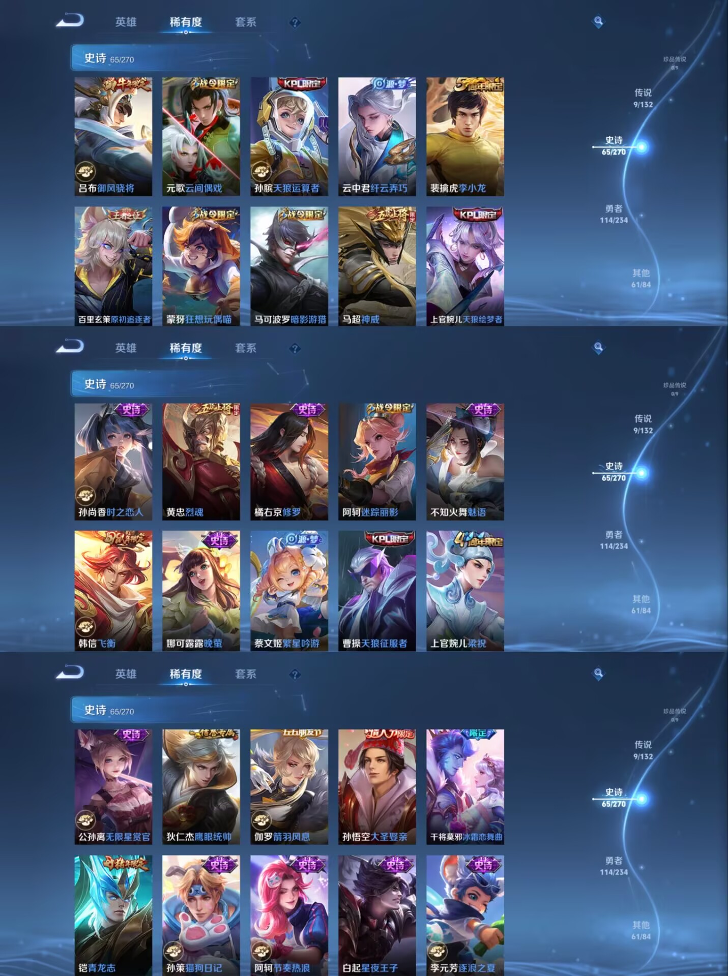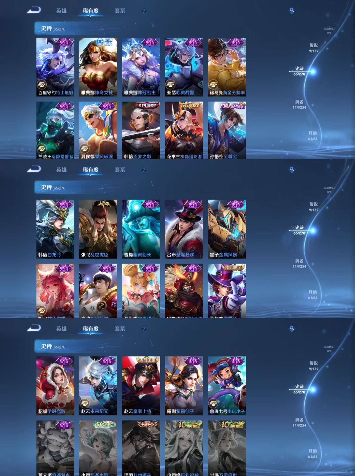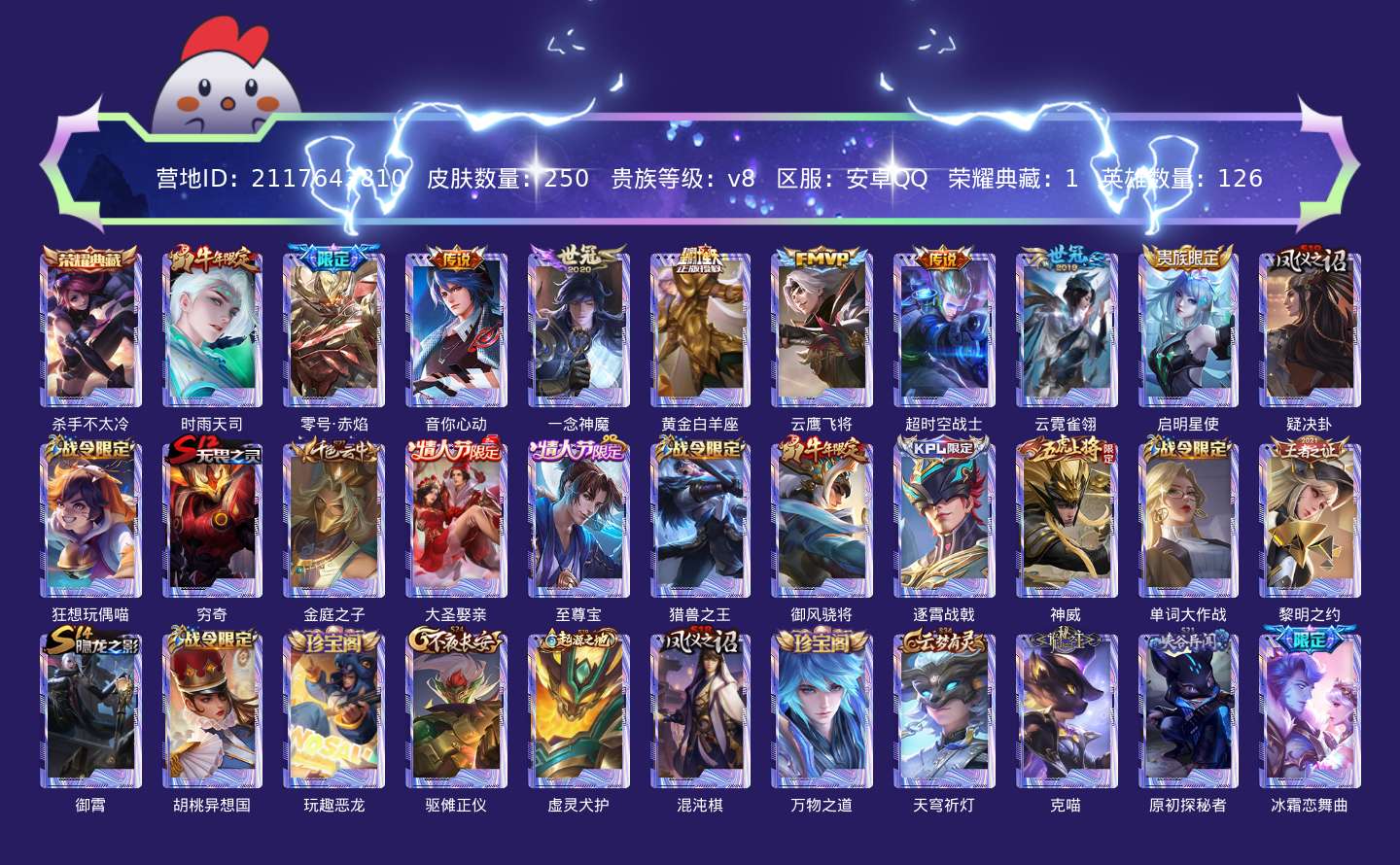 贵族等级:v8皮肤数:250传说品质9 生肖限定4 情人节限定3 荣耀典藏1 英雄数:126