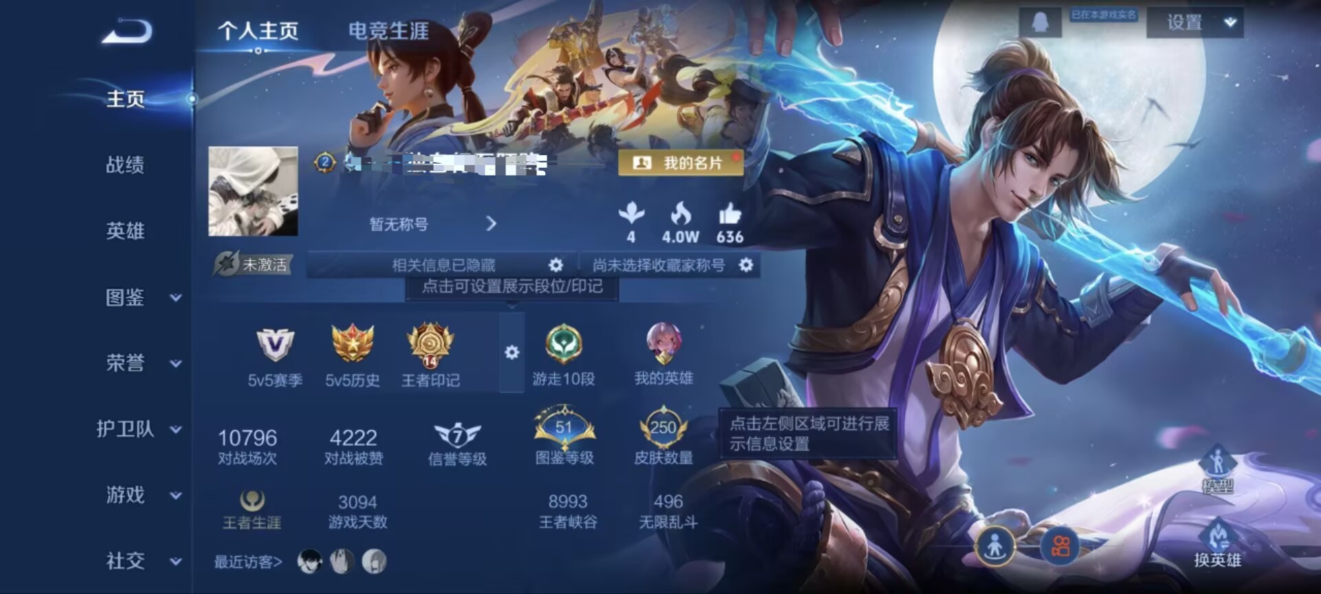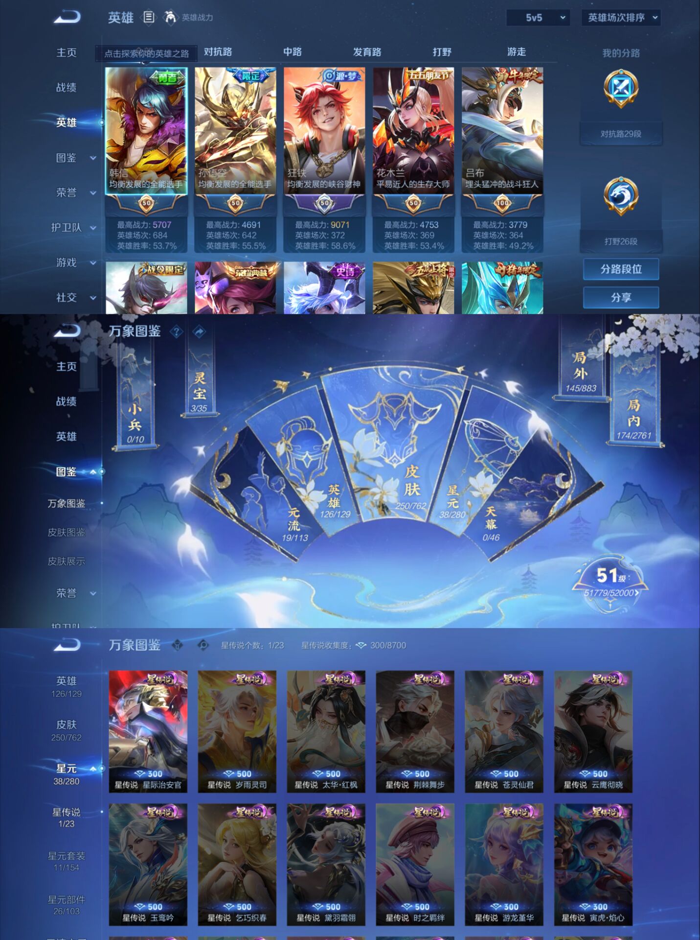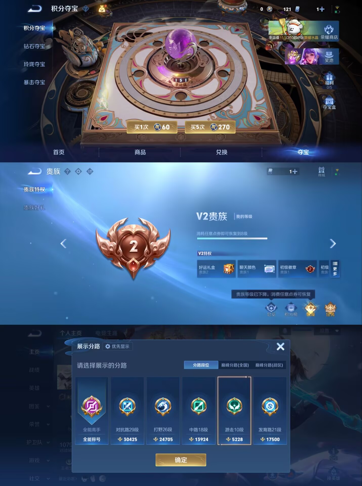 贵族等级:v8皮肤数:250传说品质9 生肖限定4 情人节限定3 荣耀典藏1 英雄数:126