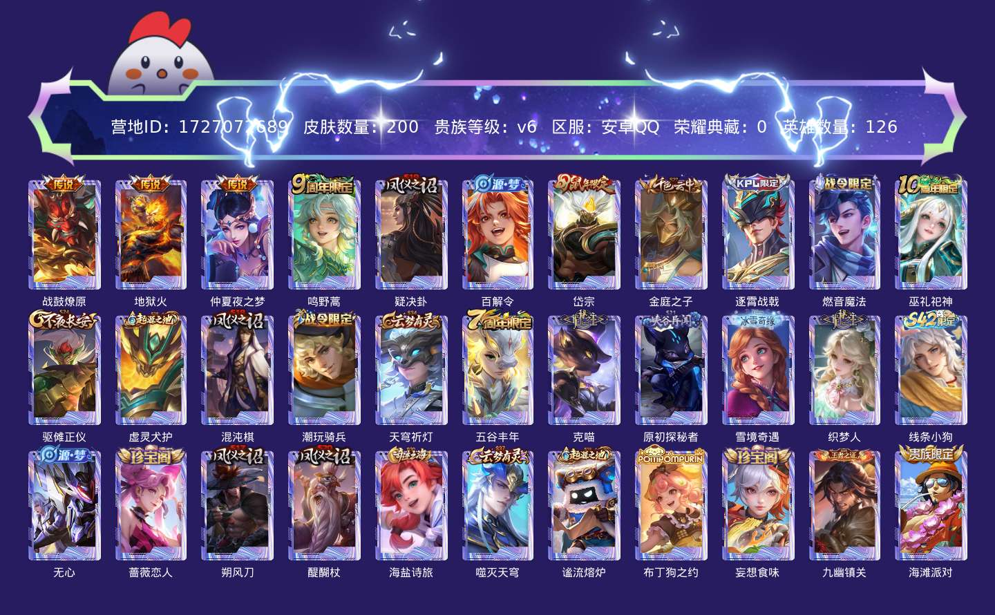 贵族等级:v6皮肤数:200生肖限定1 传说品质4 英雄数:126