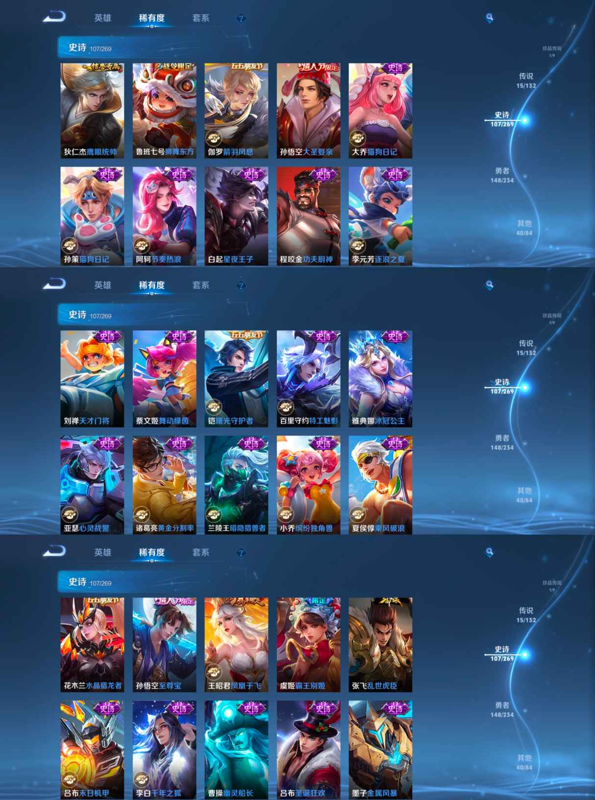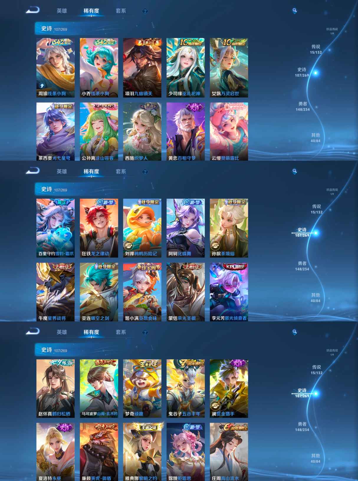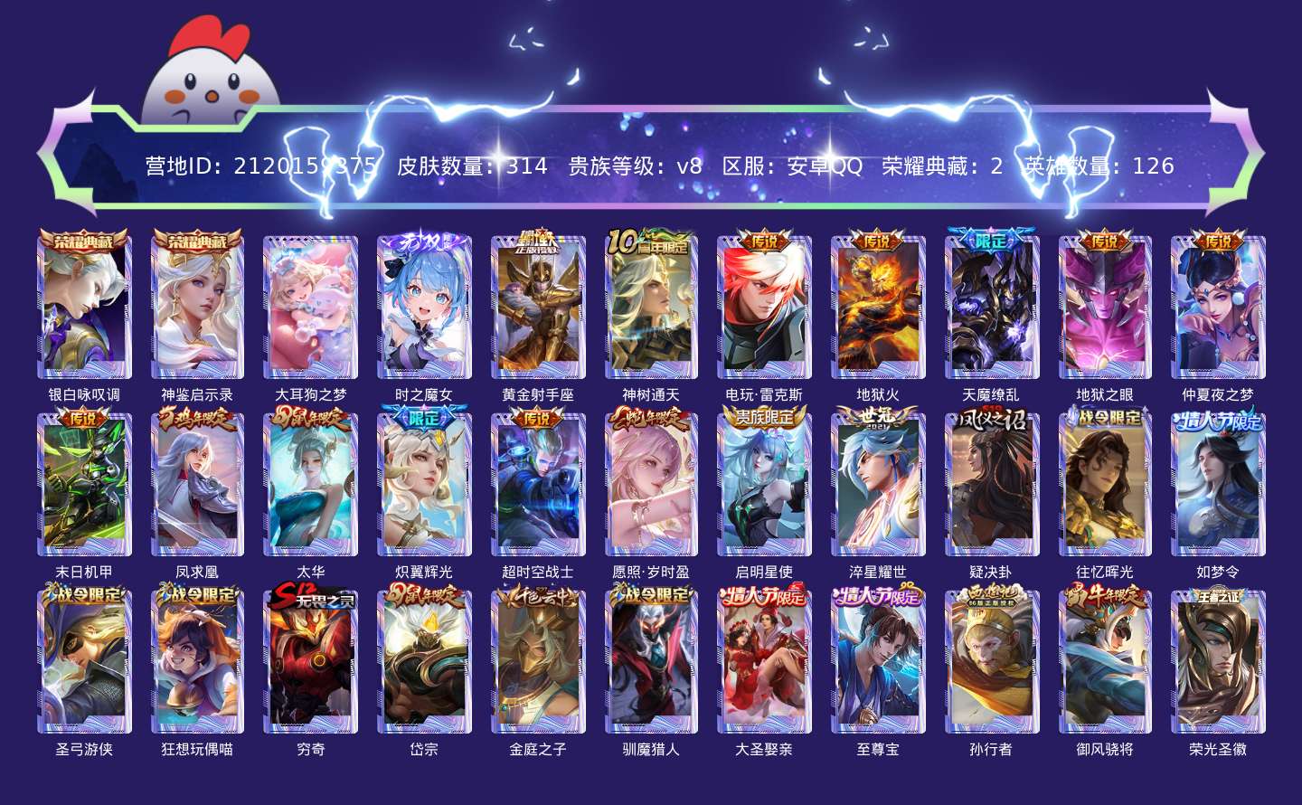 贵族等级:v8皮肤数:314传说品质15 情人节限定4 生肖限定11 无双1 珍品传说1 荣耀典藏2 英雄数:126