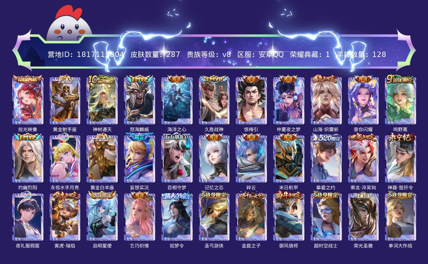 贵族等级:v8皮肤数:287传说品质25 情人节限定1 生肖限定8 荣耀典藏1 英雄数:128