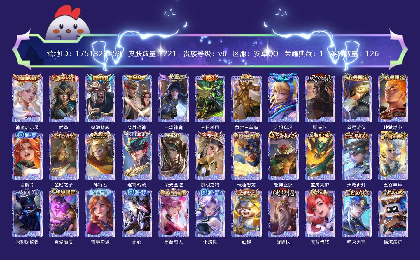 贵族等级:v6皮肤数:221传说品质7 生肖限定1 荣耀典藏1 英雄数:126