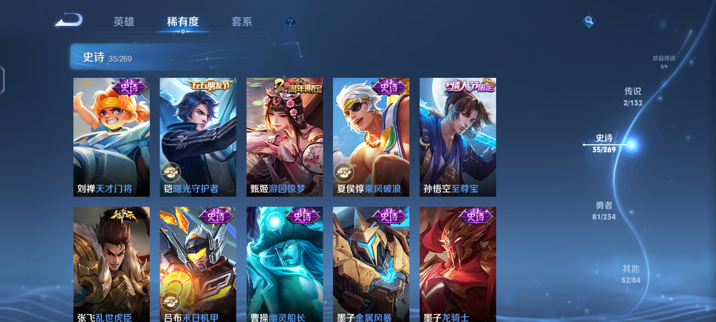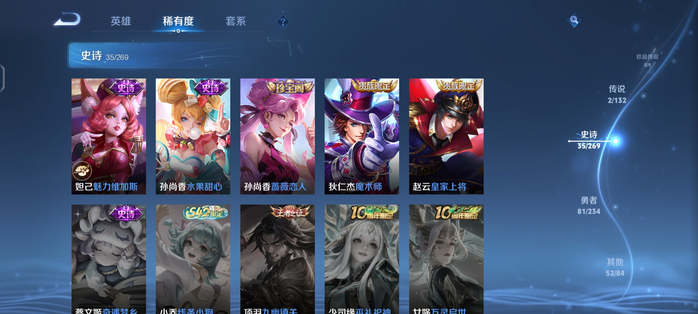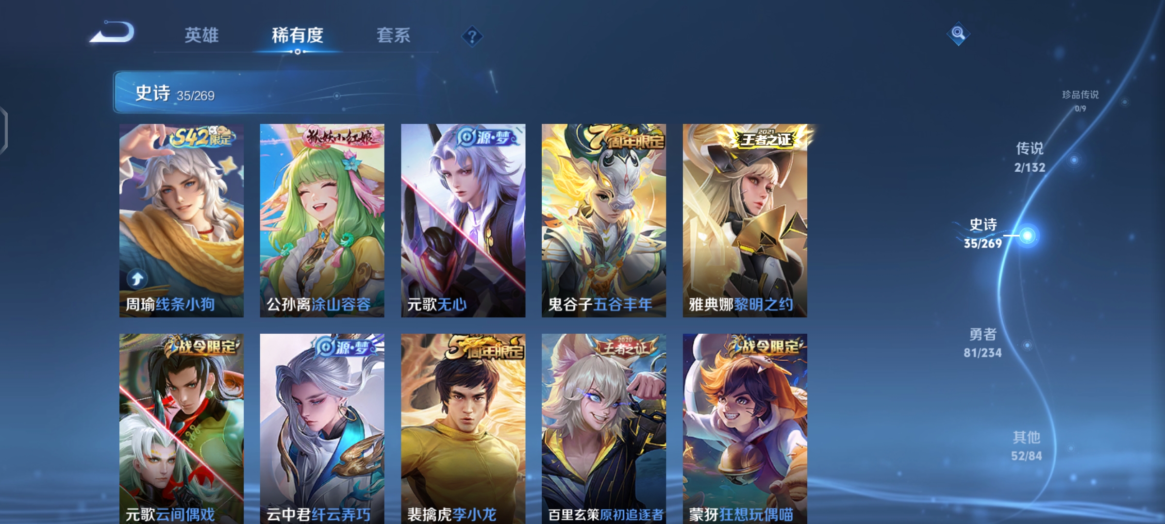 贵族等级:v6皮肤数:170情人节限定2 传说品质2 生肖限定3 英雄数:126