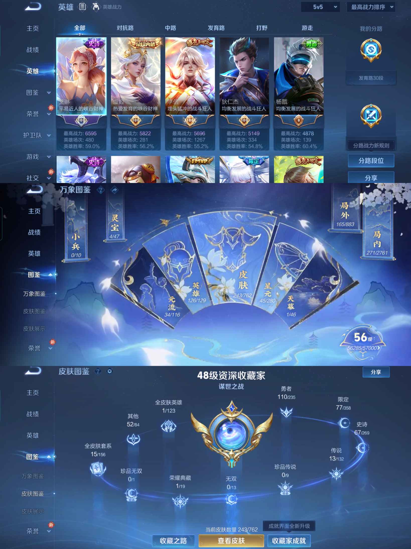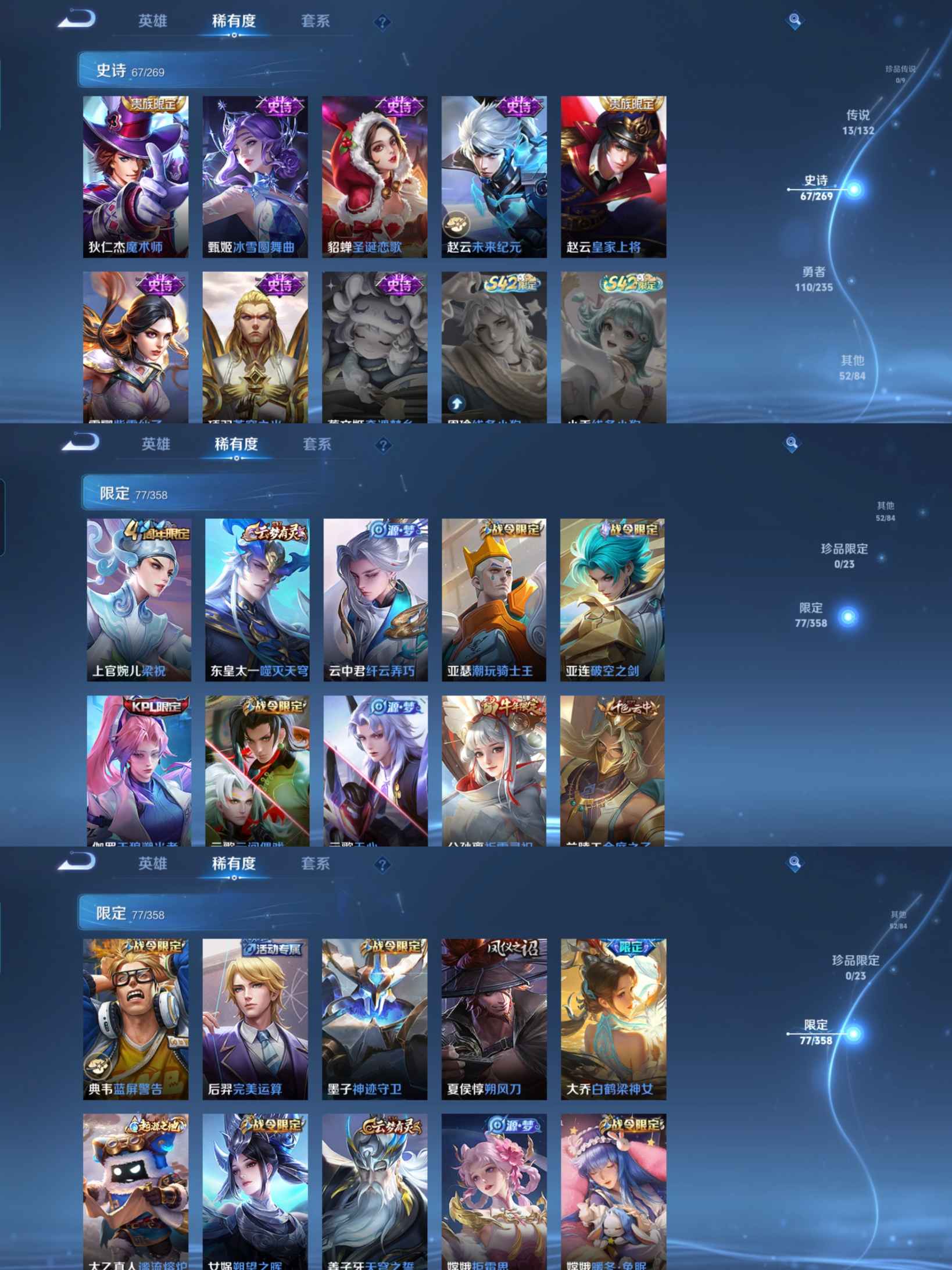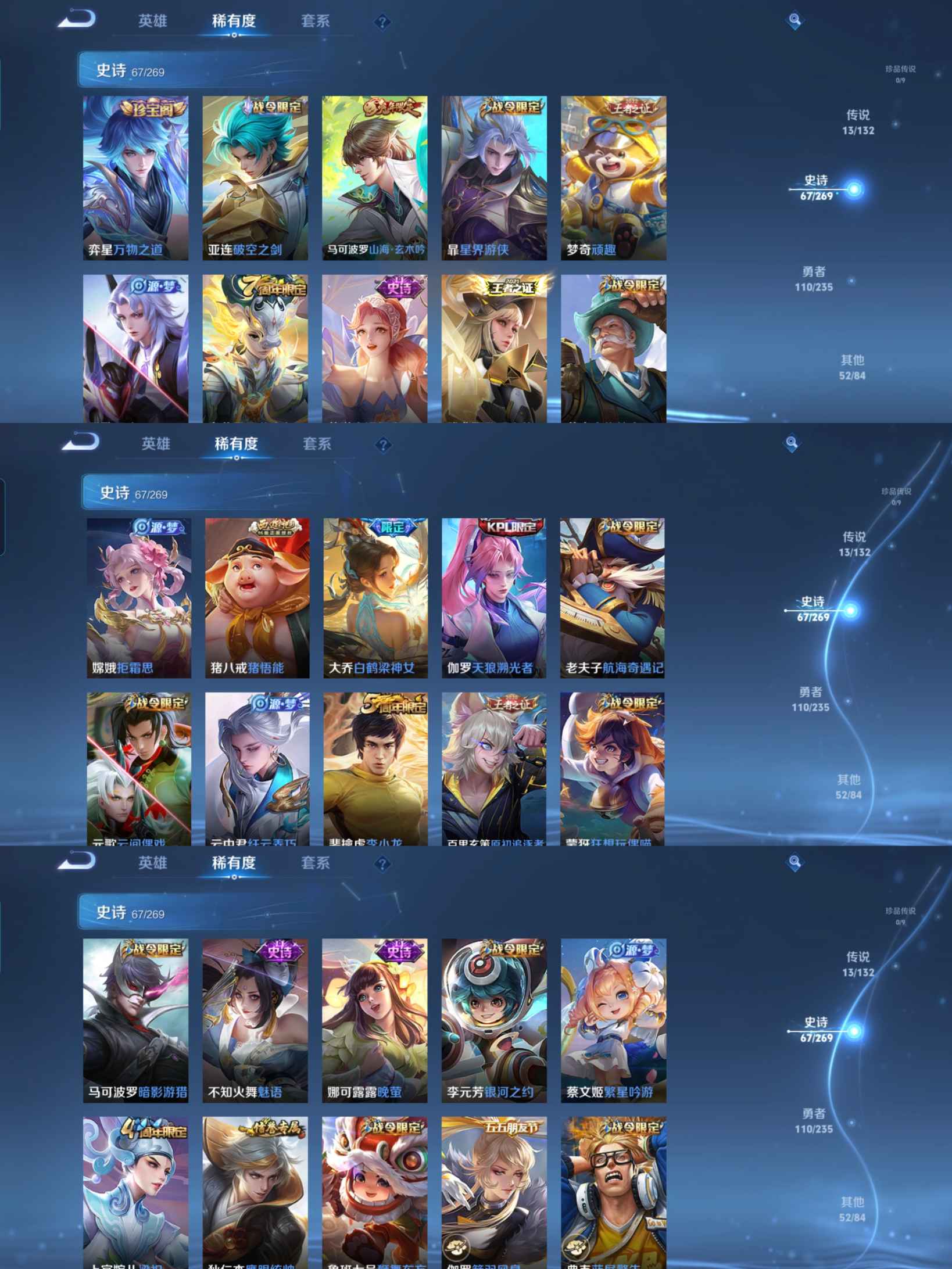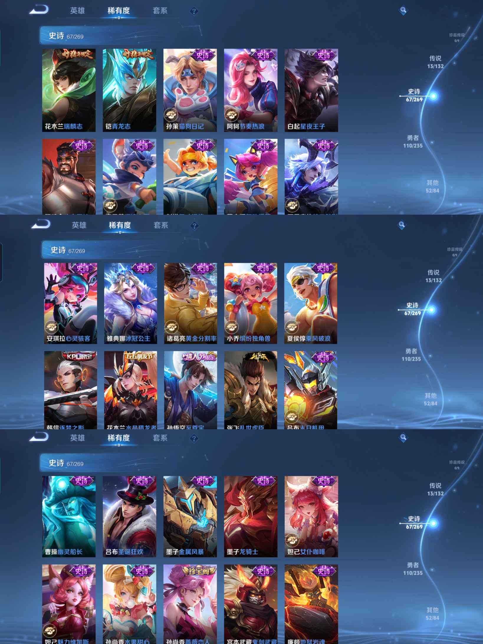 贵族等级:v7皮肤数:243传说品质13 情人节限定1 生肖限定5 荣耀典藏1 英雄数:126