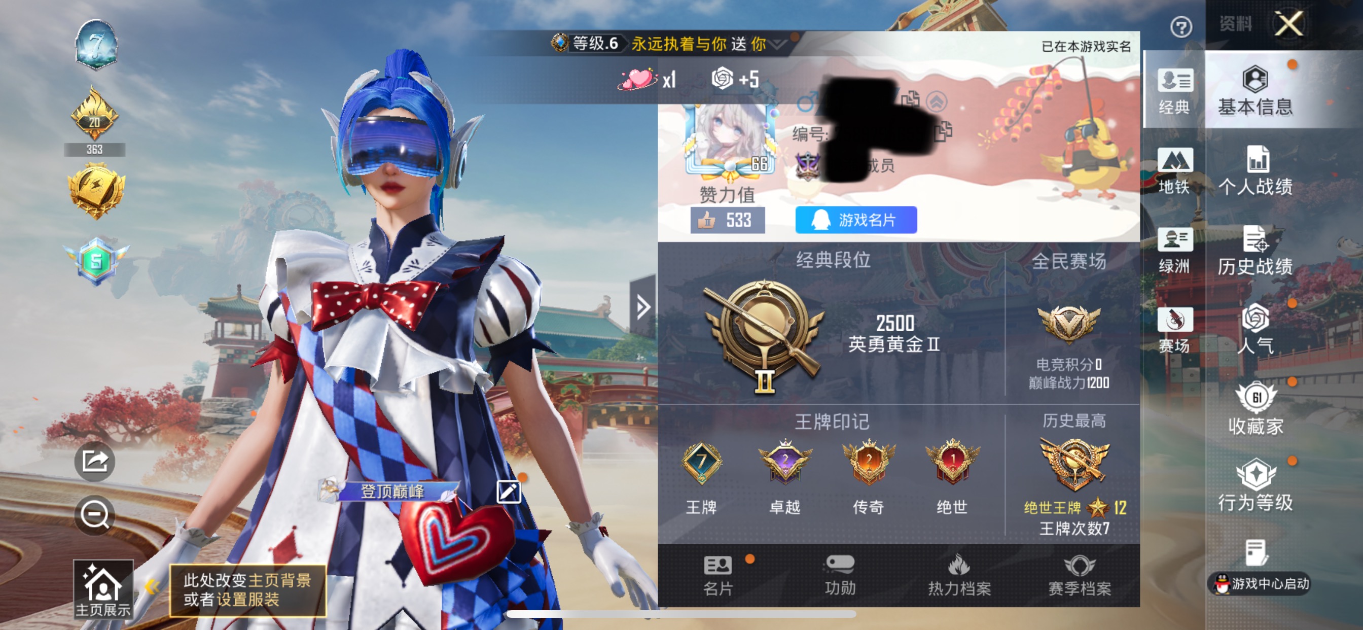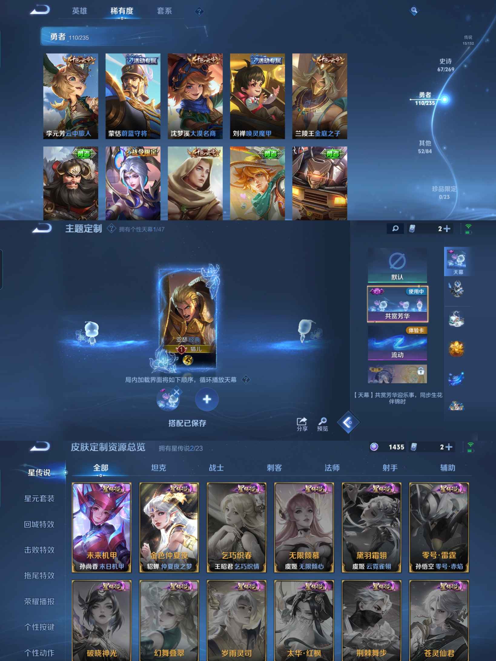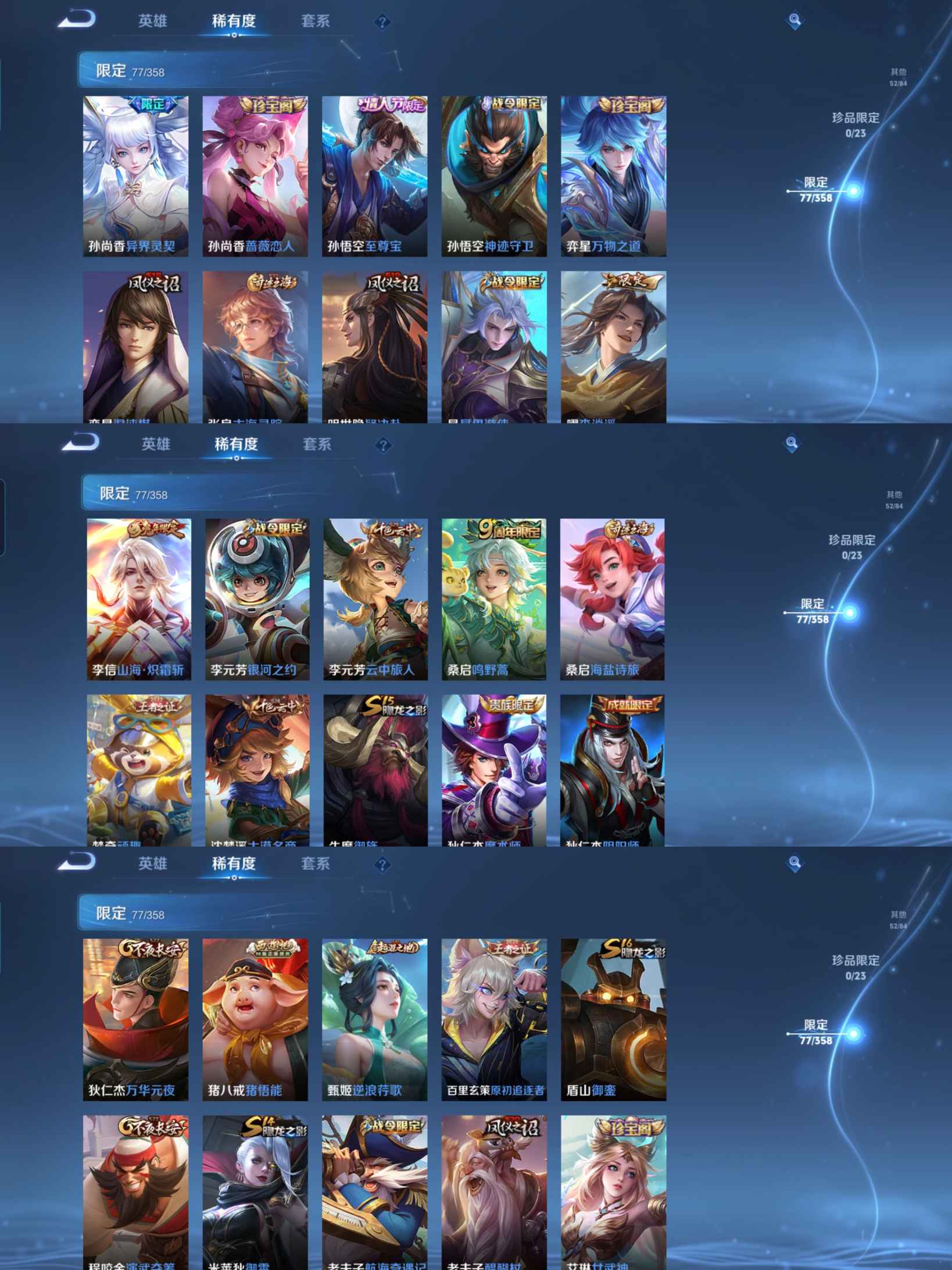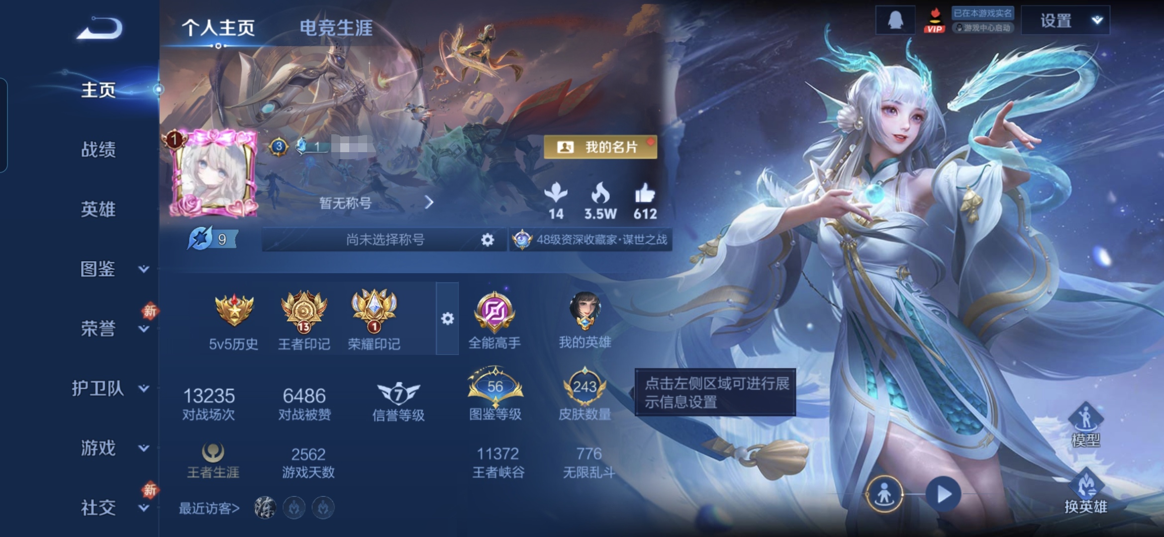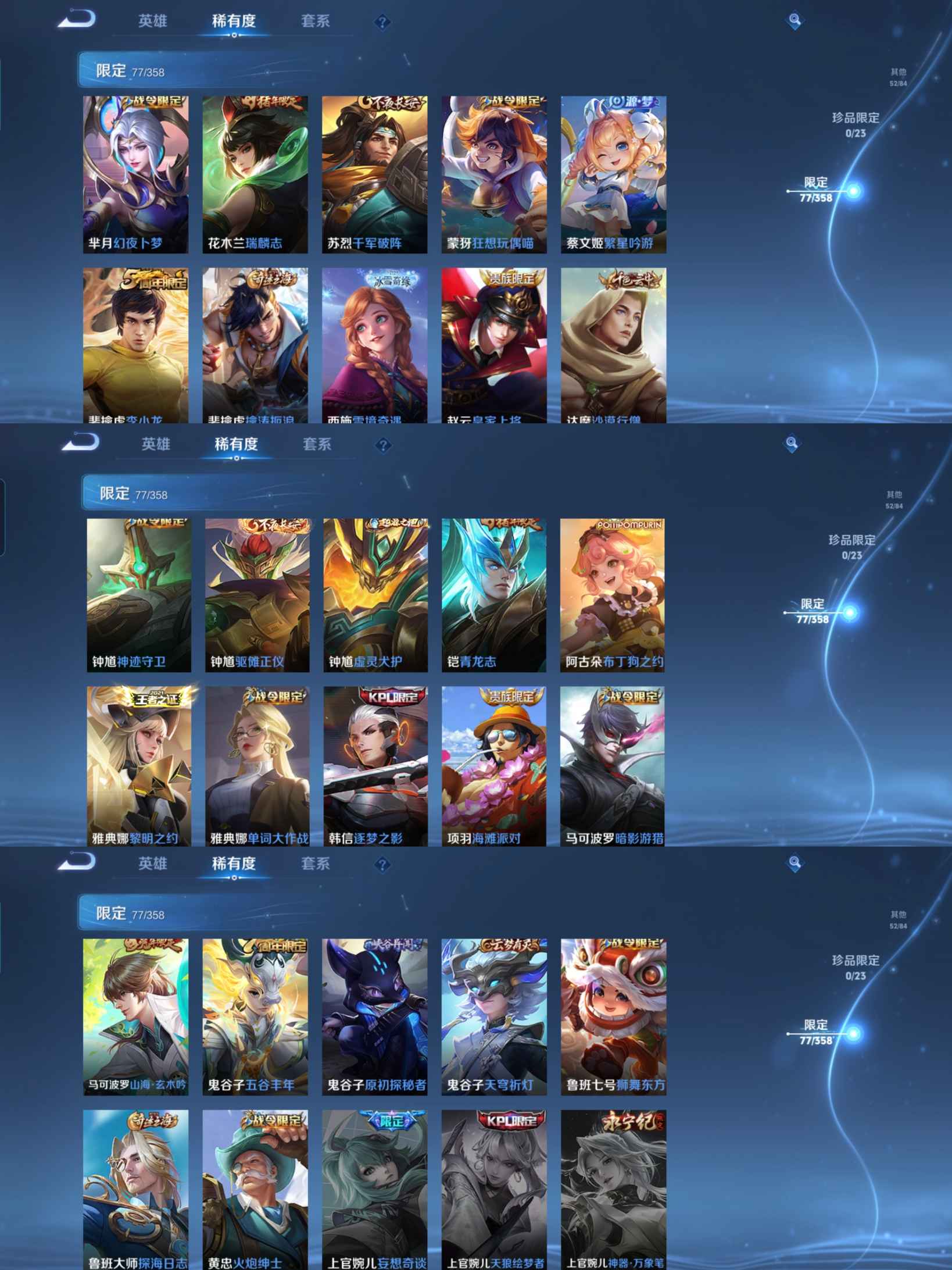 贵族等级:v7皮肤数:243传说品质13 情人节限定1 生肖限定5 荣耀典藏1 英雄数:126