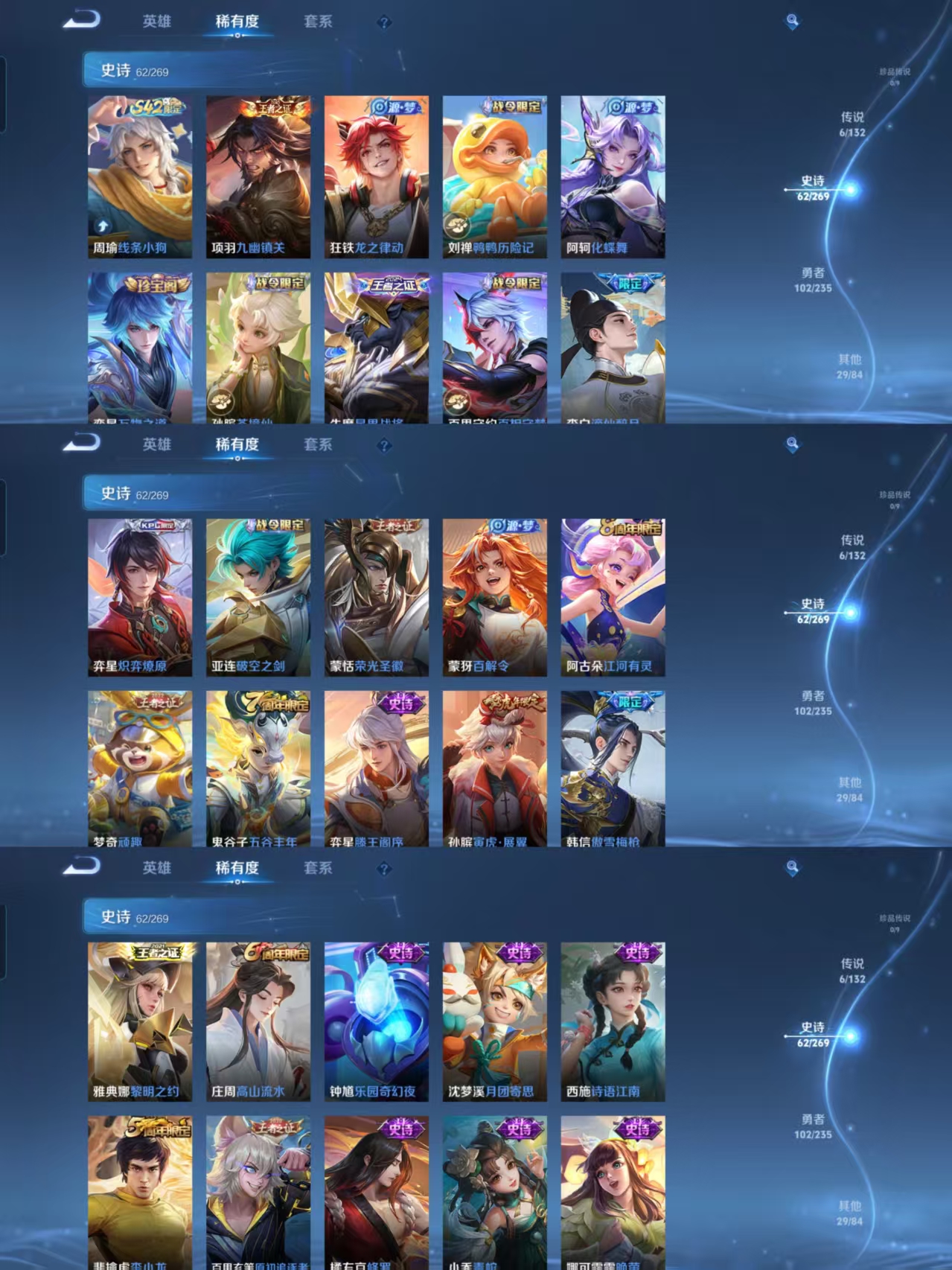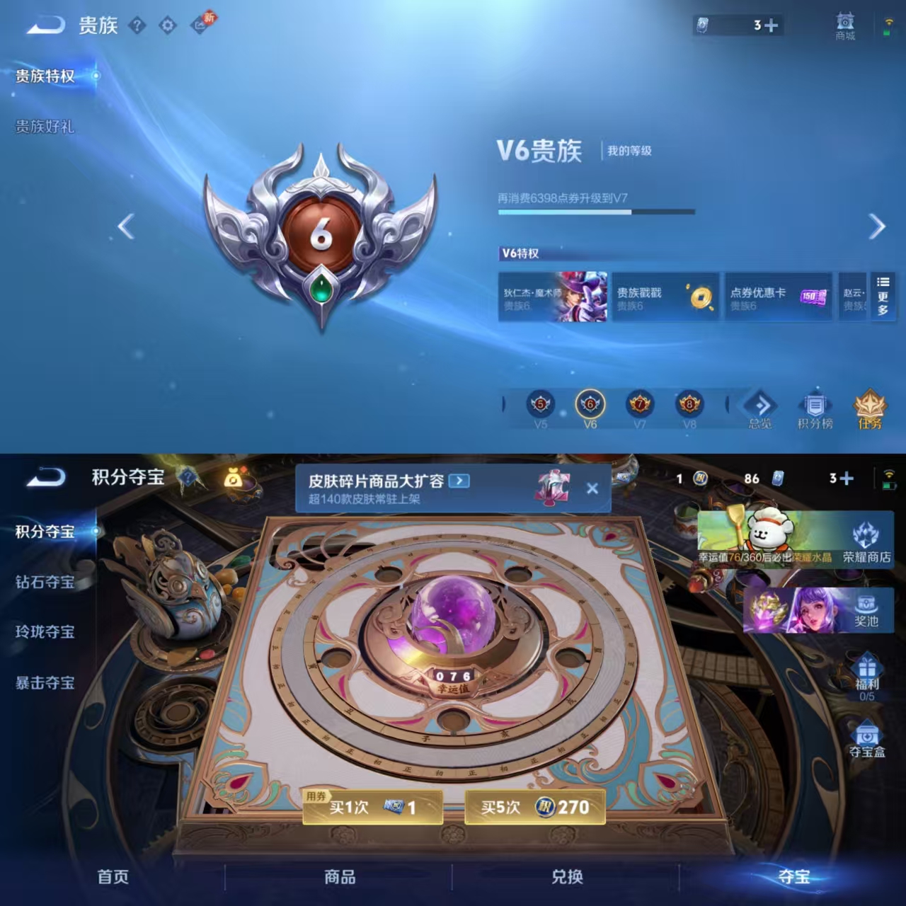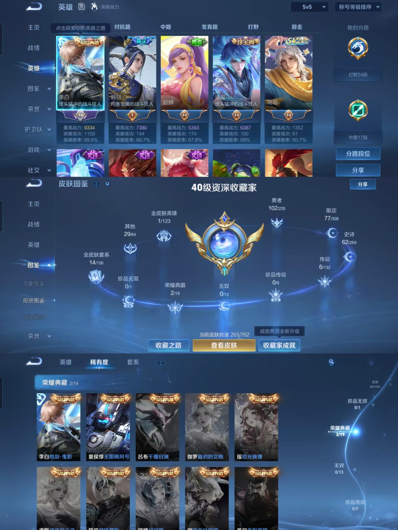 贵族等级:v6皮肤数:201传说品质6 荣耀典藏2 生肖限定1 英雄数:126