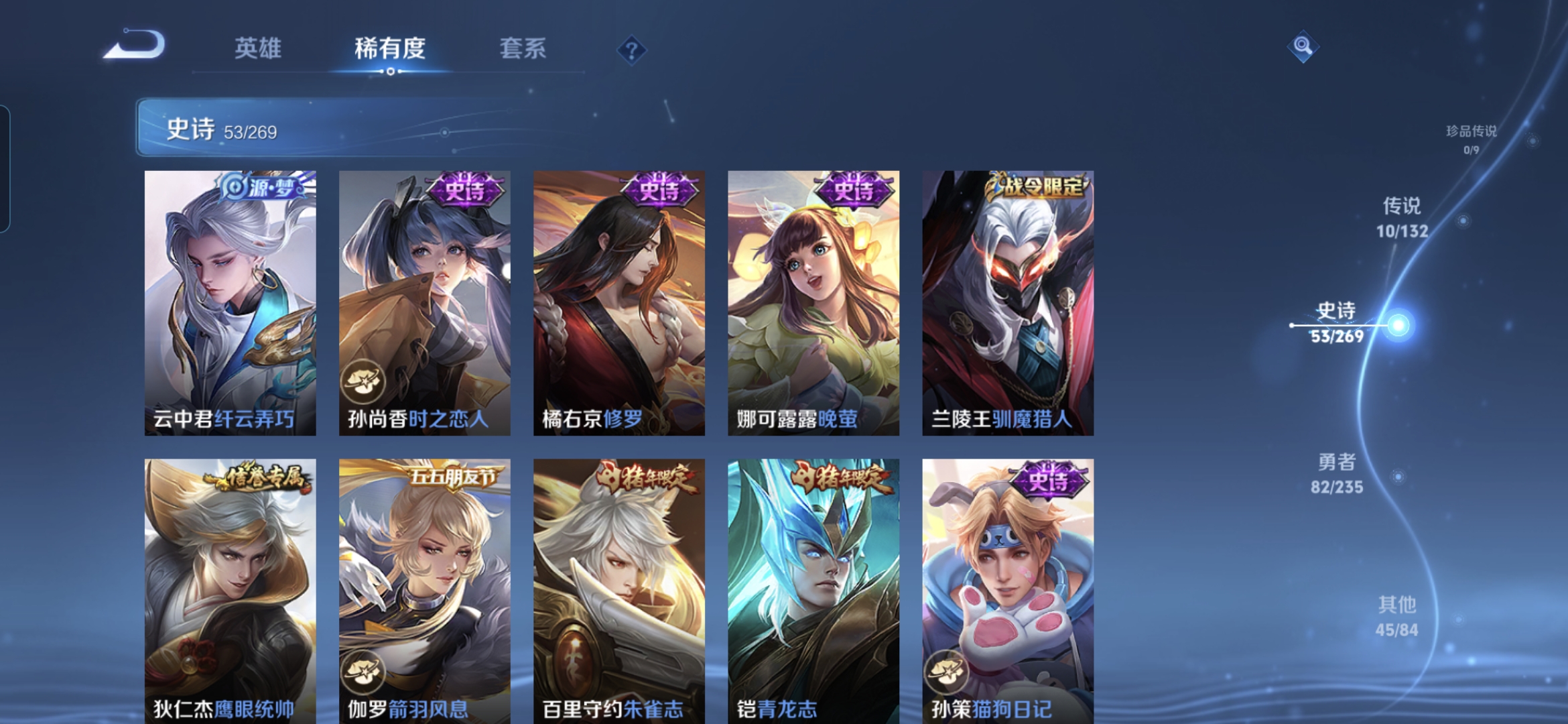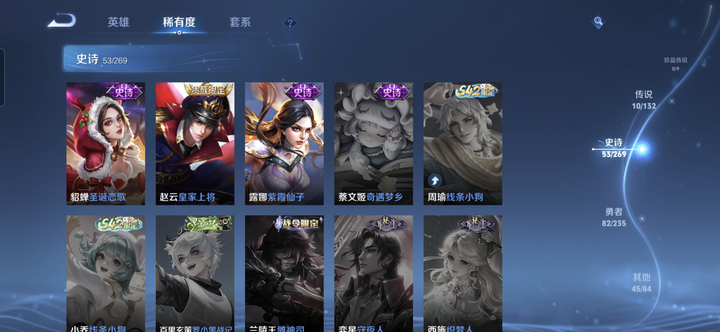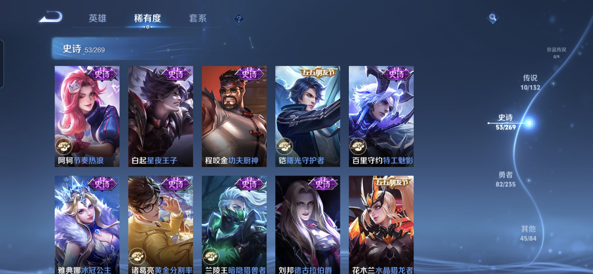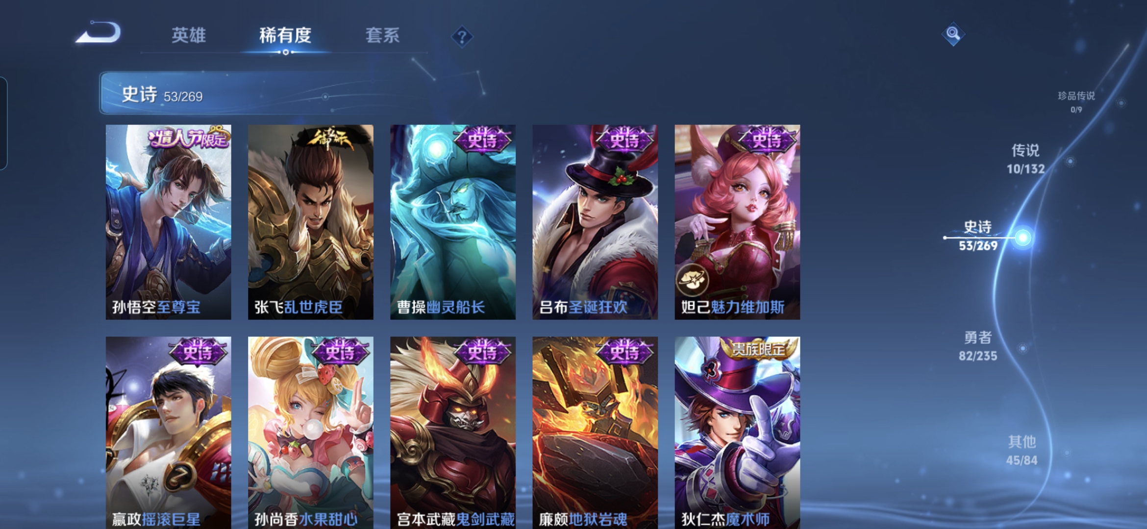贵族等级:v8皮肤数:191传说品质10 情人节限定1 荣耀典藏1 生肖限定2 英雄数:126