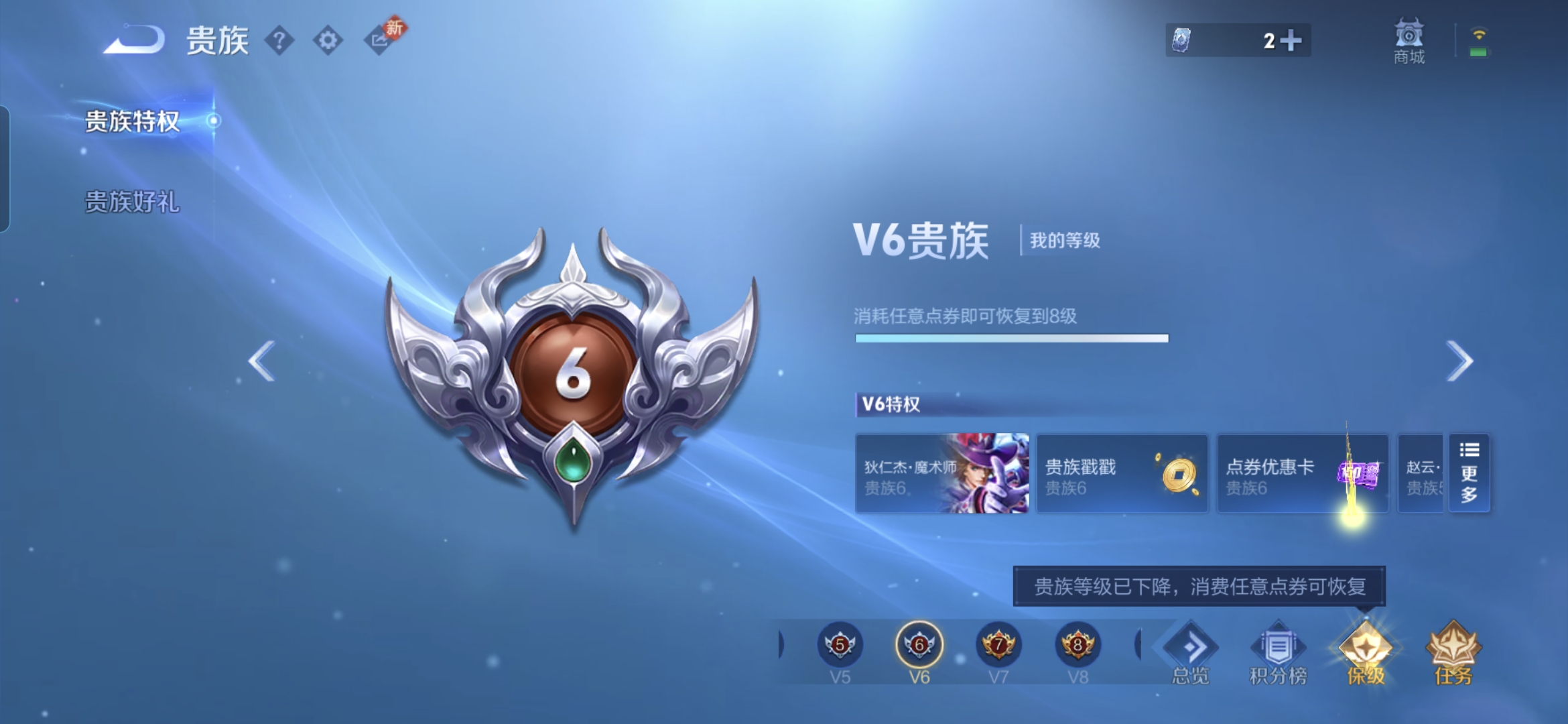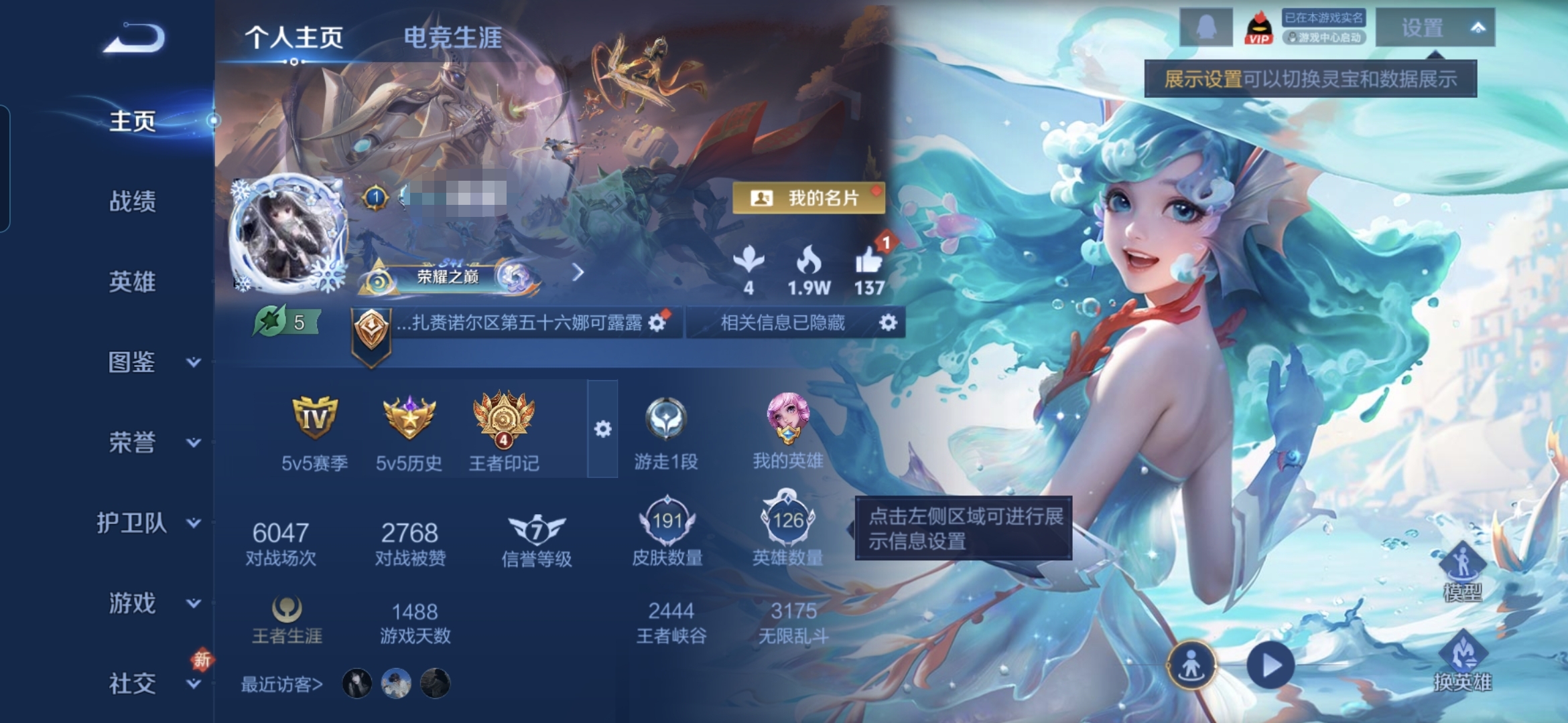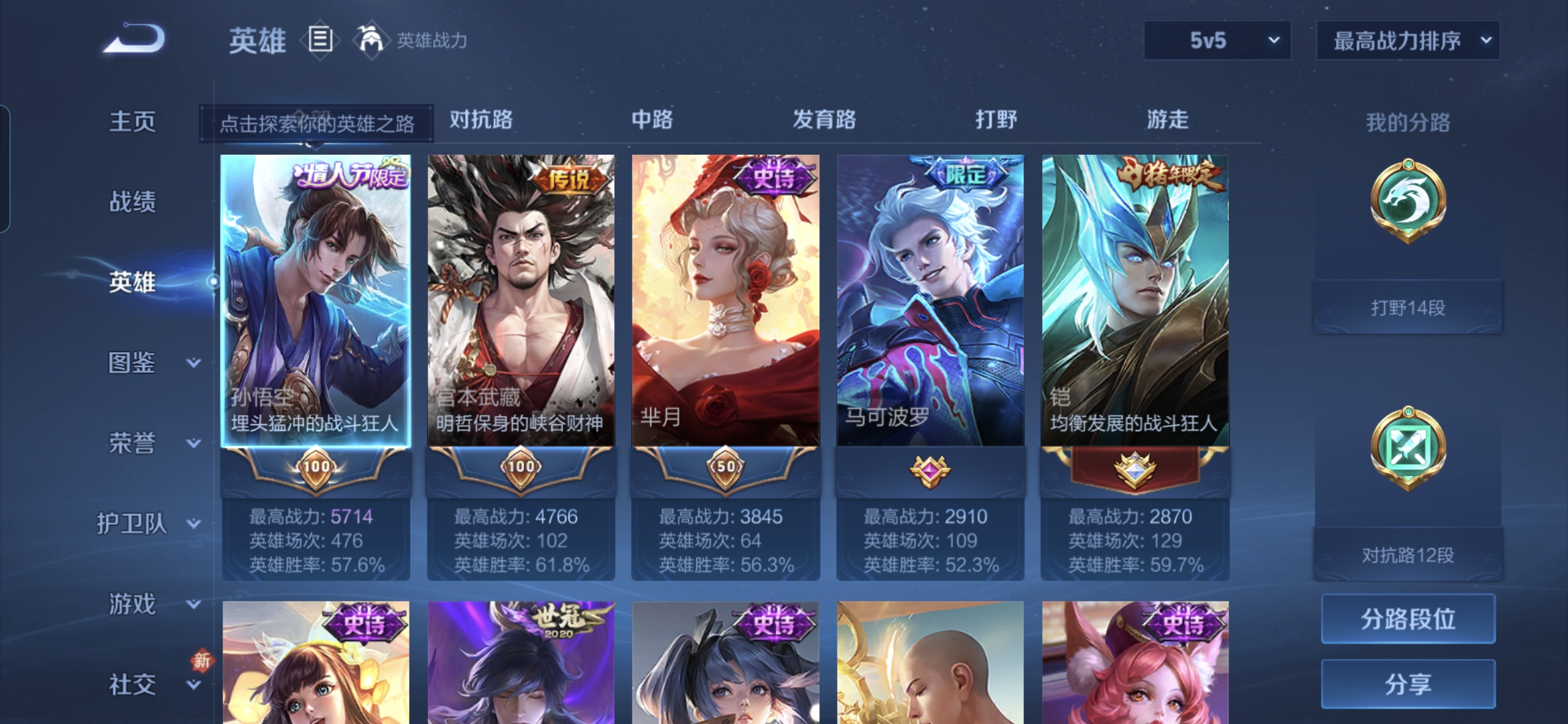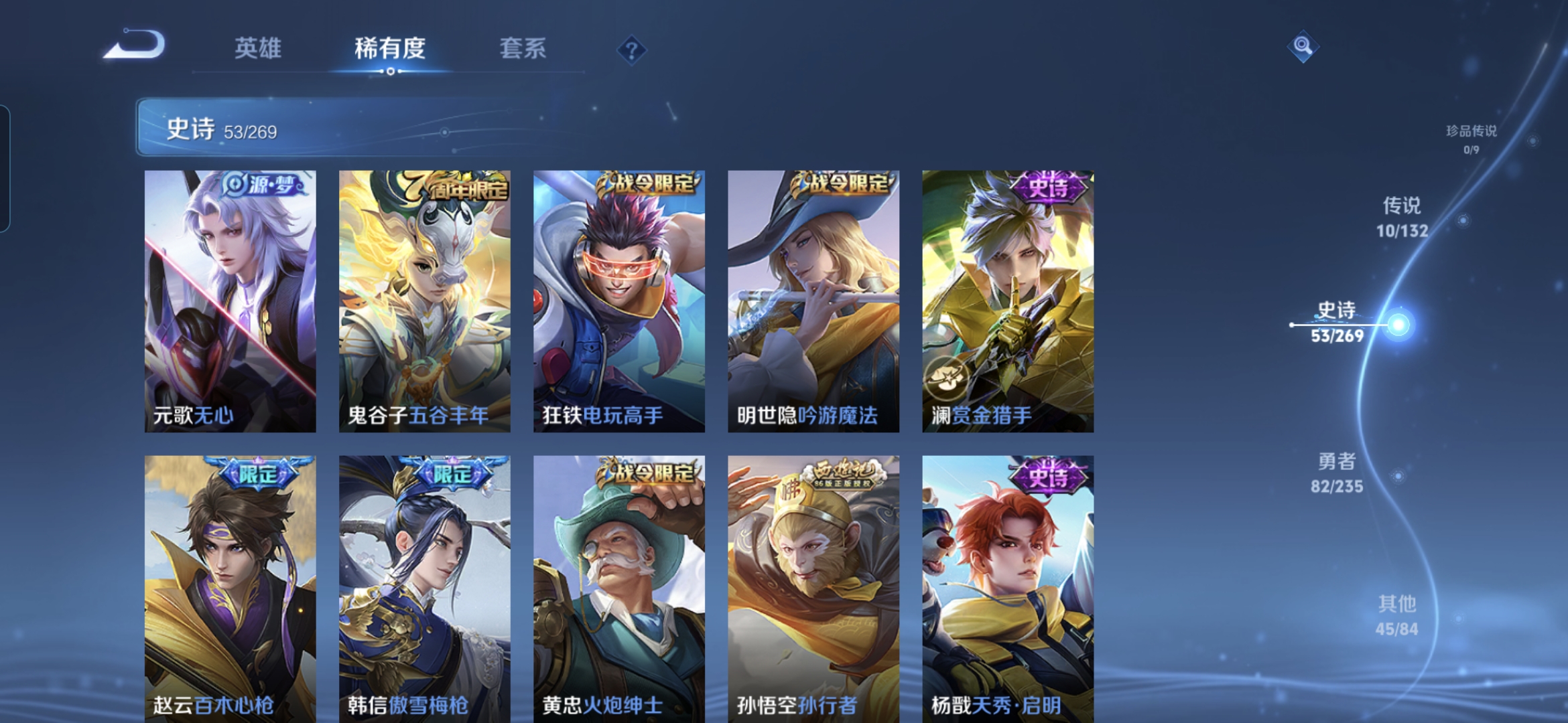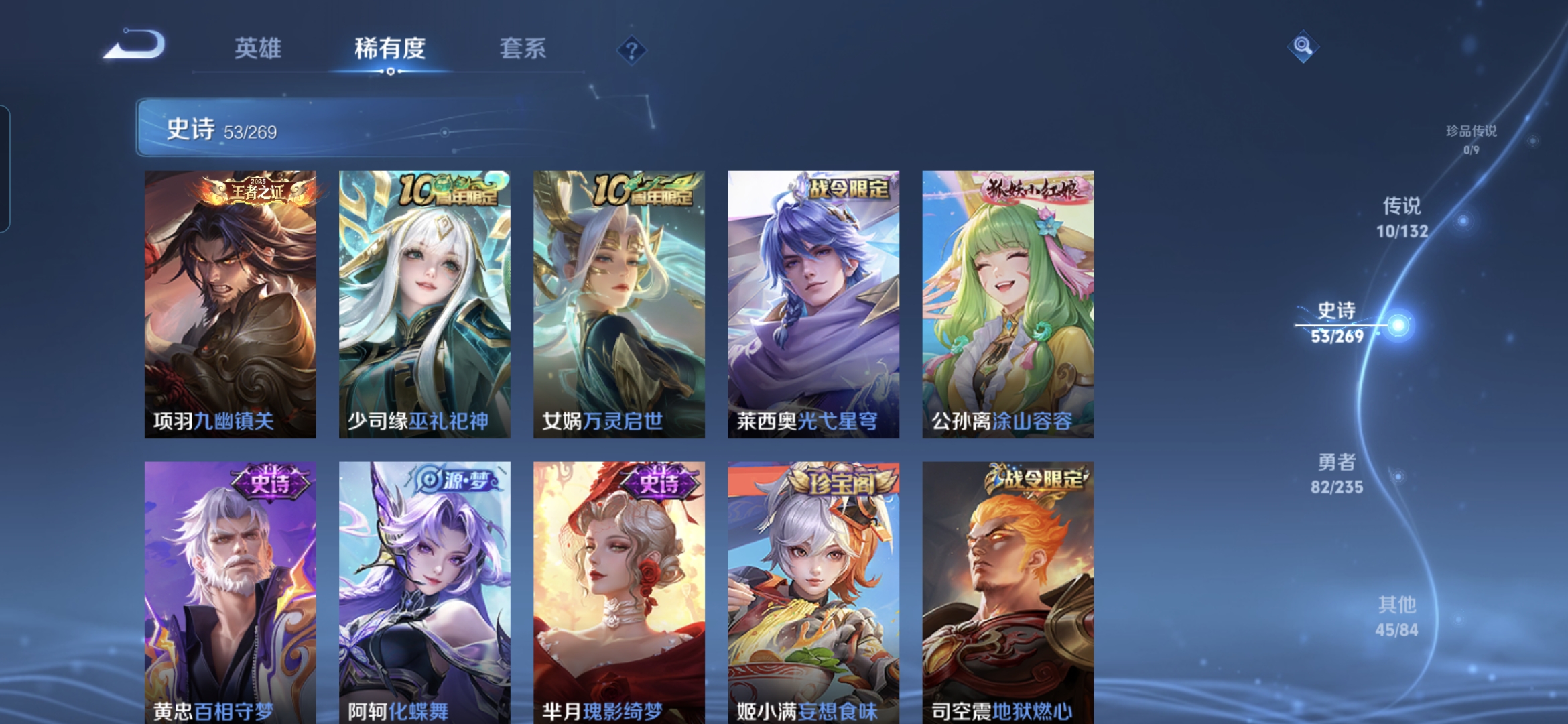 贵族等级:v8皮肤数:191传说品质10 情人节限定1 荣耀典藏1 生肖限定2 英雄数:126