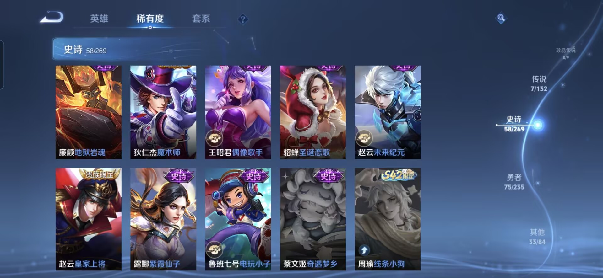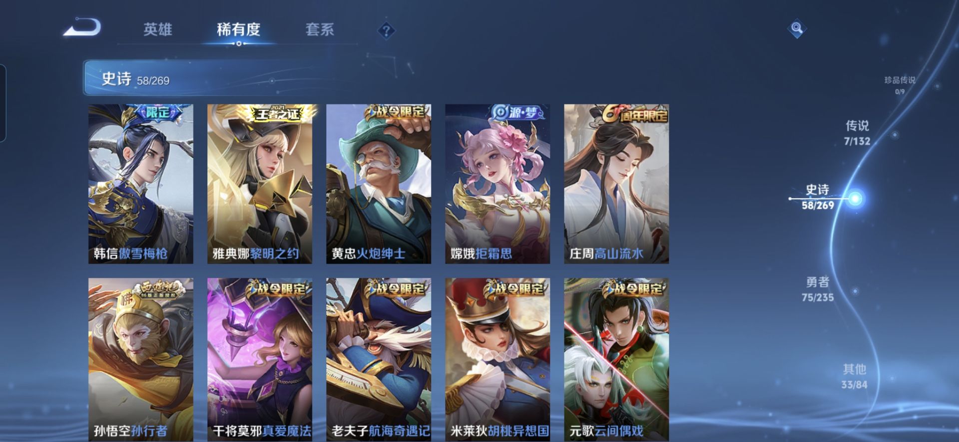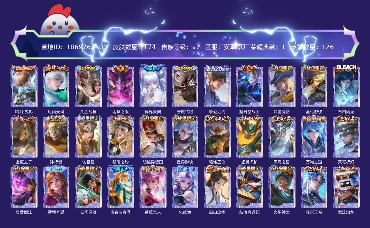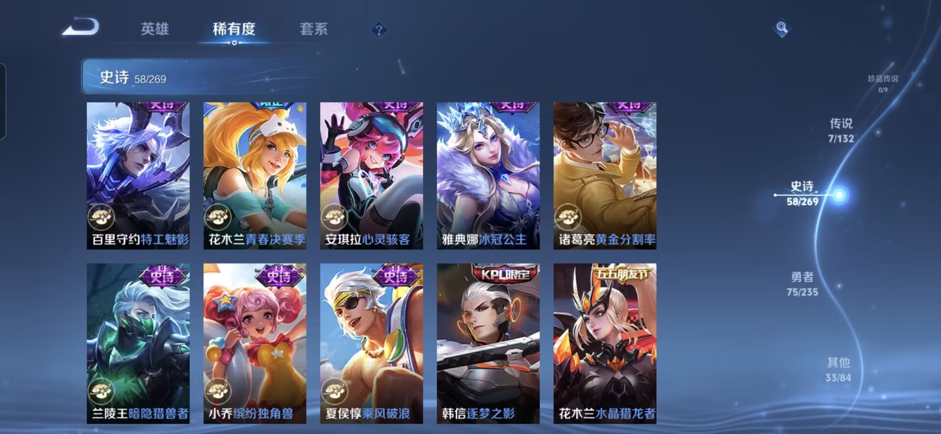 贵族等级:v7皮肤数:174传说品质7 生肖限定2 荣耀典藏1 英雄数:126