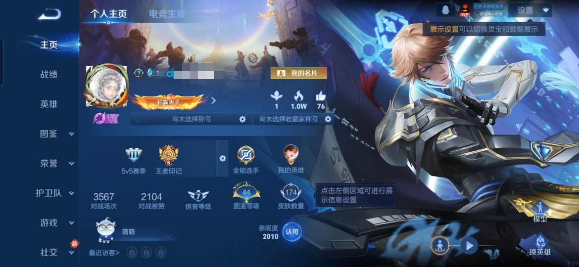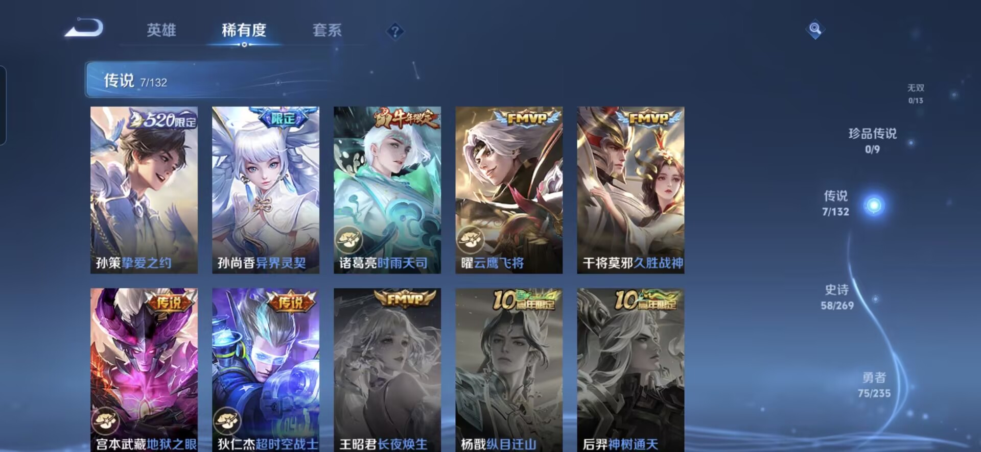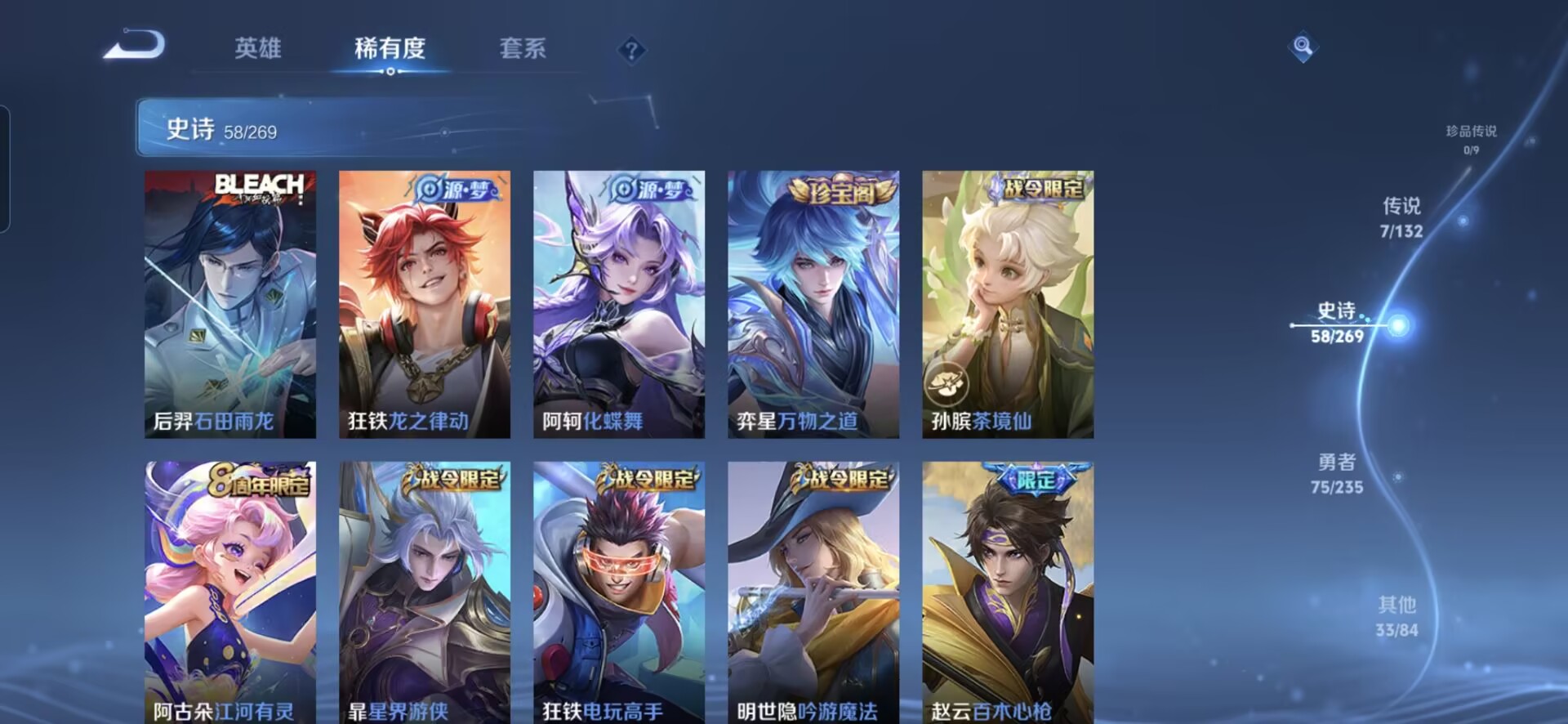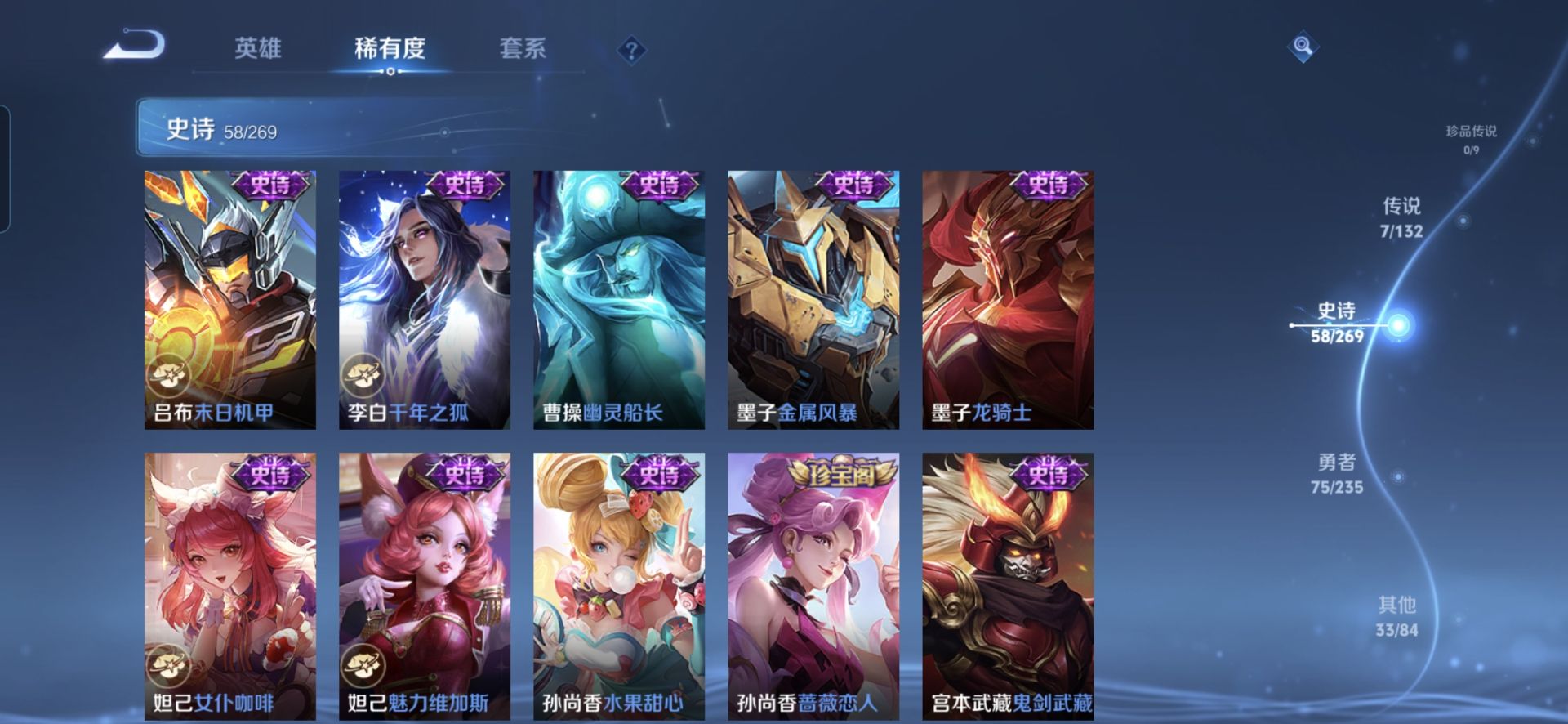 贵族等级:v7皮肤数:174传说品质7 生肖限定2 荣耀典藏1 英雄数:126