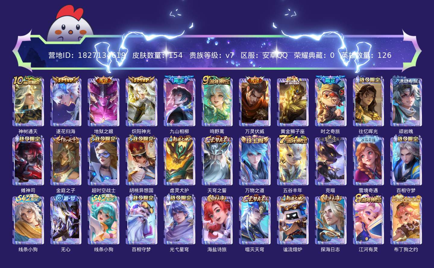 贵族等级:v7皮肤数:156传说品质9 生肖限定1 英雄数:126
