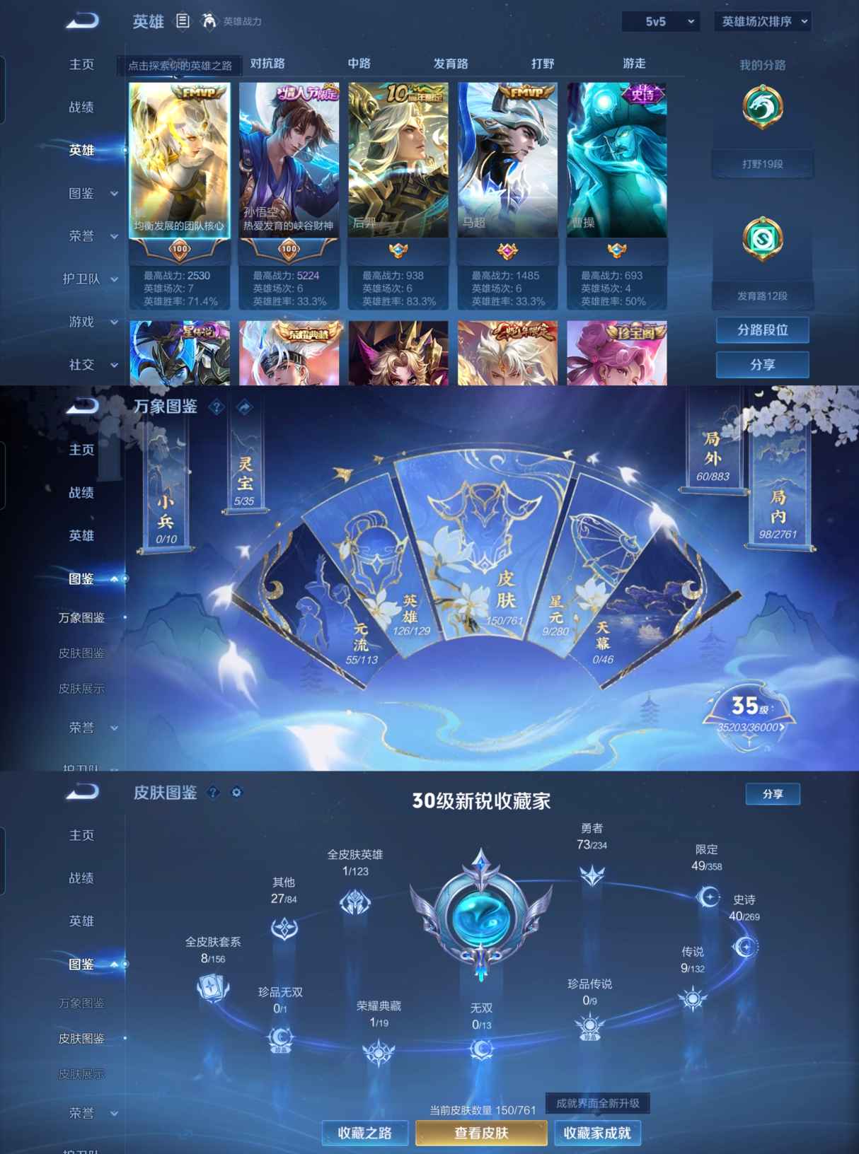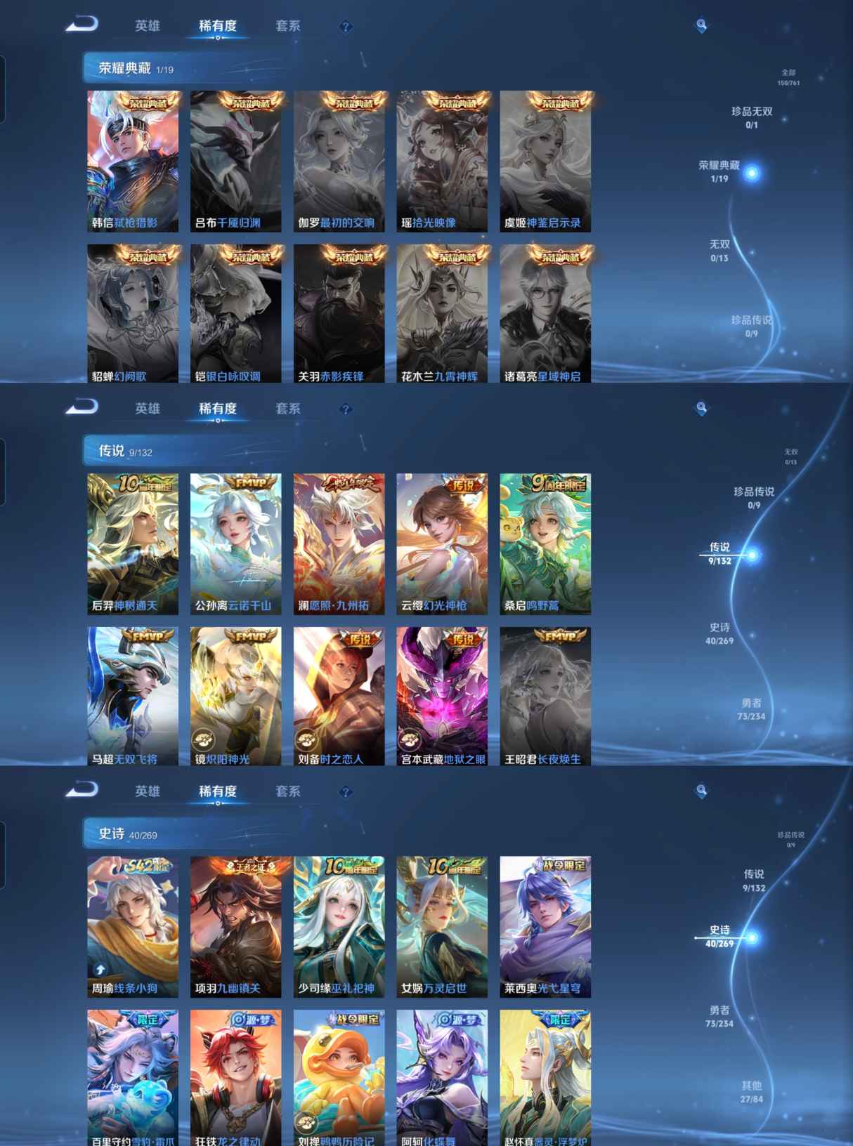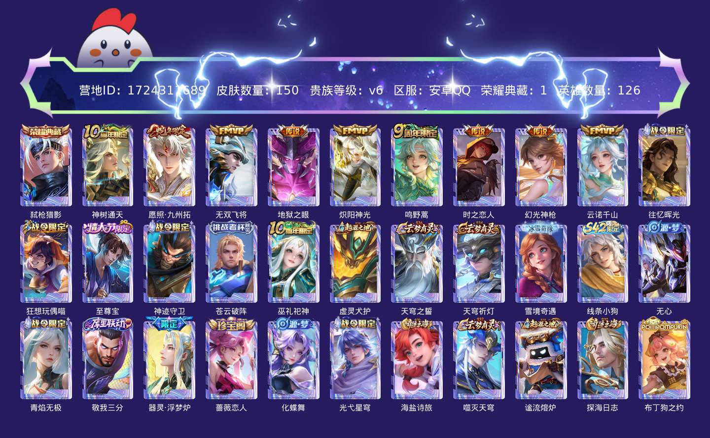 贵族等级:v6皮肤数:150传说品质9 生肖限定1 情人节限定1 荣耀典藏1 英雄数:126