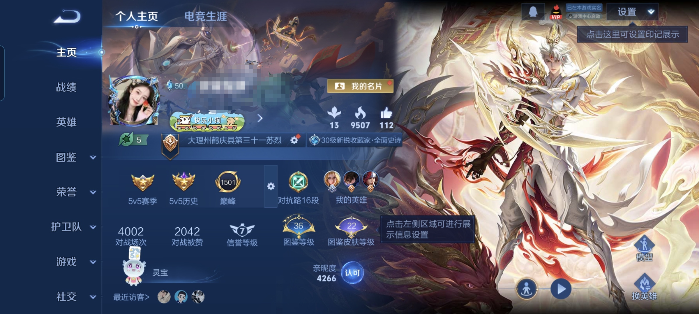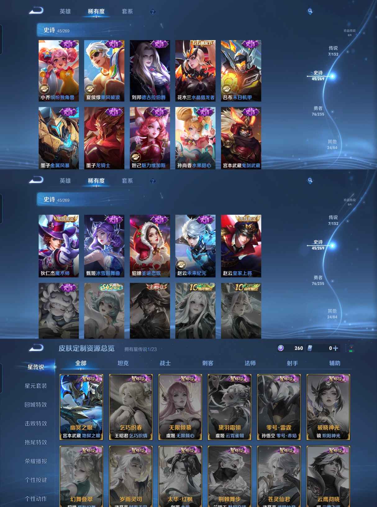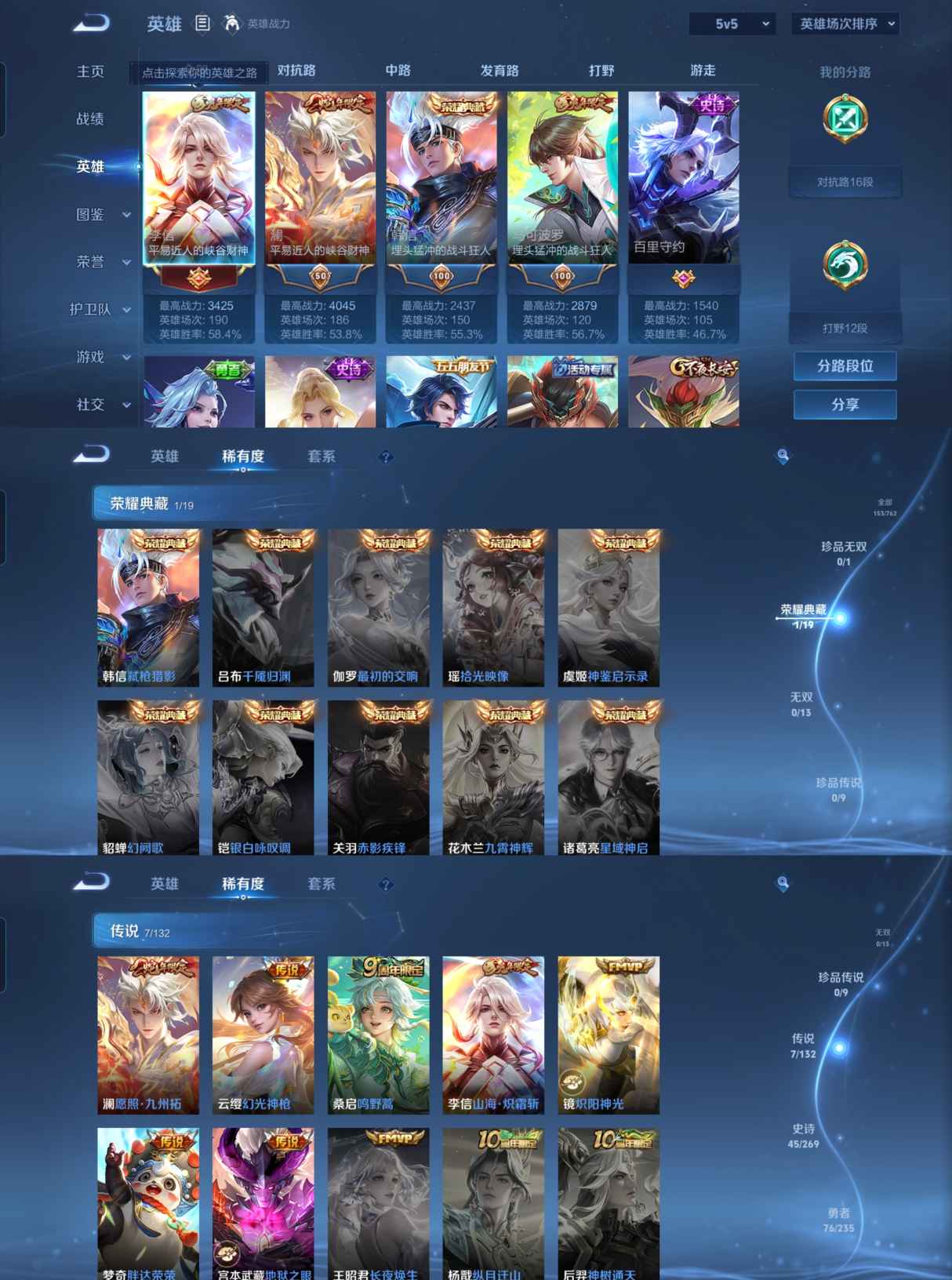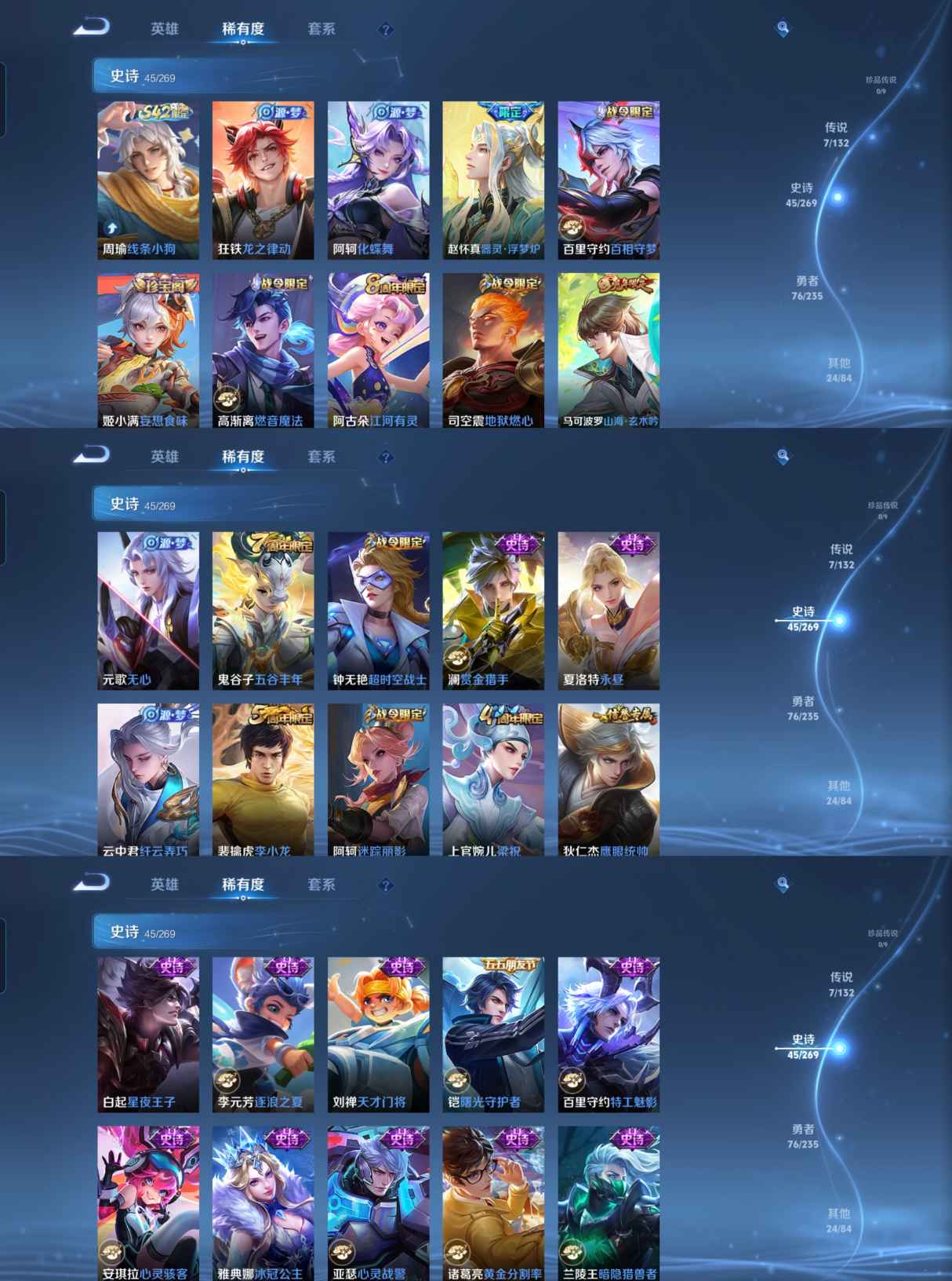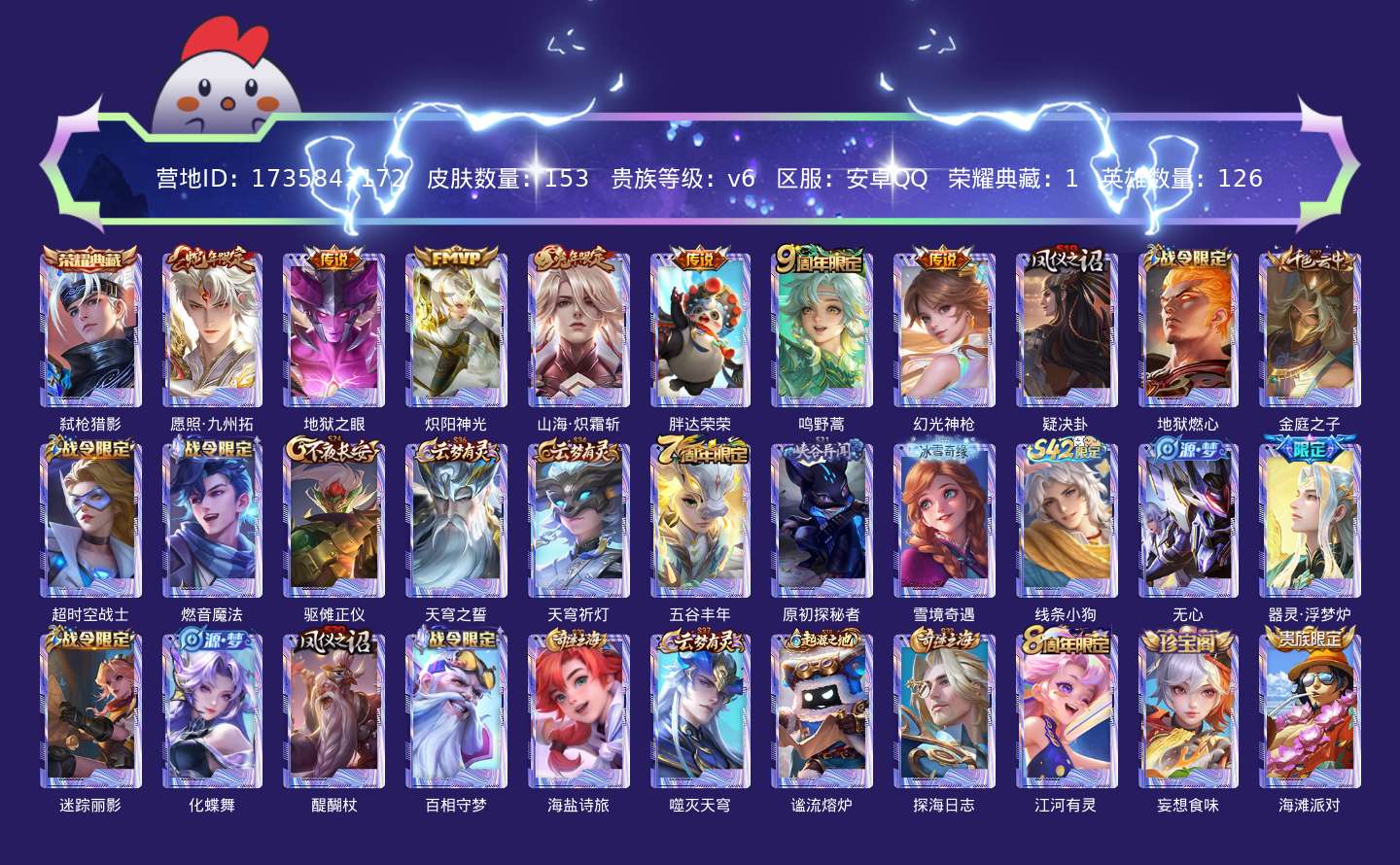 贵族等级:v6皮肤数:153传说品质7 生肖限定3 荣耀典藏1 英雄数:126