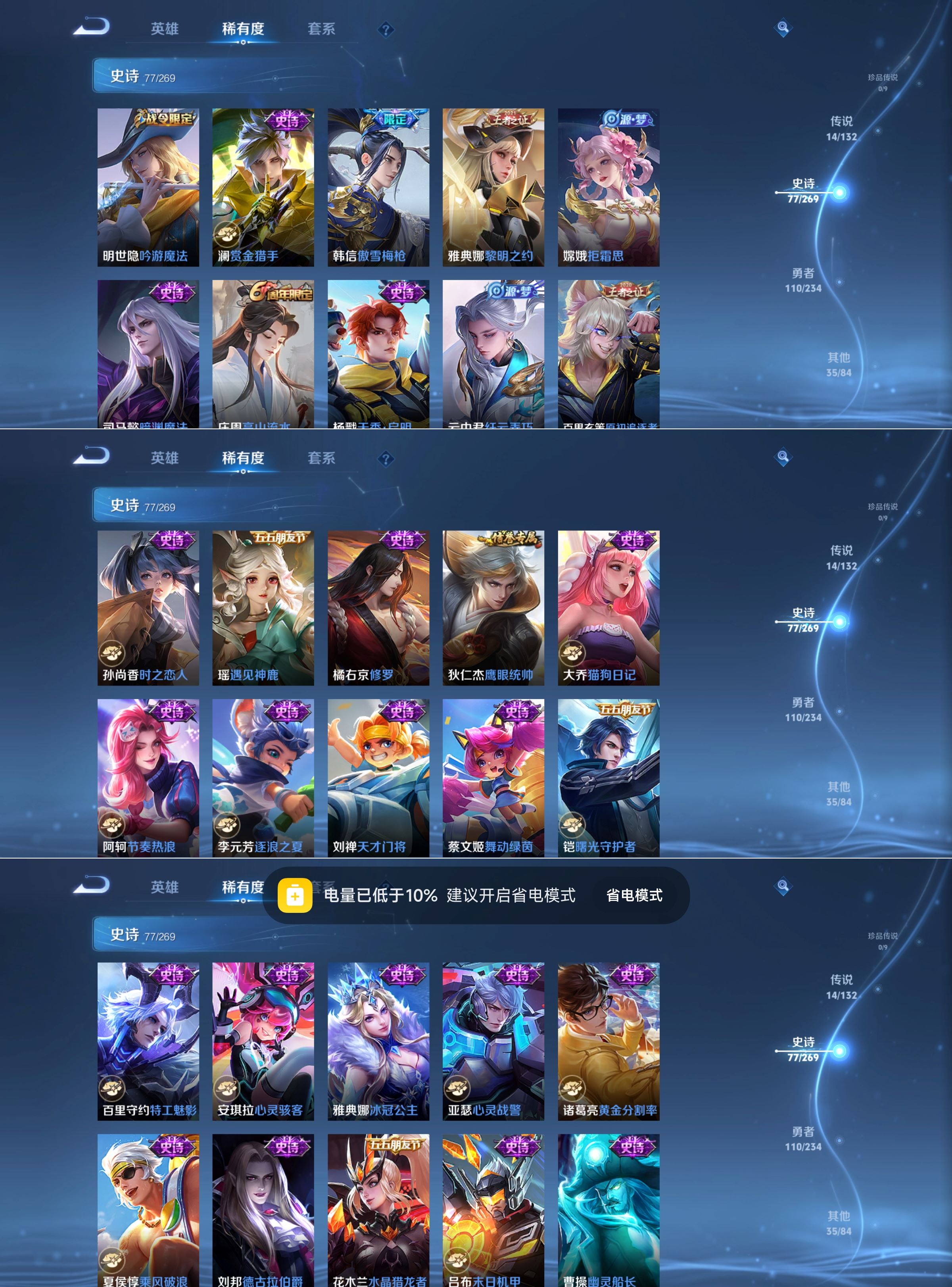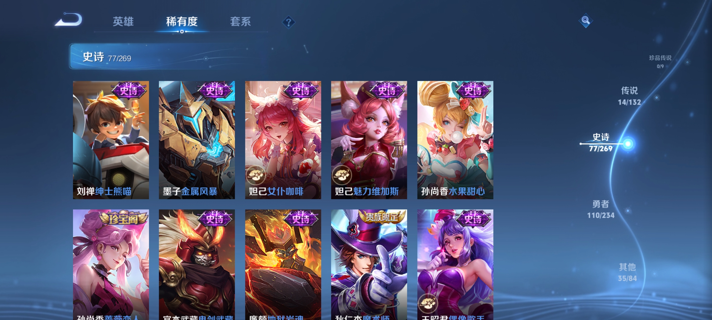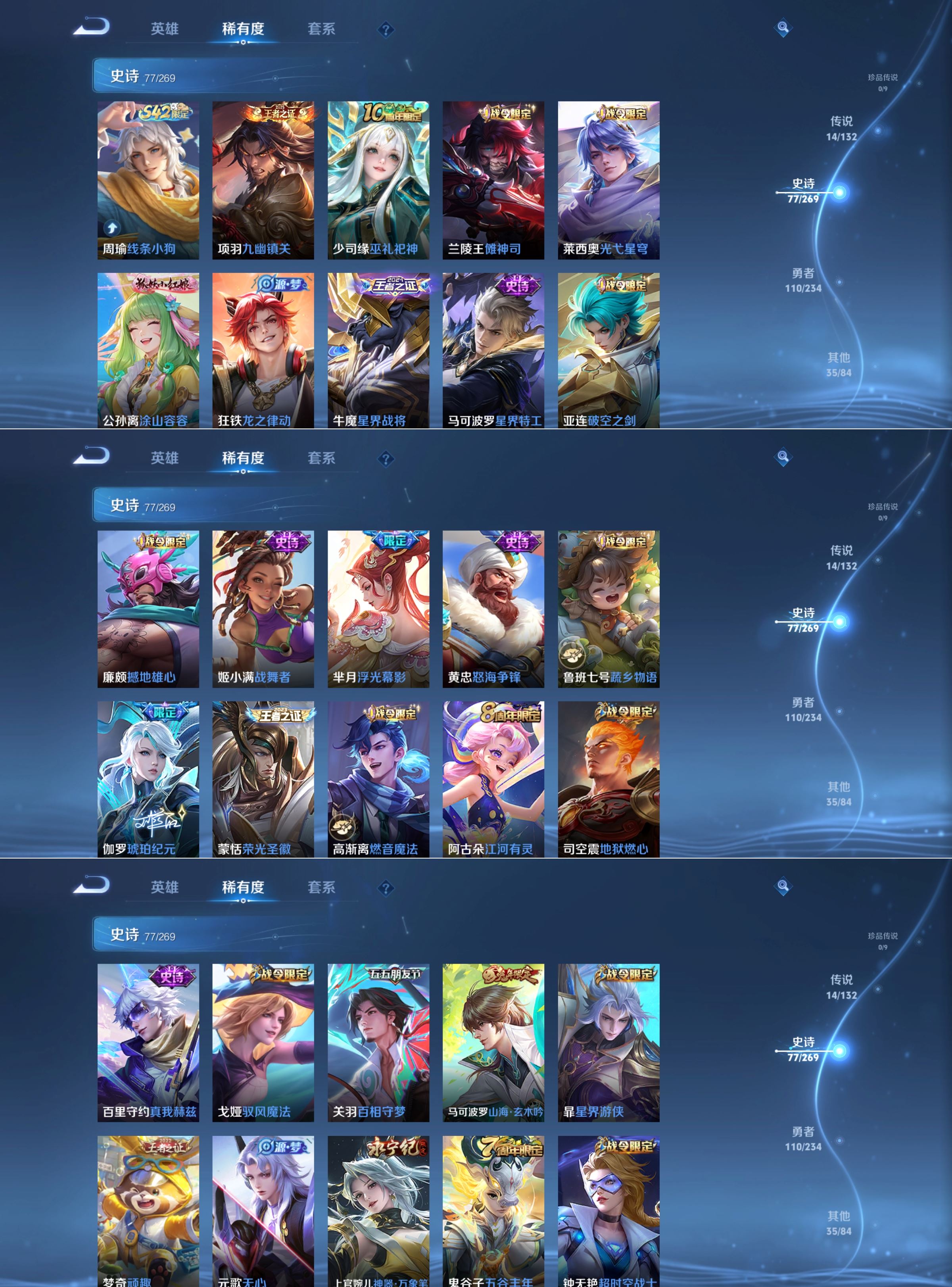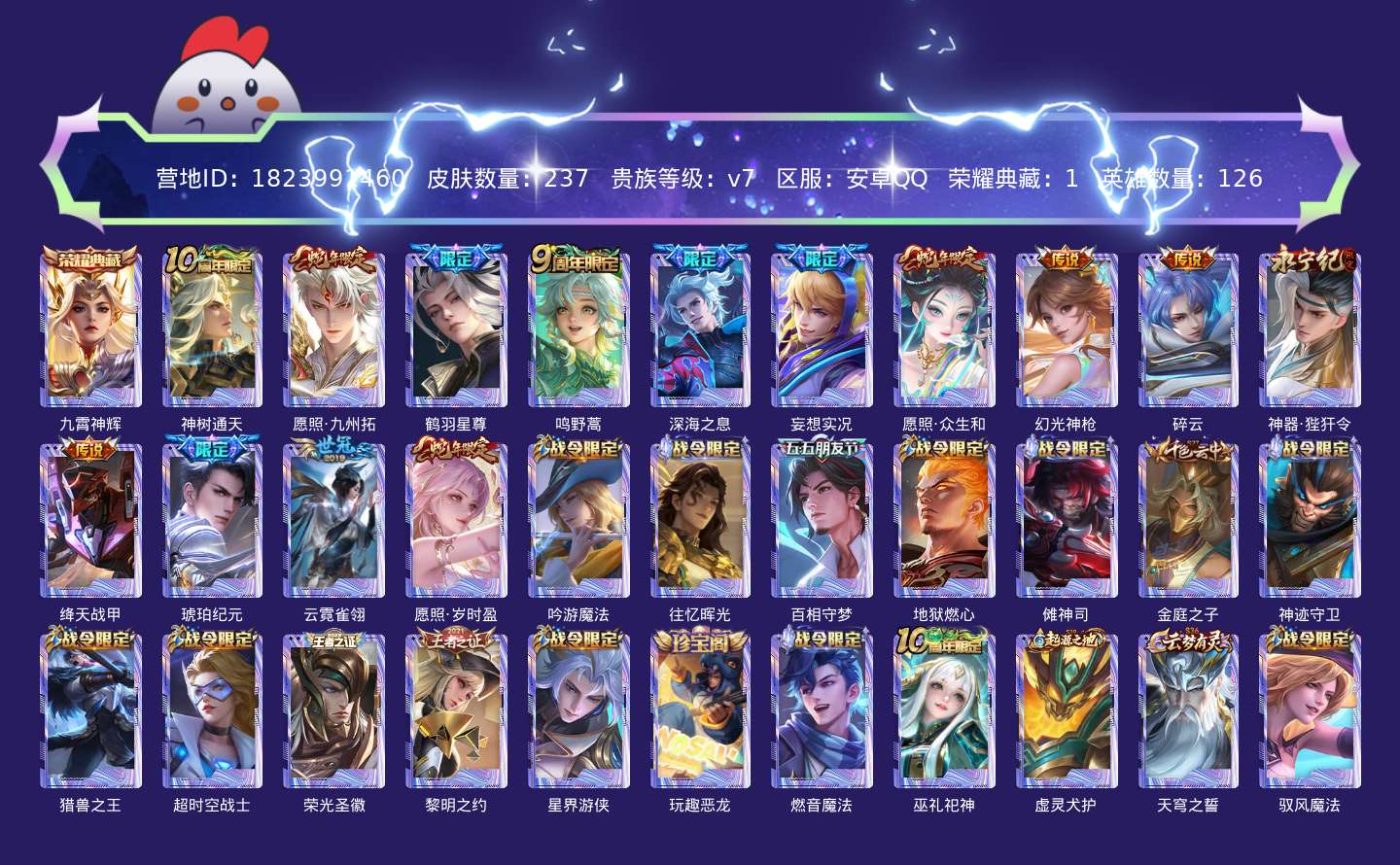 贵族等级:v7皮肤数:237传说品质14 生肖限定4 荣耀典藏1 英雄数:126