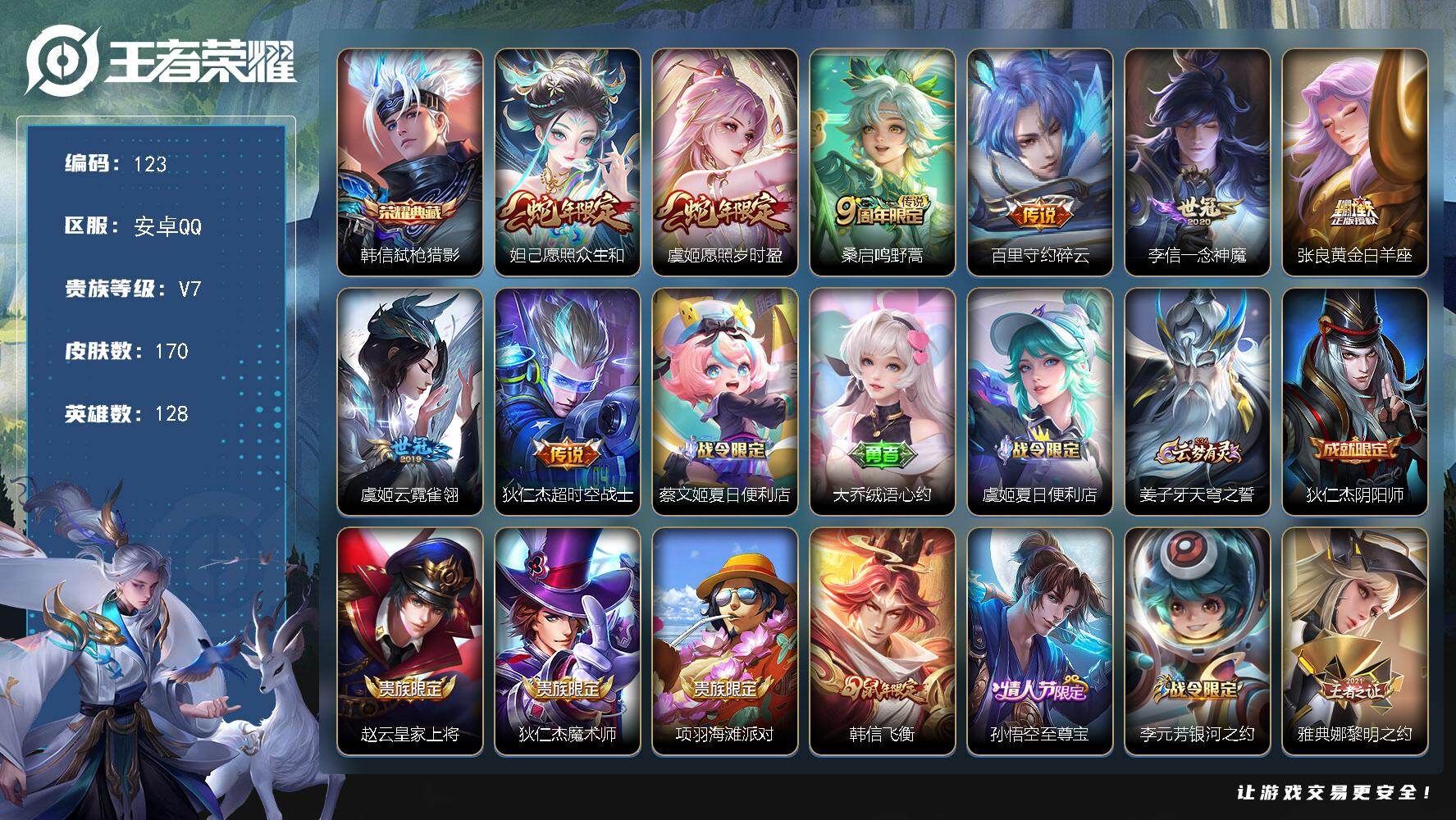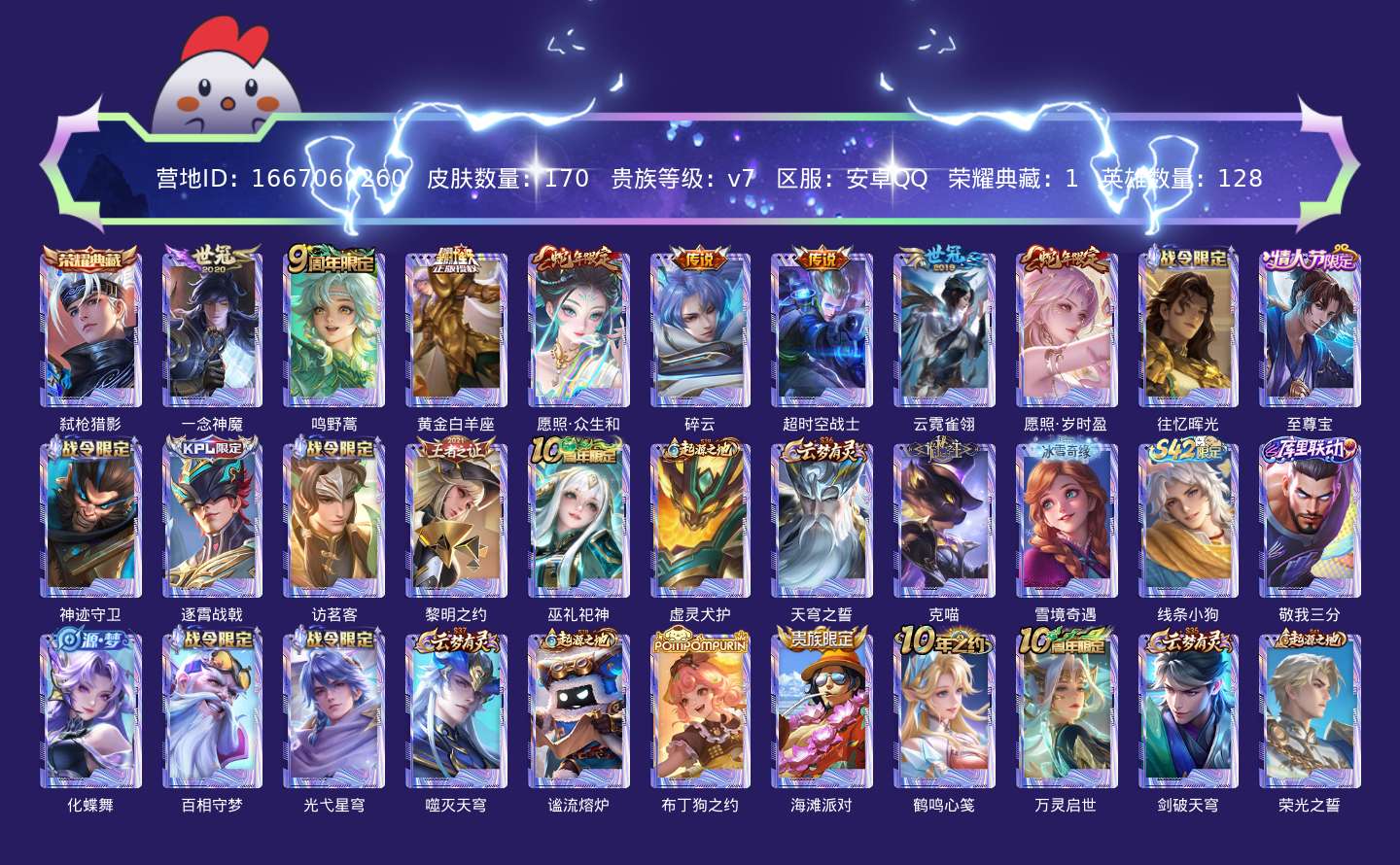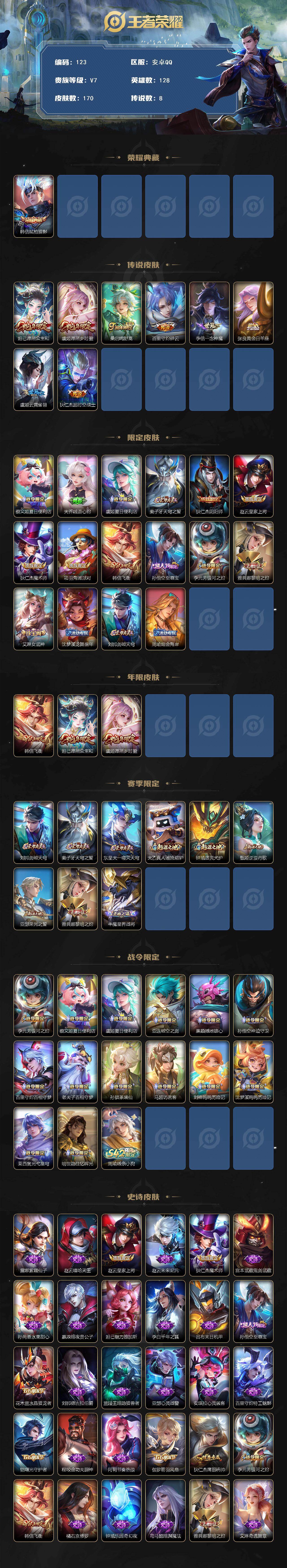 贵族等级:v7皮肤数:170情人节限定1 传说品质8 生肖限定3 荣耀典藏1 英雄数:128
